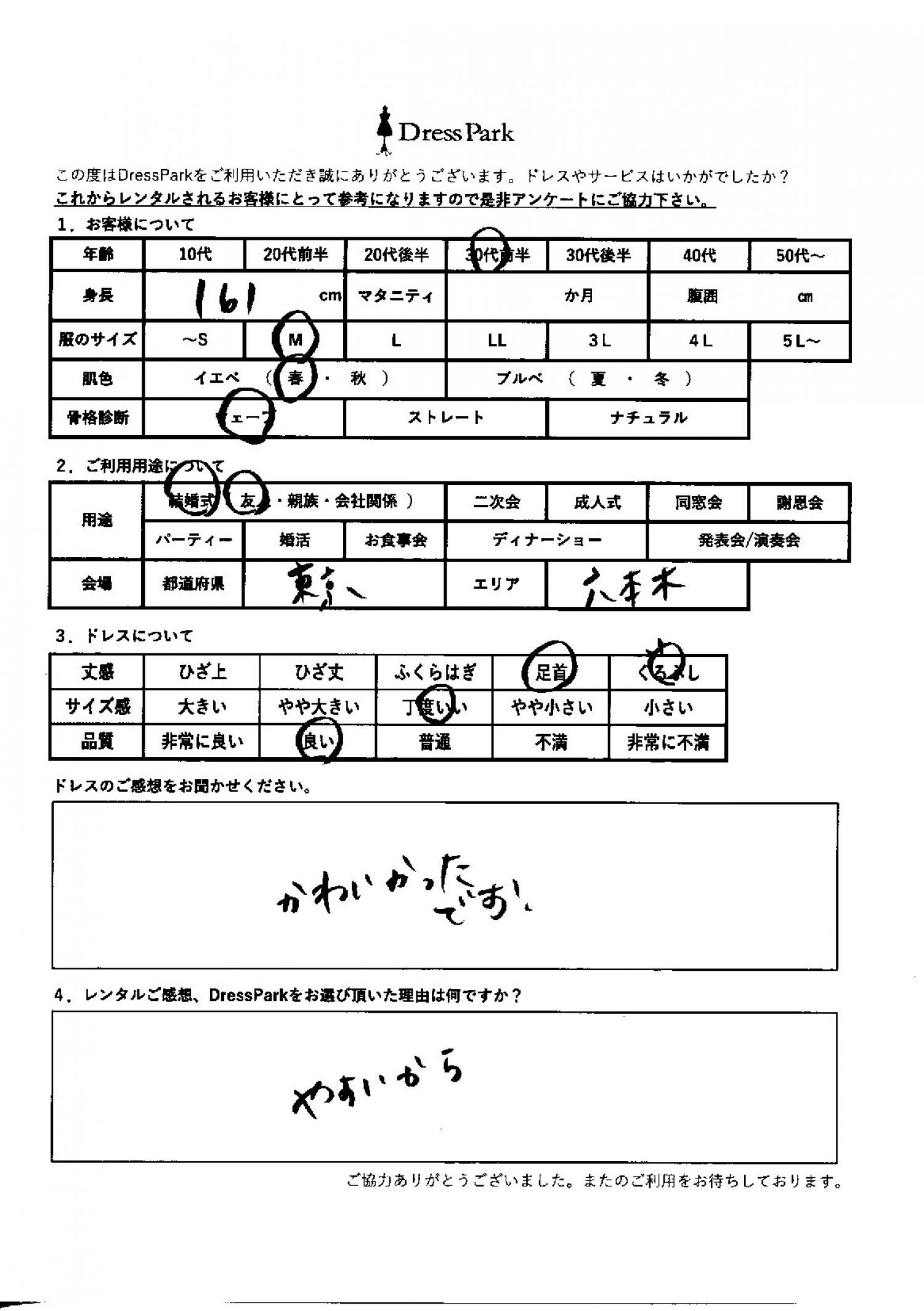 東京都 T.T様161㎝ Mサイズ六本木・麻布 #30代#M/L#160~164㎝#結婚式(友人)#東京都#六本木・麻布 ◆レンタルしたドレスはこちら ◆レンタルしたサイズは:M ◆レンタルした日付:2026/02/07 ドレスの着用感 ◆点数: (4点) ◆丈感:足首 ◆サイズ感:丁度いい ◆品質:良い ◆肌色:イエベ ◆骨格診断:ウェーブ ドレスの感想 可愛いかったです! レンタルのご感想、DressParkをお選び頂いた理由 安いから CUSTOMER REVIEWS お客様の声 気になるカテゴリー別にご利用の感想をチェック! ◆AGE 年代で見る 10代 20代 30代 40代 50代~ ◆SIZE サイズで見る SS/S M/L 大きいサイズLL~ ◆HIGHT 身長で見る 140~149㎝ 150~154㎝ 155~159㎝ 160~164㎝ 165~169㎝ 170㎝以上 ◆マタニティ ~3か月 4~6か月 7~8か月 9~10か月 ◆肌色 イエベ ブルべ ◆骨格診断 ウェーブ ストレート ナチュラル ◆利用シーン 結婚式(友人) 結婚式(親族) 結婚式(会社関係) 二次会 成人式/同窓会 謝恩会 パーティー その他 CUSTOMER REVIEWS都道府県別お客様の声 都道府県別にのお客様の声をチェック! 北海道 青森県 岩手県 宮城県 秋田県 山形県 福島県 茨城県 栃木県 群馬県 埼玉県 千葉県 東京都 神奈川県 新潟県 富山県 石川県 福井県 山梨県 長野県 岐阜県 静岡県 愛知県 三重県 滋賀県 京都府 大阪府 兵庫県 奈良県 和歌山県 鳥取県 島根県 岡山県 広島県 山口県 徳島県 香川県 愛媛県 高知県 福岡県 佐賀県 長崎県 熊本県 大分県 宮崎県 鹿児島県 沖縄県 CUSTOMER REVIEWSエリア別お客様の声 都道府県別にのお客様の声をチェック! 札幌 仙台 名古屋 軽井沢 金沢 神戸・芦屋 博多 那覇 梅田・新大阪 難波・心斎橋 鎌倉・湘南 横浜・みなとみらい 舞浜・浦安・幕張 大宮・浦和 青山・表参道 六本木・麻布 渋谷・恵比寿 新宿 池袋 銀座・丸の内 お台場・汐留 鹿児島市 郡山市 福島市 東予 甲府・石和 LINEでお問い合わせ このサイトではJavaScriptを使用しています