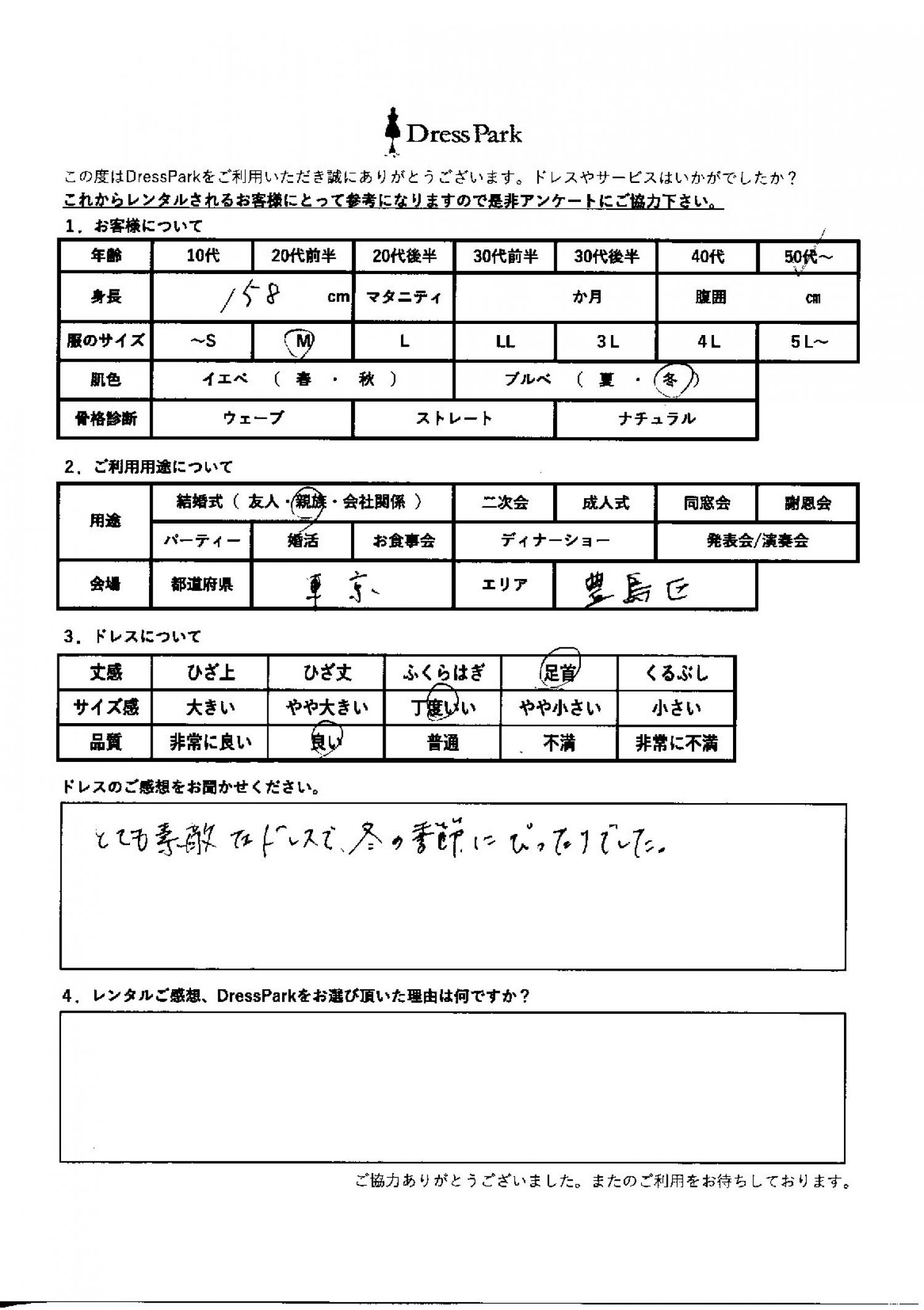 東京都 K.K様158㎝ Mサイズ池袋 #50代~#M/L#155~159㎝#結婚式(親族)#東京都#池袋 ◆レンタルしたドレスはこちら ◆レンタルしたサイズは:M ◆レンタルした日付:2026/02/08 ドレスの着用感 ◆点数: (4点) ◆丈感:足首 ◆サイズ感:丁度いい ◆品質:良い ◆肌色:ブルべ ドレスの感想 とても素敵なドレスで冬の季節にぴったりでした。 CUSTOMER REVIEWS お客様の声 気になるカテゴリー別にご利用の感想をチェック! ◆AGE 年代で見る 10代 20代 30代 40代 50代~ ◆SIZE サイズで見る SS/S M/L 大きいサイズLL~ ◆HIGHT 身長で見る 140~149㎝ 150~154㎝ 155~159㎝ 160~164㎝ 165~169㎝ 170㎝以上 ◆マタニティ ~3か月 4~6か月 7~8か月 9~10か月 ◆肌色 イエベ ブルべ ◆骨格診断 ウェーブ ストレート ナチュラル ◆利用シーン 結婚式(友人) 結婚式(親族) 結婚式(会社関係) 二次会 成人式/同窓会 謝恩会 パーティー その他 CUSTOMER REVIEWS都道府県別お客様の声 都道府県別にのお客様の声をチェック! 北海道 青森県 岩手県 宮城県 秋田県 山形県 福島県 茨城県 栃木県 群馬県 埼玉県 千葉県 東京都 神奈川県 新潟県 富山県 石川県 福井県 山梨県 長野県 岐阜県 静岡県 愛知県 三重県 滋賀県 京都府 大阪府 兵庫県 奈良県 和歌山県 鳥取県 島根県 岡山県 広島県 山口県 徳島県 香川県 愛媛県 高知県 福岡県 佐賀県 長崎県 熊本県 大分県 宮崎県 鹿児島県 沖縄県 CUSTOMER REVIEWSエリア別お客様の声 都道府県別にのお客様の声をチェック! 札幌 仙台 名古屋 軽井沢 金沢 神戸・芦屋 博多 那覇 梅田・新大阪 難波・心斎橋 鎌倉・湘南 横浜・みなとみらい 舞浜・浦安・幕張 大宮・浦和 青山・表参道 六本木・麻布 渋谷・恵比寿 新宿 池袋 銀座・丸の内 お台場・汐留 鹿児島市 郡山市 福島市 東予 甲府・石和 LINEでお問い合わせ このサイトではJavaScriptを使用しています