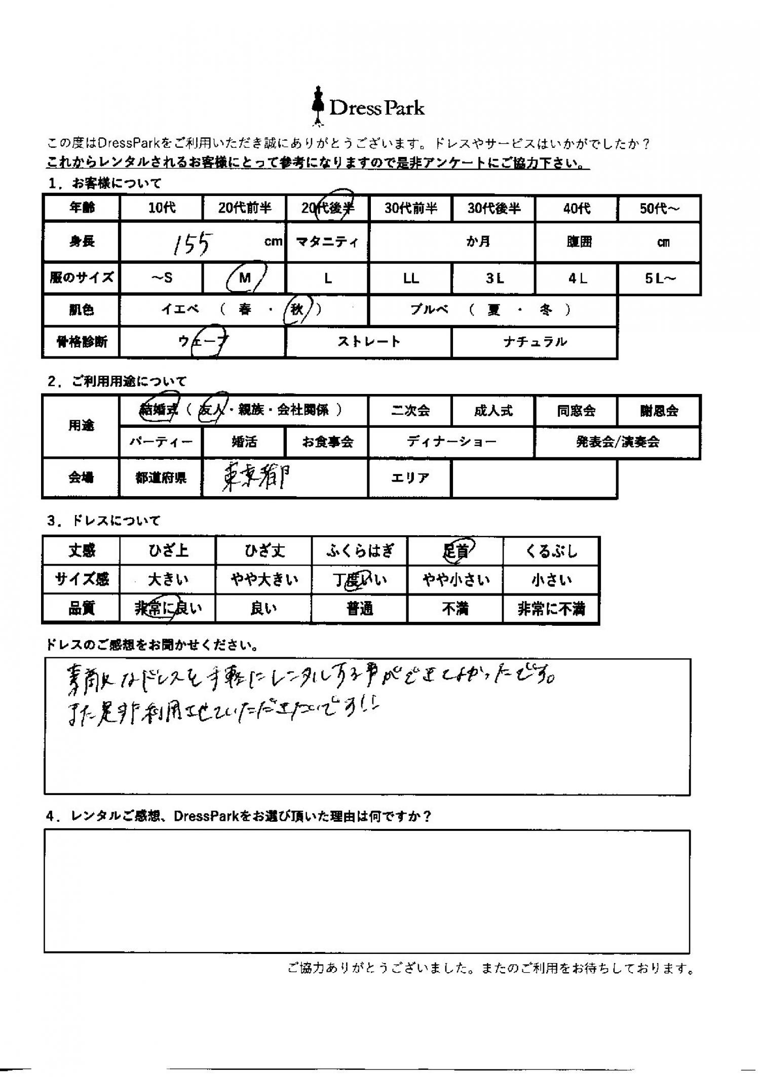 東京都 N.H様155㎝ Mサイズ #20代#M/L#155~159㎝#結婚式(友人)#東京都 ◆レンタルしたドレスはこちら ◆レンタルしたサイズは:S ◆レンタルした日付:2026/02/08 ドレスの着用感 ◆点数: (5点) ◆丈感:足首 ◆サイズ感:丁度いい ◆品質:非常に良い ◆肌色:イエベ ◆骨格診断:ウェーブ ドレスの感想 素敵なドレスを手軽にレンタルすることができてよかったです。またぜひ利用させていただきたいです! CUSTOMER REVIEWS お客様の声 気になるカテゴリー別にご利用の感想をチェック! ◆AGE 年代で見る 10代 20代 30代 40代 50代~ ◆SIZE サイズで見る SS/S M/L 大きいサイズLL~ ◆HIGHT 身長で見る 140~149㎝ 150~154㎝ 155~159㎝ 160~164㎝ 165~169㎝ 170㎝以上 ◆マタニティ ~3か月 4~6か月 7~8か月 9~10か月 ◆肌色 イエベ ブルべ ◆骨格診断 ウェーブ ストレート ナチュラル ◆利用シーン 結婚式(友人) 結婚式(親族) 結婚式(会社関係) 二次会 成人式/同窓会 謝恩会 パーティー その他 CUSTOMER REVIEWS都道府県別お客様の声 都道府県別にのお客様の声をチェック! 北海道 青森県 岩手県 宮城県 秋田県 山形県 福島県 茨城県 栃木県 群馬県 埼玉県 千葉県 東京都 神奈川県 新潟県 富山県 石川県 福井県 山梨県 長野県 岐阜県 静岡県 愛知県 三重県 滋賀県 京都府 大阪府 兵庫県 奈良県 和歌山県 鳥取県 島根県 岡山県 広島県 山口県 徳島県 香川県 愛媛県 高知県 福岡県 佐賀県 長崎県 熊本県 大分県 宮崎県 鹿児島県 沖縄県 CUSTOMER REVIEWSエリア別お客様の声 都道府県別にのお客様の声をチェック! 札幌 仙台 名古屋 軽井沢 金沢 神戸・芦屋 博多 那覇 梅田・新大阪 難波・心斎橋 鎌倉・湘南 横浜・みなとみらい 舞浜・浦安・幕張 大宮・浦和 青山・表参道 六本木・麻布 渋谷・恵比寿 新宿 池袋 銀座・丸の内 お台場・汐留 鹿児島市 郡山市 福島市 東予 甲府・石和 LINEでお問い合わせ このサイトではJavaScriptを使用しています