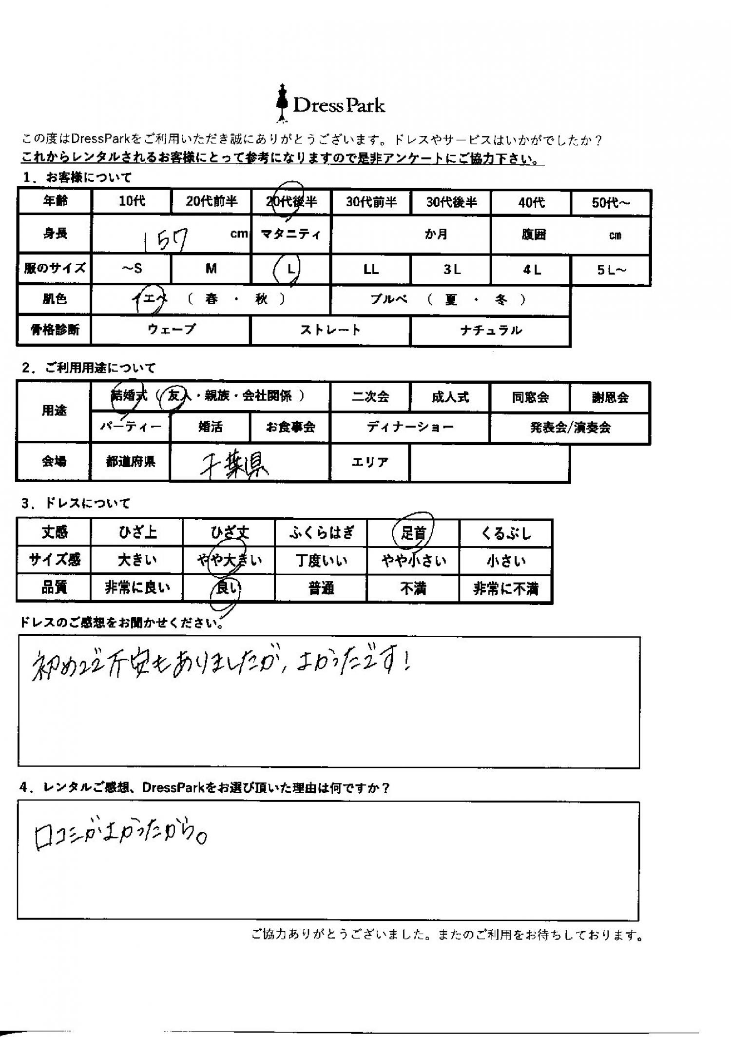 千葉県 R.T様157㎝ Lサイズ #20代#M/L#155~159㎝#結婚式(友人)#千葉県 ◆レンタルしたドレスはこちら ◆レンタルしたサイズは:L ◆レンタルした日付:2026/02/11 ドレスの着用感 ◆点数: (4点) ◆丈感:足首 ◆サイズ感:やや大きい ◆品質:良い ◆肌色:イエベ ドレスの感想 初めてで不安もありましたが、よかったです! レンタルのご感想、DressParkをお選び頂いた理由 口コミが良かったから。 CUSTOMER REVIEWS お客様の声 気になるカテゴリー別にご利用の感想をチェック! ◆AGE 年代で見る 10代 20代 30代 40代 50代~ ◆SIZE サイズで見る SS/S M/L 大きいサイズLL~ ◆HIGHT 身長で見る 140~149㎝ 150~154㎝ 155~159㎝ 160~164㎝ 165~169㎝ 170㎝以上 ◆マタニティ ~3か月 4~6か月 7~8か月 9~10か月 ◆肌色 イエベ ブルべ ◆骨格診断 ウェーブ ストレート ナチュラル ◆利用シーン 結婚式(友人) 結婚式(親族) 結婚式(会社関係) 二次会 成人式/同窓会 謝恩会 パーティー その他 CUSTOMER REVIEWS都道府県別お客様の声 都道府県別にのお客様の声をチェック! 北海道 青森県 岩手県 宮城県 秋田県 山形県 福島県 茨城県 栃木県 群馬県 埼玉県 千葉県 東京都 神奈川県 新潟県 富山県 石川県 福井県 山梨県 長野県 岐阜県 静岡県 愛知県 三重県 滋賀県 京都府 大阪府 兵庫県 奈良県 和歌山県 鳥取県 島根県 岡山県 広島県 山口県 徳島県 香川県 愛媛県 高知県 福岡県 佐賀県 長崎県 熊本県 大分県 宮崎県 鹿児島県 沖縄県 CUSTOMER REVIEWSエリア別お客様の声 都道府県別にのお客様の声をチェック! 札幌 仙台 名古屋 軽井沢 金沢 神戸・芦屋 博多 那覇 梅田・新大阪 難波・心斎橋 鎌倉・湘南 横浜・みなとみらい 舞浜・浦安・幕張 大宮・浦和 青山・表参道 六本木・麻布 渋谷・恵比寿 新宿 池袋 銀座・丸の内 お台場・汐留 鹿児島市 郡山市 福島市 東予 甲府・石和 LINEでお問い合わせ このサイトではJavaScriptを使用しています