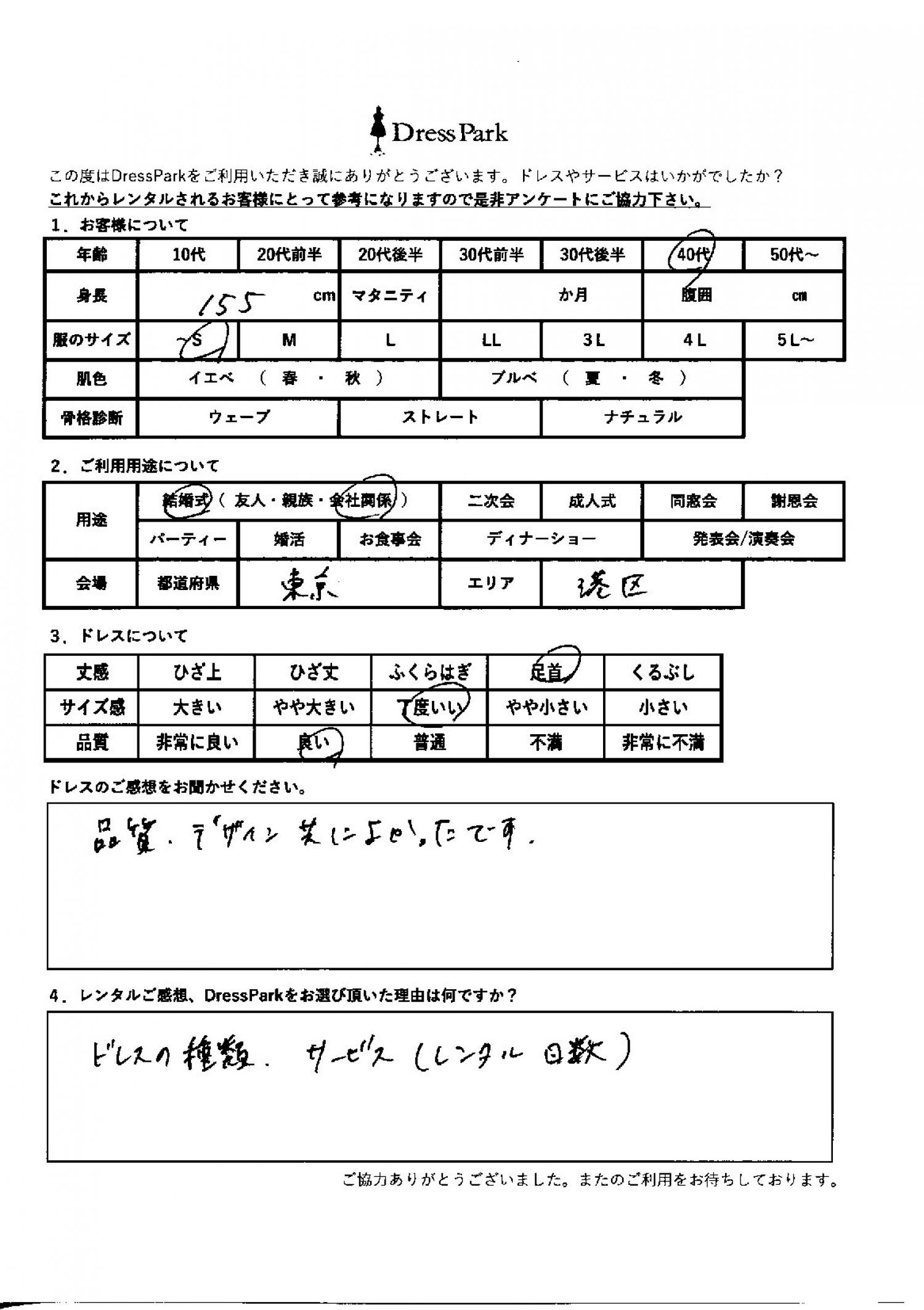 東京都 M.R様155㎝ ~Sサイズ六本木・麻布 #40代#SS/S#155~159㎝#結婚式(会社関係)#東京都#六本木・麻布 ◆レンタルしたドレスはこちら ◆レンタルしたサイズは:M ◆レンタルした日付:2026/02/11 ドレスの着用感 ◆点数: (4点) ◆丈感:足首 ◆サイズ感:丁度いい ◆品質:良い ドレスの感想 品質、デザインともに良かったです。 レンタルのご感想、DressParkをお選び頂いた理由 ドレスの種類、サービス(レンタル日数) CUSTOMER REVIEWS お客様の声 気になるカテゴリー別にご利用の感想をチェック! ◆AGE 年代で見る 10代 20代 30代 40代 50代~ ◆SIZE サイズで見る SS/S M/L 大きいサイズLL~ ◆HIGHT 身長で見る 140~149㎝ 150~154㎝ 155~159㎝ 160~164㎝ 165~169㎝ 170㎝以上 ◆マタニティ ~3か月 4~6か月 7~8か月 9~10か月 ◆肌色 イエベ ブルべ ◆骨格診断 ウェーブ ストレート ナチュラル ◆利用シーン 結婚式(友人) 結婚式(親族) 結婚式(会社関係) 二次会 成人式/同窓会 謝恩会 パーティー その他 CUSTOMER REVIEWS都道府県別お客様の声 都道府県別にのお客様の声をチェック! 北海道 青森県 岩手県 宮城県 秋田県 山形県 福島県 茨城県 栃木県 群馬県 埼玉県 千葉県 東京都 神奈川県 新潟県 富山県 石川県 福井県 山梨県 長野県 岐阜県 静岡県 愛知県 三重県 滋賀県 京都府 大阪府 兵庫県 奈良県 和歌山県 鳥取県 島根県 岡山県 広島県 山口県 徳島県 香川県 愛媛県 高知県 福岡県 佐賀県 長崎県 熊本県 大分県 宮崎県 鹿児島県 沖縄県 CUSTOMER REVIEWSエリア別お客様の声 都道府県別にのお客様の声をチェック! 札幌 仙台 名古屋 軽井沢 金沢 神戸・芦屋 博多 那覇 梅田・新大阪 難波・心斎橋 鎌倉・湘南 横浜・みなとみらい 舞浜・浦安・幕張 大宮・浦和 青山・表参道 六本木・麻布 渋谷・恵比寿 新宿 池袋 銀座・丸の内 お台場・汐留 鹿児島市 郡山市 福島市 東予 甲府・石和 LINEでお問い合わせ このサイトではJavaScriptを使用しています