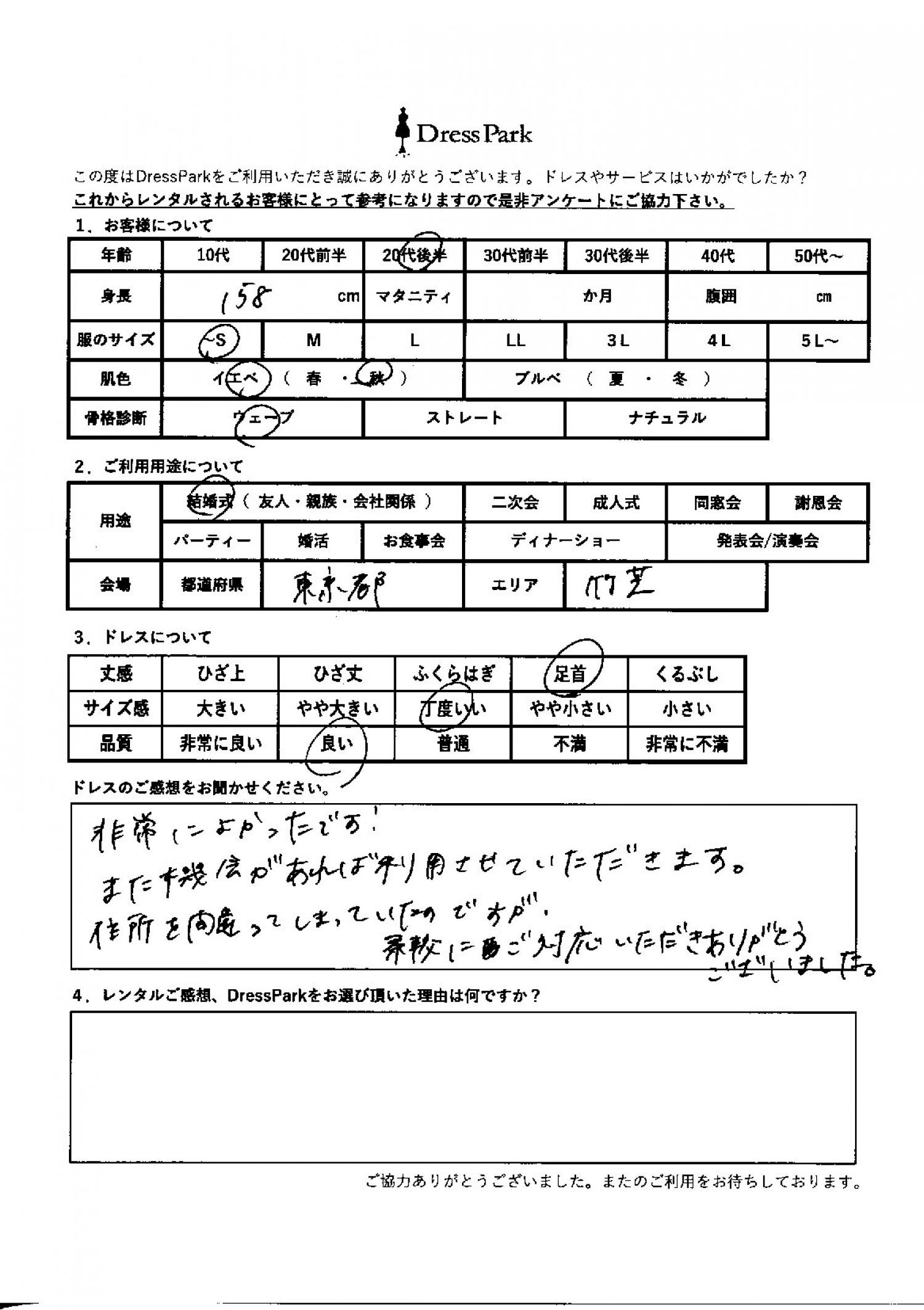 東京都 R.T様158㎝ ~Sサイズ #20代#SS/S#155~159㎝#結婚式(友人)#東京都 ◆レンタルしたドレスはこちら ◆レンタルしたサイズは:M ◆レンタルした日付:2026/02/14 ドレスの着用感 ◆点数: (5点) ◆丈感:足首 ◆サイズ感:丁度いい ◆品質:良い ◆肌色:イエベ ◆骨格診断:ウェーブ ドレスの感想 非常に良かったです!また機会があれば利用させていただきます。住所を間違ってしまっていたのですが、柔軟にご対応いただきありがとうございました。 CUSTOMER REVIEWS お客様の声 気になるカテゴリー別にご利用の感想をチェック! ◆AGE 年代で見る 10代 20代 30代 40代 50代~ ◆SIZE サイズで見る SS/S M/L 大きいサイズLL~ ◆HIGHT 身長で見る 140~149㎝ 150~154㎝ 155~159㎝ 160~164㎝ 165~169㎝ 170㎝以上 ◆マタニティ ~3か月 4~6か月 7~8か月 9~10か月 ◆肌色 イエベ ブルべ ◆骨格診断 ウェーブ ストレート ナチュラル ◆利用シーン 結婚式(友人) 結婚式(親族) 結婚式(会社関係) 二次会 成人式/同窓会 謝恩会 パーティー その他 CUSTOMER REVIEWS都道府県別お客様の声 都道府県別にのお客様の声をチェック! 北海道 青森県 岩手県 宮城県 秋田県 山形県 福島県 茨城県 栃木県 群馬県 埼玉県 千葉県 東京都 神奈川県 新潟県 富山県 石川県 福井県 山梨県 長野県 岐阜県 静岡県 愛知県 三重県 滋賀県 京都府 大阪府 兵庫県 奈良県 和歌山県 鳥取県 島根県 岡山県 広島県 山口県 徳島県 香川県 愛媛県 高知県 福岡県 佐賀県 長崎県 熊本県 大分県 宮崎県 鹿児島県 沖縄県 CUSTOMER REVIEWSエリア別お客様の声 都道府県別にのお客様の声をチェック! 札幌 仙台 名古屋 軽井沢 金沢 神戸・芦屋 博多 那覇 梅田・新大阪 難波・心斎橋 鎌倉・湘南 横浜・みなとみらい 舞浜・浦安・幕張 大宮・浦和 青山・表参道 六本木・麻布 渋谷・恵比寿 新宿 池袋 銀座・丸の内 お台場・汐留 鹿児島市 郡山市 福島市 東予 甲府・石和 LINEでお問い合わせ このサイトではJavaScriptを使用しています