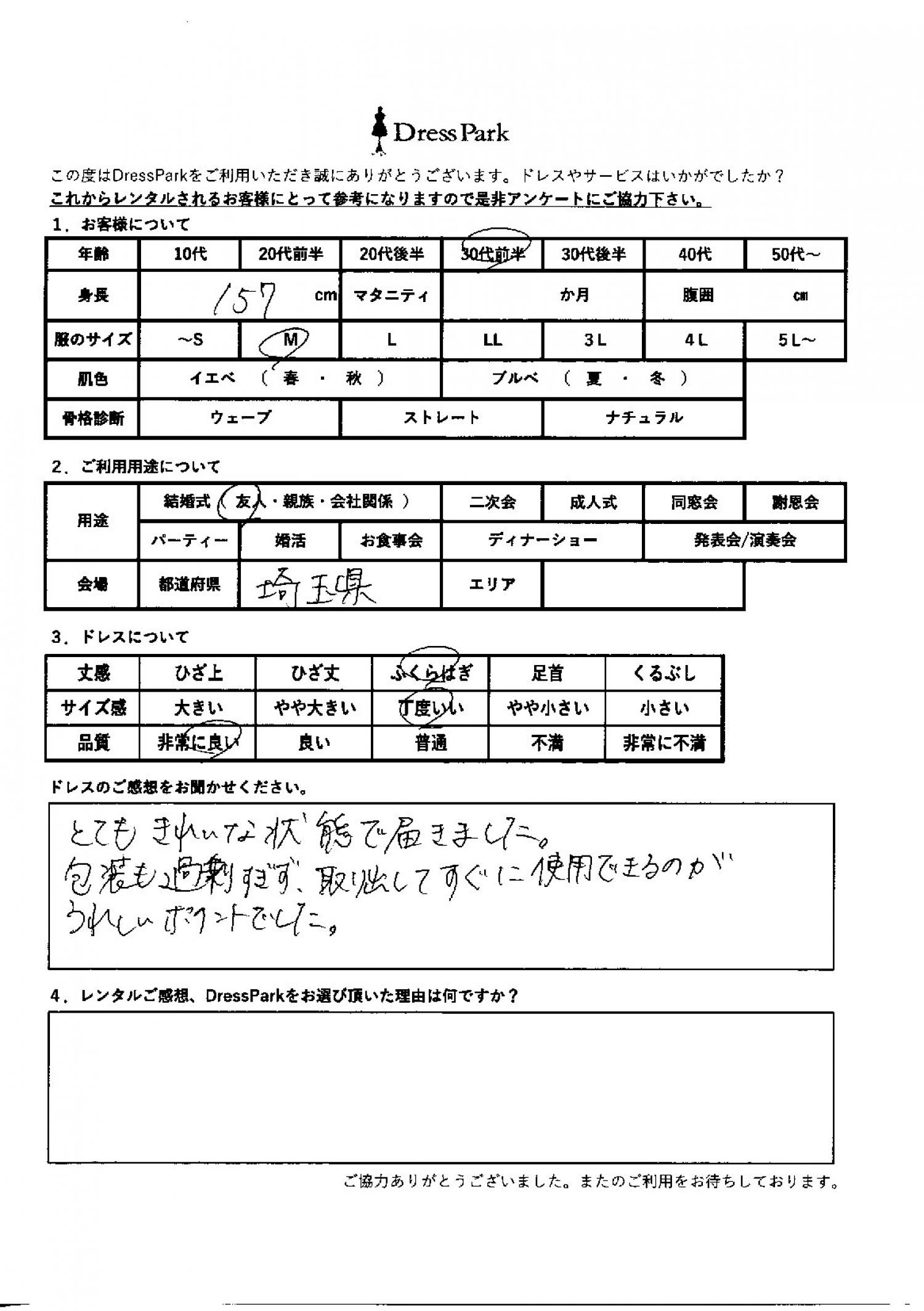 埼玉県 M.Y様157㎝ Mサイズ #30代#M/L#155~159㎝#結婚式(友人)#埼玉県 ◆レンタルしたドレスはこちら ◆レンタルしたサイズは:M ◆レンタルした日付:2026/02/14 ドレスの着用感 ◆点数: (5点) ◆丈感:ふくらはぎ ◆サイズ感:丁度いい ◆品質:非常に良い ドレスの感想 とてもきれいな状態で届きました。包装も過剰すぎず、取り出してすぐに使用できるのが嬉しいポイントでした。 CUSTOMER REVIEWS お客様の声 気になるカテゴリー別にご利用の感想をチェック! ◆AGE 年代で見る 10代 20代 30代 40代 50代~ ◆SIZE サイズで見る SS/S M/L 大きいサイズLL~ ◆HIGHT 身長で見る 140~149㎝ 150~154㎝ 155~159㎝ 160~164㎝ 165~169㎝ 170㎝以上 ◆マタニティ ~3か月 4~6か月 7~8か月 9~10か月 ◆肌色 イエベ ブルべ ◆骨格診断 ウェーブ ストレート ナチュラル ◆利用シーン 結婚式(友人) 結婚式(親族) 結婚式(会社関係) 二次会 成人式/同窓会 謝恩会 パーティー その他 CUSTOMER REVIEWS都道府県別お客様の声 都道府県別にのお客様の声をチェック! 北海道 青森県 岩手県 宮城県 秋田県 山形県 福島県 茨城県 栃木県 群馬県 埼玉県 千葉県 東京都 神奈川県 新潟県 富山県 石川県 福井県 山梨県 長野県 岐阜県 静岡県 愛知県 三重県 滋賀県 京都府 大阪府 兵庫県 奈良県 和歌山県 鳥取県 島根県 岡山県 広島県 山口県 徳島県 香川県 愛媛県 高知県 福岡県 佐賀県 長崎県 熊本県 大分県 宮崎県 鹿児島県 沖縄県 CUSTOMER REVIEWSエリア別お客様の声 都道府県別にのお客様の声をチェック! 札幌 仙台 名古屋 軽井沢 金沢 神戸・芦屋 博多 那覇 梅田・新大阪 難波・心斎橋 鎌倉・湘南 横浜・みなとみらい 舞浜・浦安・幕張 大宮・浦和 青山・表参道 六本木・麻布 渋谷・恵比寿 新宿 池袋 銀座・丸の内 お台場・汐留 鹿児島市 郡山市 福島市 東予 甲府・石和 LINEでお問い合わせ このサイトではJavaScriptを使用しています