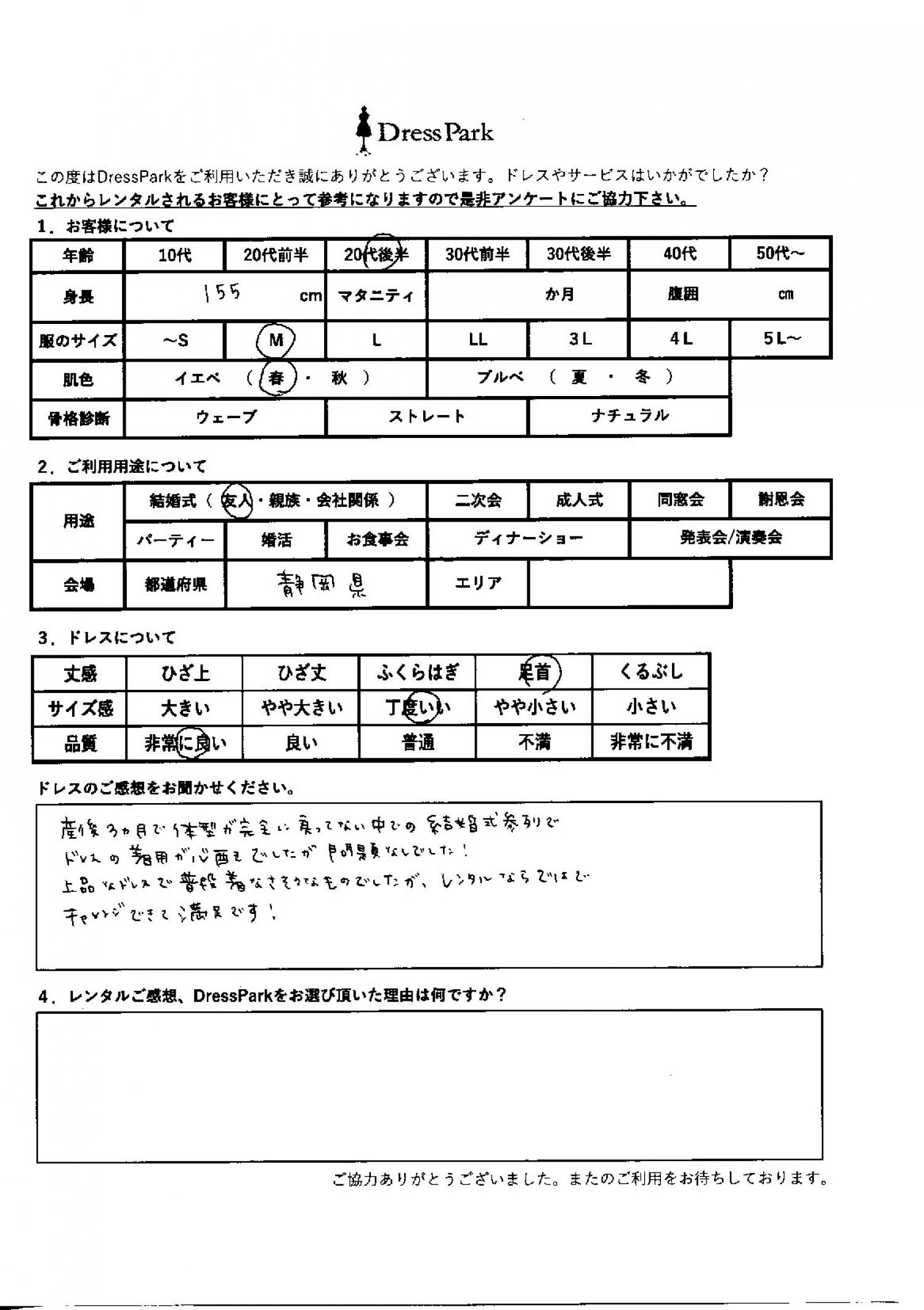 静岡県 H.T様155㎝ Mサイズ #20代#M/L#155~159㎝#結婚式(友人)#静岡県 ◆レンタルしたドレスはこちら ◆レンタルしたサイズは:M ◆レンタルした日付:2026/02/14 ドレスの着用感 ◆点数: (5点) ◆丈感:足首 ◆サイズ感:丁度いい ◆品質:非常に良い ◆肌色:イエベ ドレスの感想 産後3ヶ月で体型が完全に戻っていない中での結婚式参列で、ドレスの着用が心配でしたが、問題なしでした!上品なドレスで普段着なさそうなものでしたが、レンタルならではでチャレンジできて満足です! CUSTOMER REVIEWS お客様の声 気になるカテゴリー別にご利用の感想をチェック! ◆AGE 年代で見る 10代 20代 30代 40代 50代~ ◆SIZE サイズで見る SS/S M/L 大きいサイズLL~ ◆HIGHT 身長で見る 140~149㎝ 150~154㎝ 155~159㎝ 160~164㎝ 165~169㎝ 170㎝以上 ◆マタニティ ~3か月 4~6か月 7~8か月 9~10か月 ◆肌色 イエベ ブルべ ◆骨格診断 ウェーブ ストレート ナチュラル ◆利用シーン 結婚式(友人) 結婚式(親族) 結婚式(会社関係) 二次会 成人式/同窓会 謝恩会 パーティー その他 CUSTOMER REVIEWS都道府県別お客様の声 都道府県別にのお客様の声をチェック! 北海道 青森県 岩手県 宮城県 秋田県 山形県 福島県 茨城県 栃木県 群馬県 埼玉県 千葉県 東京都 神奈川県 新潟県 富山県 石川県 福井県 山梨県 長野県 岐阜県 静岡県 愛知県 三重県 滋賀県 京都府 大阪府 兵庫県 奈良県 和歌山県 鳥取県 島根県 岡山県 広島県 山口県 徳島県 香川県 愛媛県 高知県 福岡県 佐賀県 長崎県 熊本県 大分県 宮崎県 鹿児島県 沖縄県 CUSTOMER REVIEWSエリア別お客様の声 都道府県別にのお客様の声をチェック! 札幌 仙台 名古屋 軽井沢 金沢 神戸・芦屋 博多 那覇 梅田・新大阪 難波・心斎橋 鎌倉・湘南 横浜・みなとみらい 舞浜・浦安・幕張 大宮・浦和 青山・表参道 六本木・麻布 渋谷・恵比寿 新宿 池袋 銀座・丸の内 お台場・汐留 鹿児島市 郡山市 福島市 東予 甲府・石和 LINEでお問い合わせ このサイトではJavaScriptを使用しています