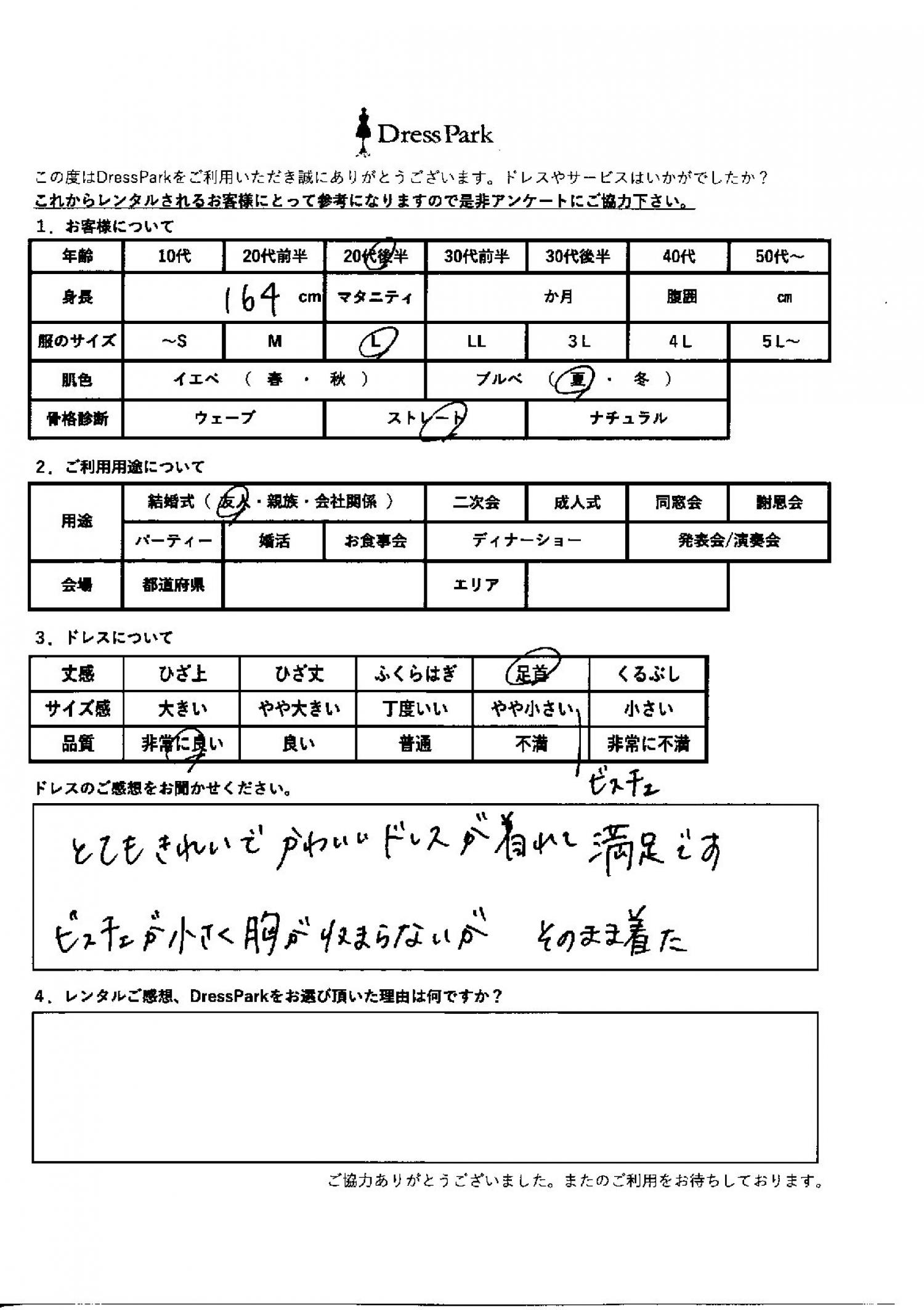 静岡県 M.O様164㎝ Lサイズ #20代#M/L#160~164㎝#結婚式(友人)#静岡県 ◆レンタルしたドレスはこちら ◆レンタルしたサイズは:L ◆レンタルした日付:2026/02/14 ドレスの着用感 ◆点数: (5点) ◆丈感:足首 ◆サイズ感:やや小さい ◆品質:非常に良い ◆肌色:ブルべ ◆骨格診断:ストレート ドレスの感想 とても綺麗で、可愛いドレスが着られて満足です。ビスチェが小さく胸が収まらないがそのまま着た。 CUSTOMER REVIEWS お客様の声 気になるカテゴリー別にご利用の感想をチェック! ◆AGE 年代で見る 10代 20代 30代 40代 50代~ ◆SIZE サイズで見る SS/S M/L 大きいサイズLL~ ◆HIGHT 身長で見る 140~149㎝ 150~154㎝ 155~159㎝ 160~164㎝ 165~169㎝ 170㎝以上 ◆マタニティ ~3か月 4~6か月 7~8か月 9~10か月 ◆肌色 イエベ ブルべ ◆骨格診断 ウェーブ ストレート ナチュラル ◆利用シーン 結婚式(友人) 結婚式(親族) 結婚式(会社関係) 二次会 成人式/同窓会 謝恩会 パーティー その他 CUSTOMER REVIEWS都道府県別お客様の声 都道府県別にのお客様の声をチェック! 北海道 青森県 岩手県 宮城県 秋田県 山形県 福島県 茨城県 栃木県 群馬県 埼玉県 千葉県 東京都 神奈川県 新潟県 富山県 石川県 福井県 山梨県 長野県 岐阜県 静岡県 愛知県 三重県 滋賀県 京都府 大阪府 兵庫県 奈良県 和歌山県 鳥取県 島根県 岡山県 広島県 山口県 徳島県 香川県 愛媛県 高知県 福岡県 佐賀県 長崎県 熊本県 大分県 宮崎県 鹿児島県 沖縄県 CUSTOMER REVIEWSエリア別お客様の声 都道府県別にのお客様の声をチェック! 札幌 仙台 名古屋 軽井沢 金沢 神戸・芦屋 博多 那覇 梅田・新大阪 難波・心斎橋 鎌倉・湘南 横浜・みなとみらい 舞浜・浦安・幕張 大宮・浦和 青山・表参道 六本木・麻布 渋谷・恵比寿 新宿 池袋 銀座・丸の内 お台場・汐留 鹿児島市 郡山市 福島市 東予 甲府・石和 LINEでお問い合わせ このサイトではJavaScriptを使用しています