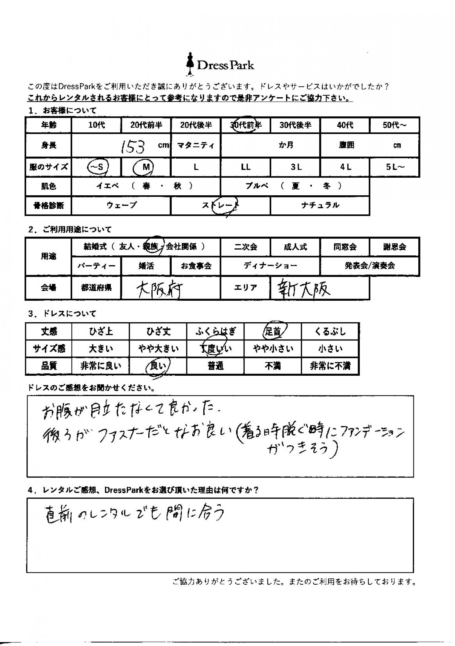 大阪府 C.H様153㎝ Mサイズ梅田・新大阪 #30代#M/L#150~154㎝#結婚式(親族)#大阪府#梅田・新大阪 ◆レンタルしたドレスはこちら ◆レンタルしたサイズは:M ◆レンタルした日付:2026/02/15 ドレスの着用感 ◆点数: (4点) ◆丈感:足首 ◆サイズ感:丁度いい ◆品質:良い ◆骨格診断:ストレート ドレスの感想 お腹が目立たなくてよかった。後ろがファスナーだと尚良い。(着ると脱ぐときにファンデーションがつきそう。) レンタルのご感想、DressParkをお選び頂いた理由 直前のレンタルでも間に合う。 CUSTOMER REVIEWS お客様の声 気になるカテゴリー別にご利用の感想をチェック! ◆AGE 年代で見る 10代 20代 30代 40代 50代~ ◆SIZE サイズで見る SS/S M/L 大きいサイズLL~ ◆HIGHT 身長で見る 140~149㎝ 150~154㎝ 155~159㎝ 160~164㎝ 165~169㎝ 170㎝以上 ◆マタニティ ~3か月 4~6か月 7~8か月 9~10か月 ◆肌色 イエベ ブルべ ◆骨格診断 ウェーブ ストレート ナチュラル ◆利用シーン 結婚式(友人) 結婚式(親族) 結婚式(会社関係) 二次会 成人式/同窓会 謝恩会 パーティー その他 CUSTOMER REVIEWS都道府県別お客様の声 都道府県別にのお客様の声をチェック! 北海道 青森県 岩手県 宮城県 秋田県 山形県 福島県 茨城県 栃木県 群馬県 埼玉県 千葉県 東京都 神奈川県 新潟県 富山県 石川県 福井県 山梨県 長野県 岐阜県 静岡県 愛知県 三重県 滋賀県 京都府 大阪府 兵庫県 奈良県 和歌山県 鳥取県 島根県 岡山県 広島県 山口県 徳島県 香川県 愛媛県 高知県 福岡県 佐賀県 長崎県 熊本県 大分県 宮崎県 鹿児島県 沖縄県 CUSTOMER REVIEWSエリア別お客様の声 都道府県別にのお客様の声をチェック! 札幌 仙台 名古屋 軽井沢 金沢 神戸・芦屋 博多 那覇 梅田・新大阪 難波・心斎橋 鎌倉・湘南 横浜・みなとみらい 舞浜・浦安・幕張 大宮・浦和 青山・表参道 六本木・麻布 渋谷・恵比寿 新宿 池袋 銀座・丸の内 お台場・汐留 鹿児島市 郡山市 福島市 東予 甲府・石和 LINEでお問い合わせ このサイトではJavaScriptを使用しています