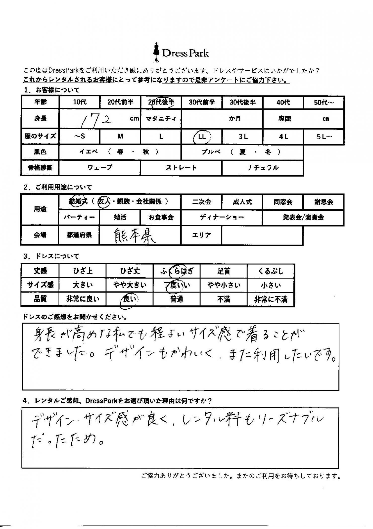 熊本県 N.U様172㎝ LLサイズ #20代#大きいサイズLL~#170㎝以上#結婚式(友人)#熊本県 ◆レンタルしたドレスはこちら ◆レンタルしたサイズは:L ◆レンタルした日付:2026/02/14 ドレスの着用感 ◆点数: (4点) ◆丈感:ふくらはぎ ◆サイズ感:丁度いい ◆品質:良い ドレスの感想 身長が高めの私でも程良いサイズ感で着ることができました。デザインも可愛くまた利用したいです。 レンタルのご感想、DressParkをお選び頂いた理由 デザイン、サイズ感が良く、レンタル料もリーズナブルだったため。 CUSTOMER REVIEWS お客様の声 気になるカテゴリー別にご利用の感想をチェック! ◆AGE 年代で見る 10代 20代 30代 40代 50代~ ◆SIZE サイズで見る SS/S M/L 大きいサイズLL~ ◆HIGHT 身長で見る 140~149㎝ 150~154㎝ 155~159㎝ 160~164㎝ 165~169㎝ 170㎝以上 ◆マタニティ ~3か月 4~6か月 7~8か月 9~10か月 ◆肌色 イエベ ブルべ ◆骨格診断 ウェーブ ストレート ナチュラル ◆利用シーン 結婚式(友人) 結婚式(親族) 結婚式(会社関係) 二次会 成人式/同窓会 謝恩会 パーティー その他 CUSTOMER REVIEWS都道府県別お客様の声 都道府県別にのお客様の声をチェック! 北海道 青森県 岩手県 宮城県 秋田県 山形県 福島県 茨城県 栃木県 群馬県 埼玉県 千葉県 東京都 神奈川県 新潟県 富山県 石川県 福井県 山梨県 長野県 岐阜県 静岡県 愛知県 三重県 滋賀県 京都府 大阪府 兵庫県 奈良県 和歌山県 鳥取県 島根県 岡山県 広島県 山口県 徳島県 香川県 愛媛県 高知県 福岡県 佐賀県 長崎県 熊本県 大分県 宮崎県 鹿児島県 沖縄県 CUSTOMER REVIEWSエリア別お客様の声 都道府県別にのお客様の声をチェック! 札幌 仙台 名古屋 軽井沢 金沢 神戸・芦屋 博多 那覇 梅田・新大阪 難波・心斎橋 鎌倉・湘南 横浜・みなとみらい 舞浜・浦安・幕張 大宮・浦和 青山・表参道 六本木・麻布 渋谷・恵比寿 新宿 池袋 銀座・丸の内 お台場・汐留 鹿児島市 郡山市 福島市 東予 甲府・石和 LINEでお問い合わせ このサイトではJavaScriptを使用しています
