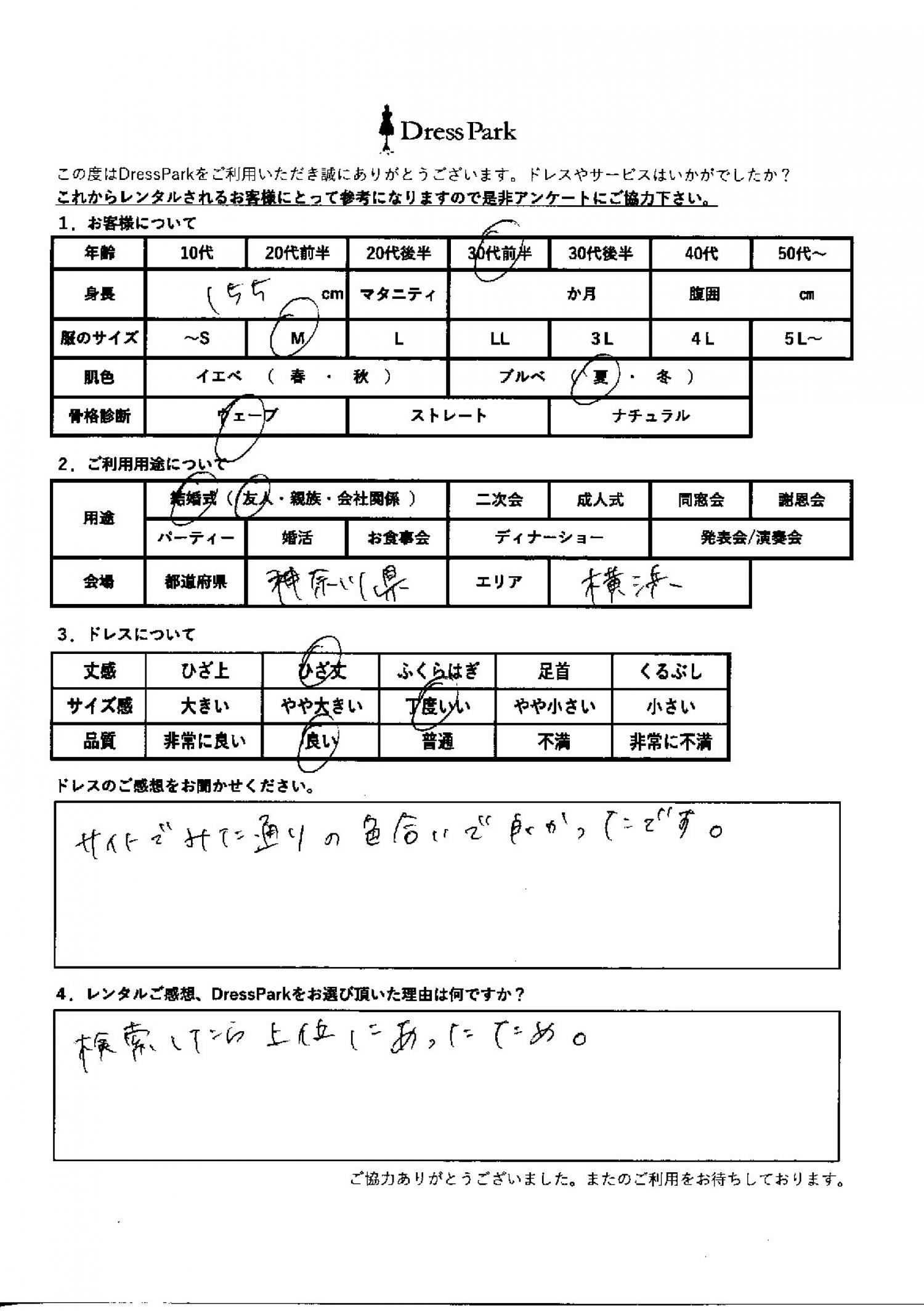 神奈川県 Y.T様155㎝ Mサイズ横浜・みなとみらい #30代#M/L#155~159㎝#結婚式(友人)#神奈川県#横浜・みなとみらい ◆レンタルしたドレスはこちら ◆レンタルしたサイズは:M ◆レンタルした日付:2026/02/15 ドレスの着用感 ◆点数: (4点) ◆丈感:ひざ丈 ◆サイズ感:丁度いい ◆品質:良い ◆肌色:ブルべ ◆骨格診断:ウェーブ ドレスの感想 サイトで見た通りの色合いでよかったです。 レンタルのご感想、DressParkをお選び頂いた理由 検索したら上位にあったため。 CUSTOMER REVIEWS お客様の声 気になるカテゴリー別にご利用の感想をチェック! ◆AGE 年代で見る 10代 20代 30代 40代 50代~ ◆SIZE サイズで見る SS/S M/L 大きいサイズLL~ ◆HIGHT 身長で見る 140~149㎝ 150~154㎝ 155~159㎝ 160~164㎝ 165~169㎝ 170㎝以上 ◆マタニティ ~3か月 4~6か月 7~8か月 9~10か月 ◆肌色 イエベ ブルべ ◆骨格診断 ウェーブ ストレート ナチュラル ◆利用シーン 結婚式(友人) 結婚式(親族) 結婚式(会社関係) 二次会 成人式/同窓会 謝恩会 パーティー その他 CUSTOMER REVIEWS都道府県別お客様の声 都道府県別にのお客様の声をチェック! 北海道 青森県 岩手県 宮城県 秋田県 山形県 福島県 茨城県 栃木県 群馬県 埼玉県 千葉県 東京都 神奈川県 新潟県 富山県 石川県 福井県 山梨県 長野県 岐阜県 静岡県 愛知県 三重県 滋賀県 京都府 大阪府 兵庫県 奈良県 和歌山県 鳥取県 島根県 岡山県 広島県 山口県 徳島県 香川県 愛媛県 高知県 福岡県 佐賀県 長崎県 熊本県 大分県 宮崎県 鹿児島県 沖縄県 CUSTOMER REVIEWSエリア別お客様の声 都道府県別にのお客様の声をチェック! 札幌 仙台 名古屋 軽井沢 金沢 神戸・芦屋 博多 那覇 梅田・新大阪 難波・心斎橋 鎌倉・湘南 横浜・みなとみらい 舞浜・浦安・幕張 大宮・浦和 青山・表参道 六本木・麻布 渋谷・恵比寿 新宿 池袋 銀座・丸の内 お台場・汐留 鹿児島市 郡山市 福島市 東予 甲府・石和 LINEでお問い合わせ このサイトではJavaScriptを使用しています