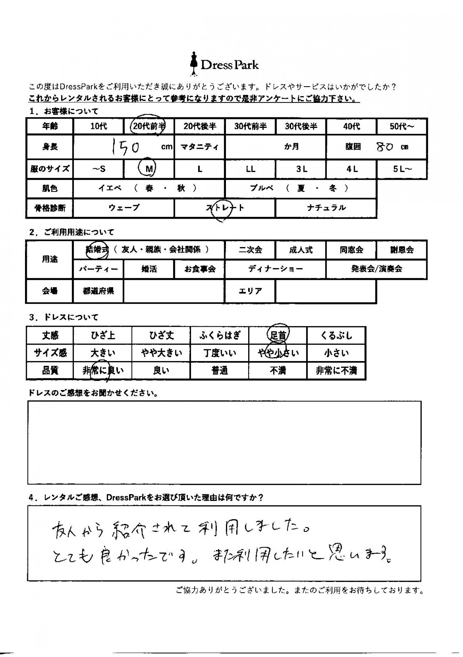 長野県 N.S様150㎝ Mサイズ #20代#M/L#150~154㎝#結婚式(友人)#長野県 ◆レンタルしたドレスはこちら ◆レンタルしたサイズは:M ◆レンタルした日付:2026/02/15 ドレスの着用感 ◆点数: (5点) ◆丈感:足首 ◆サイズ感:やや小さい ◆品質:非常に良い ◆骨格診断:ストレート レンタルのご感想、DressParkをお選び頂いた理由 友人から紹介されて利用しました。とても良かったです。また利用したいと思います。 CUSTOMER REVIEWS お客様の声 気になるカテゴリー別にご利用の感想をチェック! ◆AGE 年代で見る 10代 20代 30代 40代 50代~ ◆SIZE サイズで見る SS/S M/L 大きいサイズLL~ ◆HIGHT 身長で見る 140~149㎝ 150~154㎝ 155~159㎝ 160~164㎝ 165~169㎝ 170㎝以上 ◆マタニティ ~3か月 4~6か月 7~8か月 9~10か月 ◆肌色 イエベ ブルべ ◆骨格診断 ウェーブ ストレート ナチュラル ◆利用シーン 結婚式(友人) 結婚式(親族) 結婚式(会社関係) 二次会 成人式/同窓会 謝恩会 パーティー その他 CUSTOMER REVIEWS都道府県別お客様の声 都道府県別にのお客様の声をチェック! 北海道 青森県 岩手県 宮城県 秋田県 山形県 福島県 茨城県 栃木県 群馬県 埼玉県 千葉県 東京都 神奈川県 新潟県 富山県 石川県 福井県 山梨県 長野県 岐阜県 静岡県 愛知県 三重県 滋賀県 京都府 大阪府 兵庫県 奈良県 和歌山県 鳥取県 島根県 岡山県 広島県 山口県 徳島県 香川県 愛媛県 高知県 福岡県 佐賀県 長崎県 熊本県 大分県 宮崎県 鹿児島県 沖縄県 CUSTOMER REVIEWSエリア別お客様の声 都道府県別にのお客様の声をチェック! 札幌 仙台 名古屋 軽井沢 金沢 神戸・芦屋 博多 那覇 梅田・新大阪 難波・心斎橋 鎌倉・湘南 横浜・みなとみらい 舞浜・浦安・幕張 大宮・浦和 青山・表参道 六本木・麻布 渋谷・恵比寿 新宿 池袋 銀座・丸の内 お台場・汐留 鹿児島市 郡山市 福島市 東予 甲府・石和 LINEでお問い合わせ このサイトではJavaScriptを使用しています