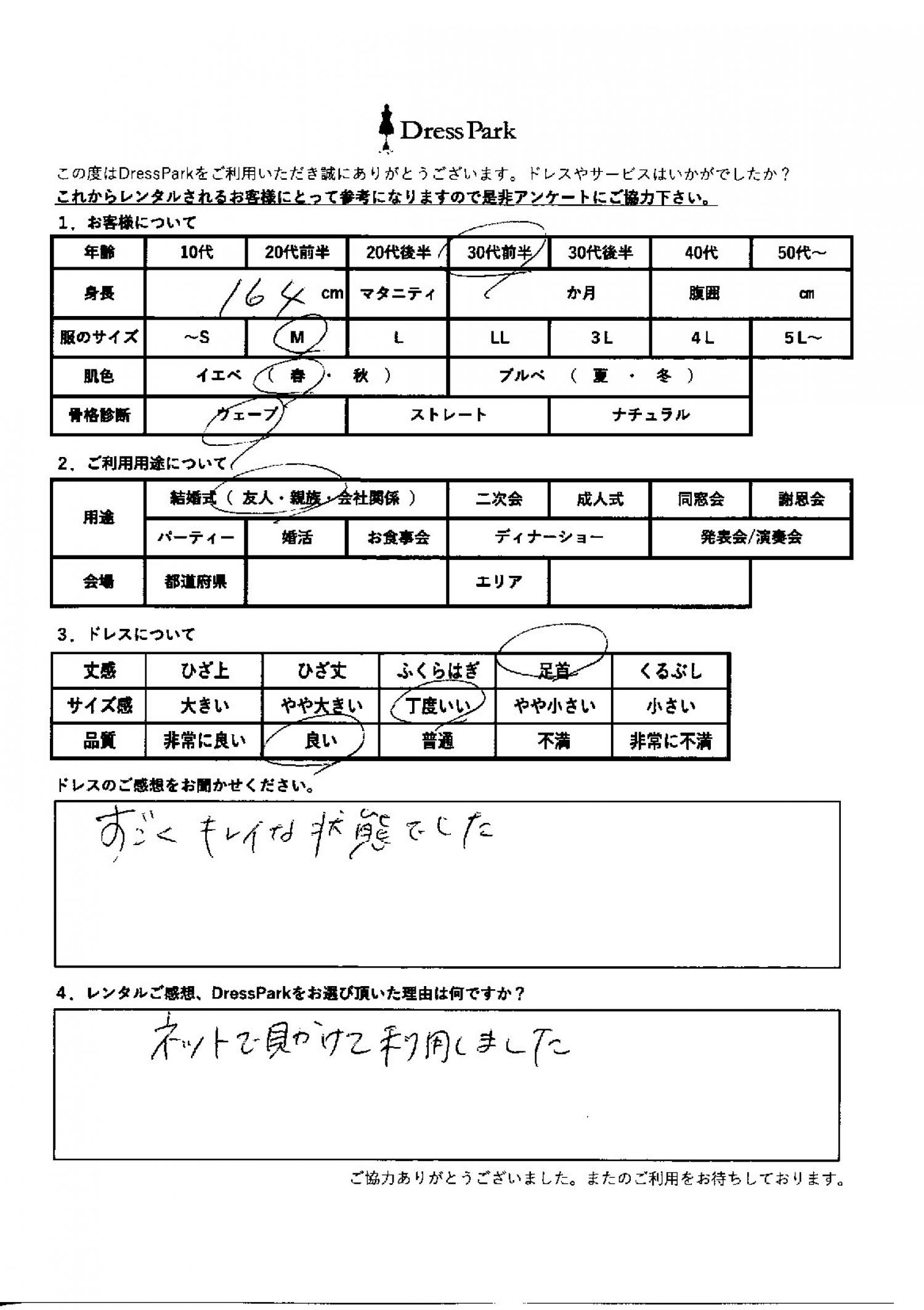 大阪府 M.K様164㎝ Mサイズ #30代#M/L#160~164㎝#結婚式(友人)#大阪府 ◆レンタルしたドレスはこちら ◆レンタルしたサイズは:M ◆レンタルした日付:2026/02/21 ドレスの着用感 ◆点数: (4点) ◆丈感:足首 ◆サイズ感:丁度いい ◆品質:良い ◆肌色:イエベ ◆骨格診断:ウェーブ ドレスの感想 すごく綺麗な状態でした。 レンタルのご感想、DressParkをお選び頂いた理由 ネットで見かけて利用しました。 CUSTOMER REVIEWS お客様の声 気になるカテゴリー別にご利用の感想をチェック! ◆AGE 年代で見る 10代 20代 30代 40代 50代~ ◆SIZE サイズで見る SS/S M/L 大きいサイズLL~ ◆HIGHT 身長で見る 140~149㎝ 150~154㎝ 155~159㎝ 160~164㎝ 165~169㎝ 170㎝以上 ◆マタニティ ~3か月 4~6か月 7~8か月 9~10か月 ◆肌色 イエベ ブルべ ◆骨格診断 ウェーブ ストレート ナチュラル ◆利用シーン 結婚式(友人) 結婚式(親族) 結婚式(会社関係) 二次会 成人式/同窓会 謝恩会 パーティー その他 CUSTOMER REVIEWS都道府県別お客様の声 都道府県別にのお客様の声をチェック! 北海道 青森県 岩手県 宮城県 秋田県 山形県 福島県 茨城県 栃木県 群馬県 埼玉県 千葉県 東京都 神奈川県 新潟県 富山県 石川県 福井県 山梨県 長野県 岐阜県 静岡県 愛知県 三重県 滋賀県 京都府 大阪府 兵庫県 奈良県 和歌山県 鳥取県 島根県 岡山県 広島県 山口県 徳島県 香川県 愛媛県 高知県 福岡県 佐賀県 長崎県 熊本県 大分県 宮崎県 鹿児島県 沖縄県 CUSTOMER REVIEWSエリア別お客様の声 都道府県別にのお客様の声をチェック! 札幌 仙台 名古屋 軽井沢 金沢 神戸・芦屋 博多 那覇 梅田・新大阪 難波・心斎橋 鎌倉・湘南 横浜・みなとみらい 舞浜・浦安・幕張 大宮・浦和 青山・表参道 六本木・麻布 渋谷・恵比寿 新宿 池袋 銀座・丸の内 お台場・汐留 鹿児島市 郡山市 福島市 東予 甲府・石和 LINEでお問い合わせ このサイトではJavaScriptを使用しています