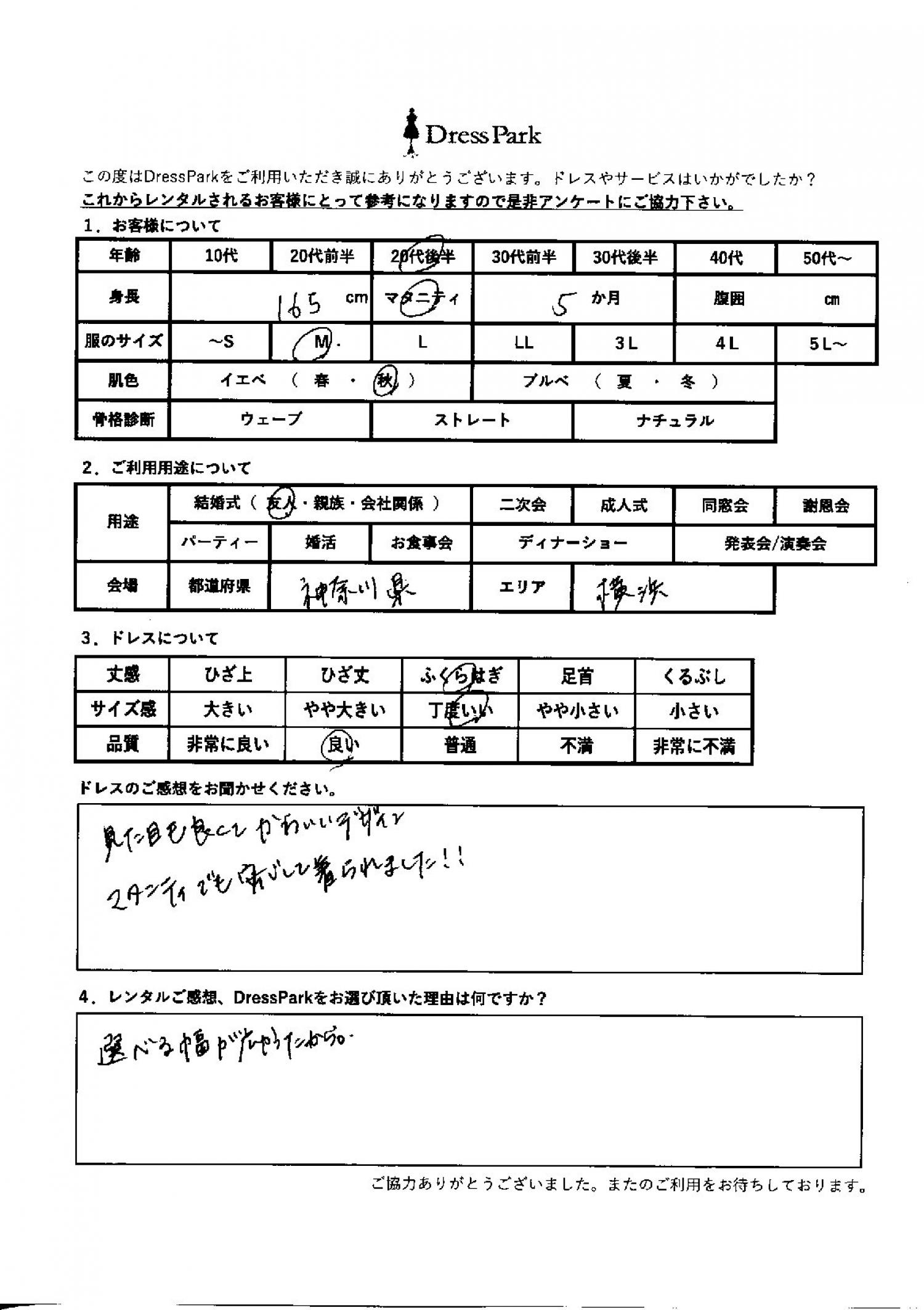 神奈川県 E.M様165㎝ Mサイズ横浜・みなとみらい マタニティ #20代#M/L#165~169㎝#結婚式(友人)#神奈川県#横浜・みなとみらい ◆レンタルしたドレスはこちら ◆レンタルしたサイズは:L ◆レンタルした日付:2026/02/21 ドレスの着用感 ◆点数: (5点) ◆丈感:ふくらはぎ ◆サイズ感:丁度いい ◆品質:良い ◆マタニティ:5ヶ月 ◆肌色:イエベ ドレスの感想 見た目も良くて可愛いデザイン、マタニティーでも安心して着られました! レンタルのご感想、DressParkをお選び頂いた理由 選べる幅が広かったから。 CUSTOMER REVIEWS お客様の声 気になるカテゴリー別にご利用の感想をチェック! ◆AGE 年代で見る 10代 20代 30代 40代 50代~ ◆SIZE サイズで見る SS/S M/L 大きいサイズLL~ ◆HIGHT 身長で見る 140~149㎝ 150~154㎝ 155~159㎝ 160~164㎝ 165~169㎝ 170㎝以上 ◆マタニティ ~3か月 4~6か月 7~8か月 9~10か月 ◆肌色 イエベ ブルべ ◆骨格診断 ウェーブ ストレート ナチュラル ◆利用シーン 結婚式(友人) 結婚式(親族) 結婚式(会社関係) 二次会 成人式/同窓会 謝恩会 パーティー その他 CUSTOMER REVIEWS都道府県別お客様の声 都道府県別にのお客様の声をチェック! 北海道 青森県 岩手県 宮城県 秋田県 山形県 福島県 茨城県 栃木県 群馬県 埼玉県 千葉県 東京都 神奈川県 新潟県 富山県 石川県 福井県 山梨県 長野県 岐阜県 静岡県 愛知県 三重県 滋賀県 京都府 大阪府 兵庫県 奈良県 和歌山県 鳥取県 島根県 岡山県 広島県 山口県 徳島県 香川県 愛媛県 高知県 福岡県 佐賀県 長崎県 熊本県 大分県 宮崎県 鹿児島県 沖縄県 CUSTOMER REVIEWSエリア別お客様の声 都道府県別にのお客様の声をチェック! 札幌 仙台 名古屋 軽井沢 金沢 神戸・芦屋 博多 那覇 梅田・新大阪 難波・心斎橋 鎌倉・湘南 横浜・みなとみらい 舞浜・浦安・幕張 大宮・浦和 青山・表参道 六本木・麻布 渋谷・恵比寿 新宿 池袋 銀座・丸の内 お台場・汐留 鹿児島市 郡山市 福島市 東予 甲府・石和 LINEでお問い合わせ このサイトではJavaScriptを使用しています