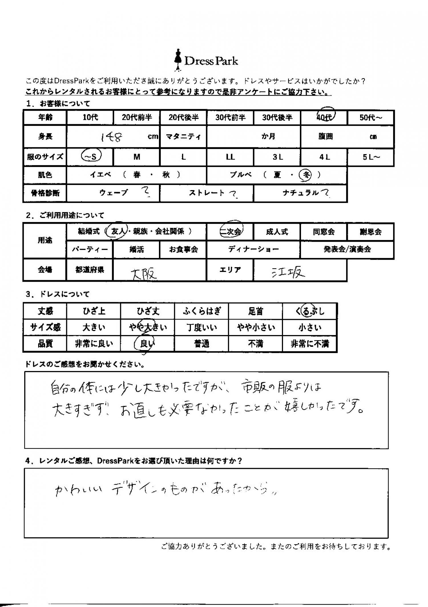 大阪府 E.M様148㎝ ~Sサイズ #40代#SS/S#140~149㎝#結婚式(友人)#大阪府 ◆レンタルしたドレスはこちら ◆レンタルしたサイズは:S ◆レンタルした日付:2026/02/21 ドレスの着用感 ◆点数: (4点) ◆丈感:くるぶし ◆サイズ感:やや大きい ◆品質:良い ◆肌色:ブルべ ドレスの感想 自分の体には少し大きかったですが、市販の服よりは大きすぎず、お直しも必要なかったことが嬉しかったです。 レンタルのご感想、DressParkをお選び頂いた理由 かわいいデザインのものがあったから。 CUSTOMER REVIEWS お客様の声 気になるカテゴリー別にご利用の感想をチェック! ◆AGE 年代で見る 10代 20代 30代 40代 50代~ ◆SIZE サイズで見る SS/S M/L 大きいサイズLL~ ◆HIGHT 身長で見る 140~149㎝ 150~154㎝ 155~159㎝ 160~164㎝ 165~169㎝ 170㎝以上 ◆マタニティ ~3か月 4~6か月 7~8か月 9~10か月 ◆肌色 イエベ ブルべ ◆骨格診断 ウェーブ ストレート ナチュラル ◆利用シーン 結婚式(友人) 結婚式(親族) 結婚式(会社関係) 二次会 成人式/同窓会 謝恩会 パーティー その他 CUSTOMER REVIEWS都道府県別お客様の声 都道府県別にのお客様の声をチェック! 北海道 青森県 岩手県 宮城県 秋田県 山形県 福島県 茨城県 栃木県 群馬県 埼玉県 千葉県 東京都 神奈川県 新潟県 富山県 石川県 福井県 山梨県 長野県 岐阜県 静岡県 愛知県 三重県 滋賀県 京都府 大阪府 兵庫県 奈良県 和歌山県 鳥取県 島根県 岡山県 広島県 山口県 徳島県 香川県 愛媛県 高知県 福岡県 佐賀県 長崎県 熊本県 大分県 宮崎県 鹿児島県 沖縄県 CUSTOMER REVIEWSエリア別お客様の声 都道府県別にのお客様の声をチェック! 札幌 仙台 名古屋 軽井沢 金沢 神戸・芦屋 博多 那覇 梅田・新大阪 難波・心斎橋 鎌倉・湘南 横浜・みなとみらい 舞浜・浦安・幕張 大宮・浦和 青山・表参道 六本木・麻布 渋谷・恵比寿 新宿 池袋 銀座・丸の内 お台場・汐留 鹿児島市 郡山市 福島市 東予 甲府・石和 LINEでお問い合わせ このサイトではJavaScriptを使用しています