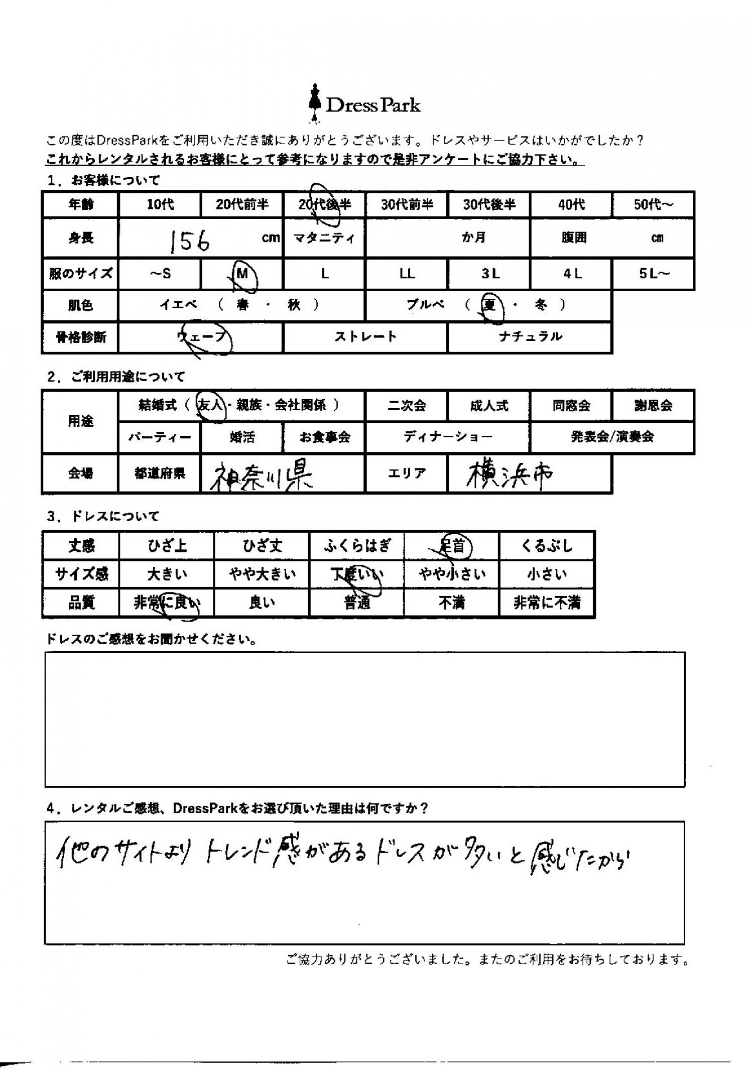 神奈川県 A.K様156㎝ Mサイズ横浜・みなとみらい #20代#M/L#155~159㎝#結婚式(友人)#神奈川県#横浜・みなとみらい ◆レンタルしたドレスはこちら ◆レンタルしたサイズは:M ◆レンタルした日付:2026/02/21 ドレスの着用感 ◆点数: (5点) ◆丈感:足首 ◆サイズ感:丁度いい ◆品質:非常に良い ◆肌色:ブルべ ◆骨格診断:ウェーブ レンタルのご感想、DressParkをお選び頂いた理由 他のサイトよりトレンド感があるドレスが多いと感じたから。 CUSTOMER REVIEWS お客様の声 気になるカテゴリー別にご利用の感想をチェック! ◆AGE 年代で見る 10代 20代 30代 40代 50代~ ◆SIZE サイズで見る SS/S M/L 大きいサイズLL~ ◆HIGHT 身長で見る 140~149㎝ 150~154㎝ 155~159㎝ 160~164㎝ 165~169㎝ 170㎝以上 ◆マタニティ ~3か月 4~6か月 7~8か月 9~10か月 ◆肌色 イエベ ブルべ ◆骨格診断 ウェーブ ストレート ナチュラル ◆利用シーン 結婚式(友人) 結婚式(親族) 結婚式(会社関係) 二次会 成人式/同窓会 謝恩会 パーティー その他 CUSTOMER REVIEWS都道府県別お客様の声 都道府県別にのお客様の声をチェック! 北海道 青森県 岩手県 宮城県 秋田県 山形県 福島県 茨城県 栃木県 群馬県 埼玉県 千葉県 東京都 神奈川県 新潟県 富山県 石川県 福井県 山梨県 長野県 岐阜県 静岡県 愛知県 三重県 滋賀県 京都府 大阪府 兵庫県 奈良県 和歌山県 鳥取県 島根県 岡山県 広島県 山口県 徳島県 香川県 愛媛県 高知県 福岡県 佐賀県 長崎県 熊本県 大分県 宮崎県 鹿児島県 沖縄県 CUSTOMER REVIEWSエリア別お客様の声 都道府県別にのお客様の声をチェック! 札幌 仙台 名古屋 軽井沢 金沢 神戸・芦屋 博多 那覇 梅田・新大阪 難波・心斎橋 鎌倉・湘南 横浜・みなとみらい 舞浜・浦安・幕張 大宮・浦和 青山・表参道 六本木・麻布 渋谷・恵比寿 新宿 池袋 銀座・丸の内 お台場・汐留 鹿児島市 郡山市 福島市 東予 甲府・石和 LINEでお問い合わせ このサイトではJavaScriptを使用しています