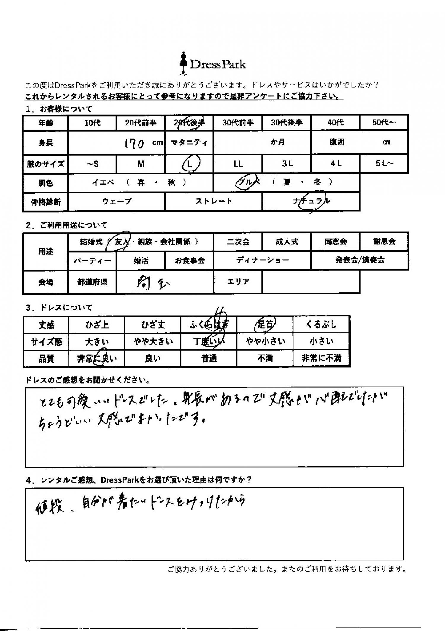 埼玉県 M.S様170㎝ Lサイズ #20代#M/L#170㎝以上#結婚式(友人)#埼玉県 ◆レンタルしたドレスはこちら ◆レンタルしたサイズは:L ◆レンタルした日付:2026/02/21 ドレスの着用感 ◆点数: (5点) ◆丈感:足首 ◆サイズ感:丁度いい ◆品質:非常に良い ◆肌色:ブルべ ◆骨格診断:ナチュラル ドレスの感想 とてもかわいいドレスでした。身長があるので、丈感が心配でしたが、ちょうど良い丈感で良かったです。 レンタルのご感想、DressParkをお選び頂いた理由 値段、自分がきたドレスを見つけたから。 CUSTOMER REVIEWS お客様の声 気になるカテゴリー別にご利用の感想をチェック! ◆AGE 年代で見る 10代 20代 30代 40代 50代~ ◆SIZE サイズで見る SS/S M/L 大きいサイズLL~ ◆HIGHT 身長で見る 140~149㎝ 150~154㎝ 155~159㎝ 160~164㎝ 165~169㎝ 170㎝以上 ◆マタニティ ~3か月 4~6か月 7~8か月 9~10か月 ◆肌色 イエベ ブルべ ◆骨格診断 ウェーブ ストレート ナチュラル ◆利用シーン 結婚式(友人) 結婚式(親族) 結婚式(会社関係) 二次会 成人式/同窓会 謝恩会 パーティー その他 CUSTOMER REVIEWS都道府県別お客様の声 都道府県別にのお客様の声をチェック! 北海道 青森県 岩手県 宮城県 秋田県 山形県 福島県 茨城県 栃木県 群馬県 埼玉県 千葉県 東京都 神奈川県 新潟県 富山県 石川県 福井県 山梨県 長野県 岐阜県 静岡県 愛知県 三重県 滋賀県 京都府 大阪府 兵庫県 奈良県 和歌山県 鳥取県 島根県 岡山県 広島県 山口県 徳島県 香川県 愛媛県 高知県 福岡県 佐賀県 長崎県 熊本県 大分県 宮崎県 鹿児島県 沖縄県 CUSTOMER REVIEWSエリア別お客様の声 都道府県別にのお客様の声をチェック! 札幌 仙台 名古屋 軽井沢 金沢 神戸・芦屋 博多 那覇 梅田・新大阪 難波・心斎橋 鎌倉・湘南 横浜・みなとみらい 舞浜・浦安・幕張 大宮・浦和 青山・表参道 六本木・麻布 渋谷・恵比寿 新宿 池袋 銀座・丸の内 お台場・汐留 鹿児島市 郡山市 福島市 東予 甲府・石和 LINEでお問い合わせ このサイトではJavaScriptを使用しています