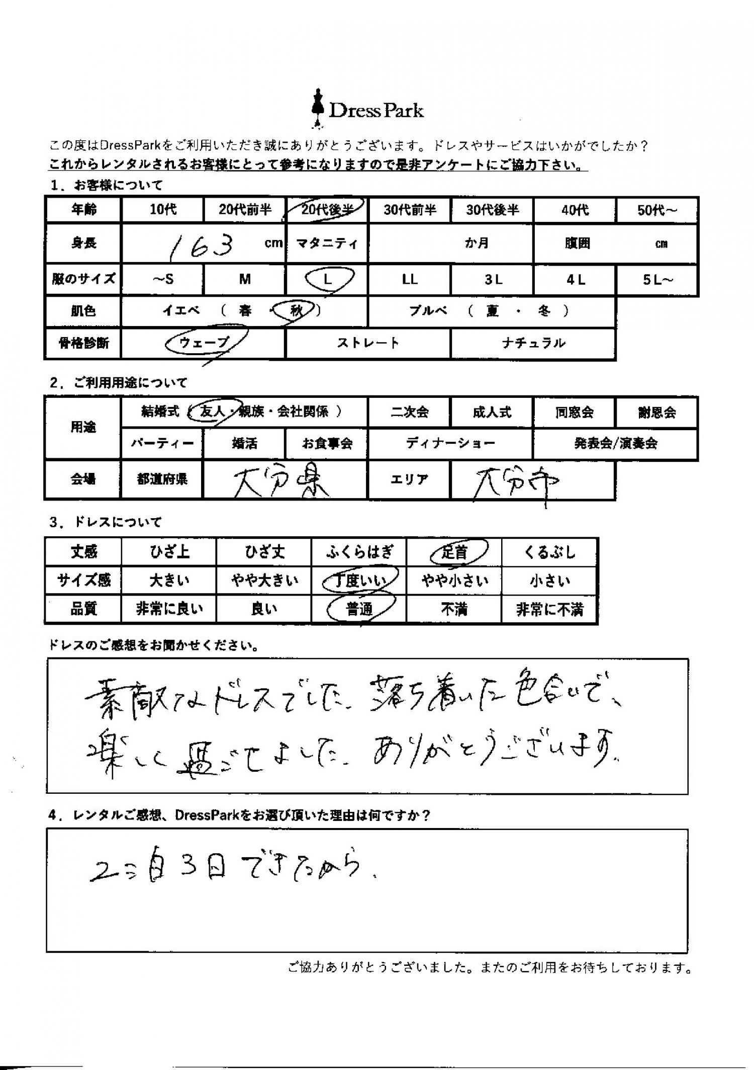 大分県 N.O様163㎝ Lサイズ #20代#M/L#160~164㎝#結婚式(友人)#大分県 ◆レンタルしたドレスはこちら ◆レンタルしたサイズは:L ◆レンタルした日付:2026/02/21 ドレスの着用感 ◆点数: (4点) ◆丈感:足首 ◆サイズ感:丁度いい ◆品質:普通 ◆肌色:イエベ ◆骨格診断:ウェーブ ドレスの感想 素敵なドレスでした。落ち着いた色合いで、楽しく過ごせました。ありがとうございます。 レンタルのご感想、DressParkをお選び頂いた理由 2泊3日できたから。 CUSTOMER REVIEWS お客様の声 気になるカテゴリー別にご利用の感想をチェック! ◆AGE 年代で見る 10代 20代 30代 40代 50代~ ◆SIZE サイズで見る SS/S M/L 大きいサイズLL~ ◆HIGHT 身長で見る 140~149㎝ 150~154㎝ 155~159㎝ 160~164㎝ 165~169㎝ 170㎝以上 ◆マタニティ ~3か月 4~6か月 7~8か月 9~10か月 ◆肌色 イエベ ブルべ ◆骨格診断 ウェーブ ストレート ナチュラル ◆利用シーン 結婚式(友人) 結婚式(親族) 結婚式(会社関係) 二次会 成人式/同窓会 謝恩会 パーティー その他 CUSTOMER REVIEWS都道府県別お客様の声 都道府県別にのお客様の声をチェック! 北海道 青森県 岩手県 宮城県 秋田県 山形県 福島県 茨城県 栃木県 群馬県 埼玉県 千葉県 東京都 神奈川県 新潟県 富山県 石川県 福井県 山梨県 長野県 岐阜県 静岡県 愛知県 三重県 滋賀県 京都府 大阪府 兵庫県 奈良県 和歌山県 鳥取県 島根県 岡山県 広島県 山口県 徳島県 香川県 愛媛県 高知県 福岡県 佐賀県 長崎県 熊本県 大分県 宮崎県 鹿児島県 沖縄県 CUSTOMER REVIEWSエリア別お客様の声 都道府県別にのお客様の声をチェック! 札幌 仙台 名古屋 軽井沢 金沢 神戸・芦屋 博多 那覇 梅田・新大阪 難波・心斎橋 鎌倉・湘南 横浜・みなとみらい 舞浜・浦安・幕張 大宮・浦和 青山・表参道 六本木・麻布 渋谷・恵比寿 新宿 池袋 銀座・丸の内 お台場・汐留 鹿児島市 郡山市 福島市 東予 甲府・石和 LINEでお問い合わせ このサイトではJavaScriptを使用しています