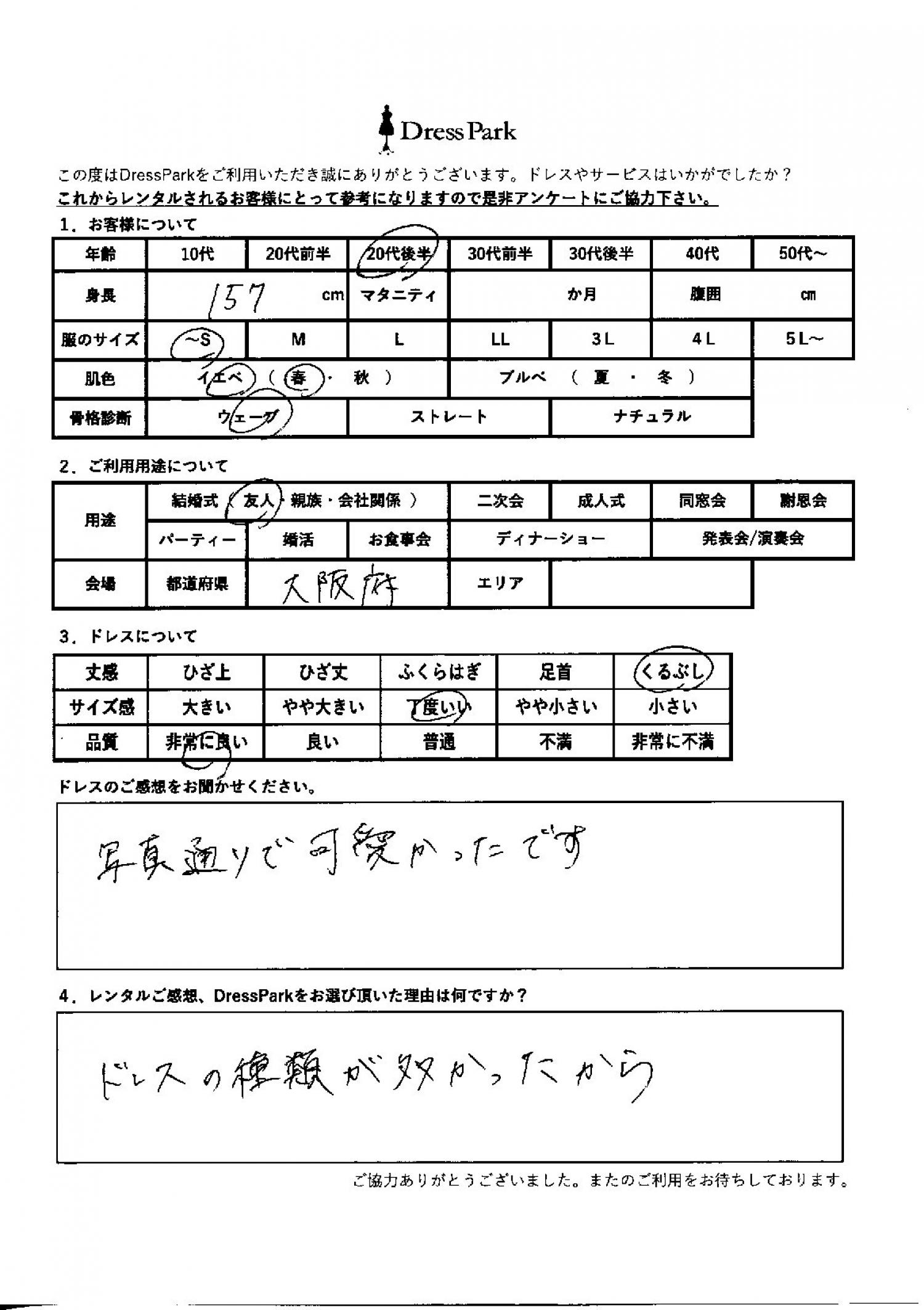 大阪府 M.M様157㎝ ~Sサイズ #20代#SS/S#155~159㎝#結婚式(友人)#大阪府 ◆レンタルしたドレスはこちら ◆レンタルしたサイズは:M ◆レンタルした日付:2026/02/21 ドレスの着用感 ◆点数: (5点) ◆丈感:くるぶし ◆サイズ感:丁度いい ◆品質:非常に良い ◆肌色:イエベ ◆骨格診断:ウェーブ ドレスの感想 写真通りで可愛かったです。 レンタルのご感想、DressParkをお選び頂いた理由 ドレスの種類が多かったから。 CUSTOMER REVIEWS お客様の声 気になるカテゴリー別にご利用の感想をチェック! ◆AGE 年代で見る 10代 20代 30代 40代 50代~ ◆SIZE サイズで見る SS/S M/L 大きいサイズLL~ ◆HIGHT 身長で見る 140~149㎝ 150~154㎝ 155~159㎝ 160~164㎝ 165~169㎝ 170㎝以上 ◆マタニティ ~3か月 4~6か月 7~8か月 9~10か月 ◆肌色 イエベ ブルべ ◆骨格診断 ウェーブ ストレート ナチュラル ◆利用シーン 結婚式(友人) 結婚式(親族) 結婚式(会社関係) 二次会 成人式/同窓会 謝恩会 パーティー その他 CUSTOMER REVIEWS都道府県別お客様の声 都道府県別にのお客様の声をチェック! 北海道 青森県 岩手県 宮城県 秋田県 山形県 福島県 茨城県 栃木県 群馬県 埼玉県 千葉県 東京都 神奈川県 新潟県 富山県 石川県 福井県 山梨県 長野県 岐阜県 静岡県 愛知県 三重県 滋賀県 京都府 大阪府 兵庫県 奈良県 和歌山県 鳥取県 島根県 岡山県 広島県 山口県 徳島県 香川県 愛媛県 高知県 福岡県 佐賀県 長崎県 熊本県 大分県 宮崎県 鹿児島県 沖縄県 CUSTOMER REVIEWSエリア別お客様の声 都道府県別にのお客様の声をチェック! 札幌 仙台 名古屋 軽井沢 金沢 神戸・芦屋 博多 那覇 梅田・新大阪 難波・心斎橋 鎌倉・湘南 横浜・みなとみらい 舞浜・浦安・幕張 大宮・浦和 青山・表参道 六本木・麻布 渋谷・恵比寿 新宿 池袋 銀座・丸の内 お台場・汐留 鹿児島市 郡山市 福島市 東予 甲府・石和 LINEでお問い合わせ このサイトではJavaScriptを使用しています