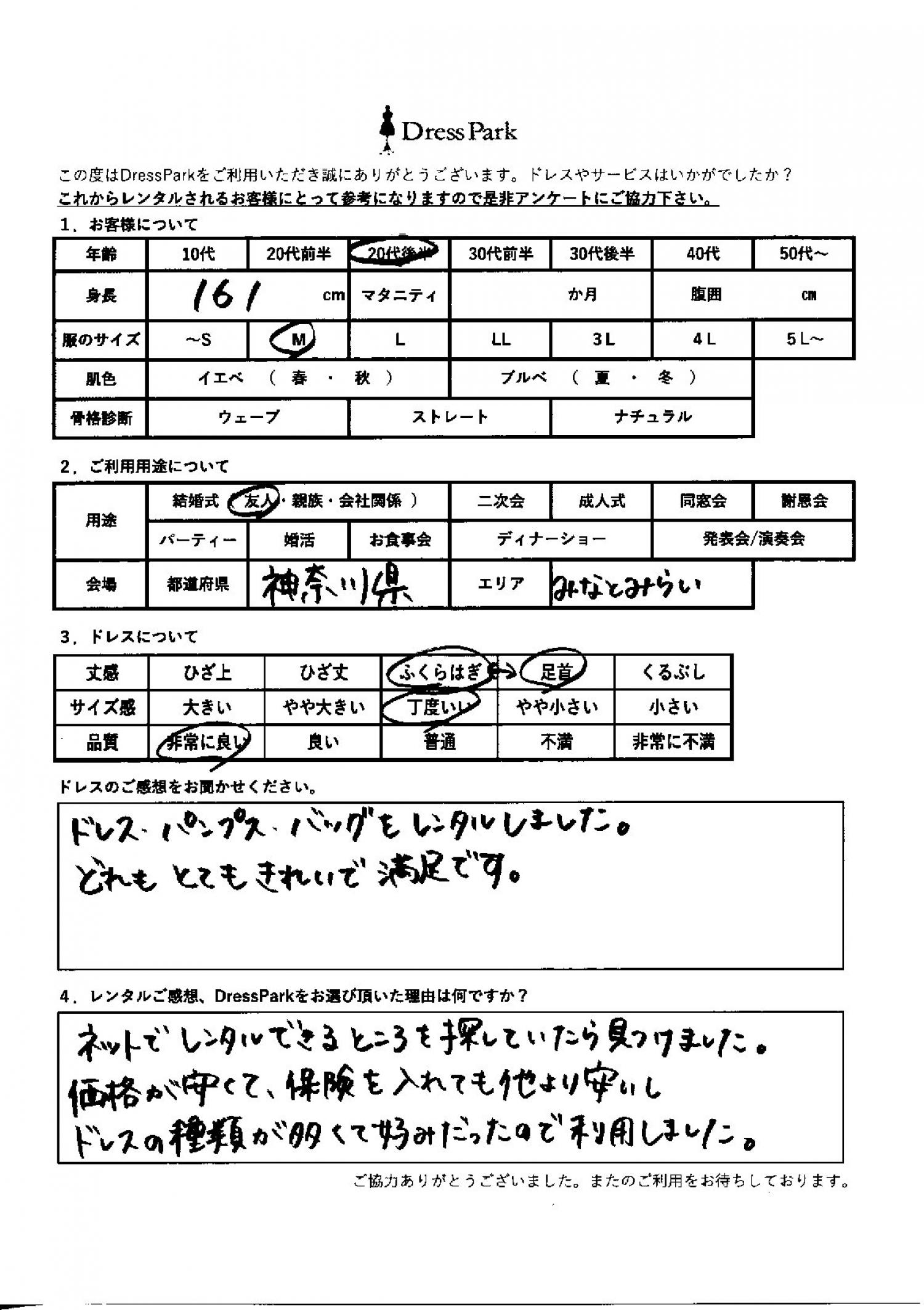 ドレス、パンプス、バッグをレンタルしました。どれもとてもきれいで満足です。レンタルのご感想、