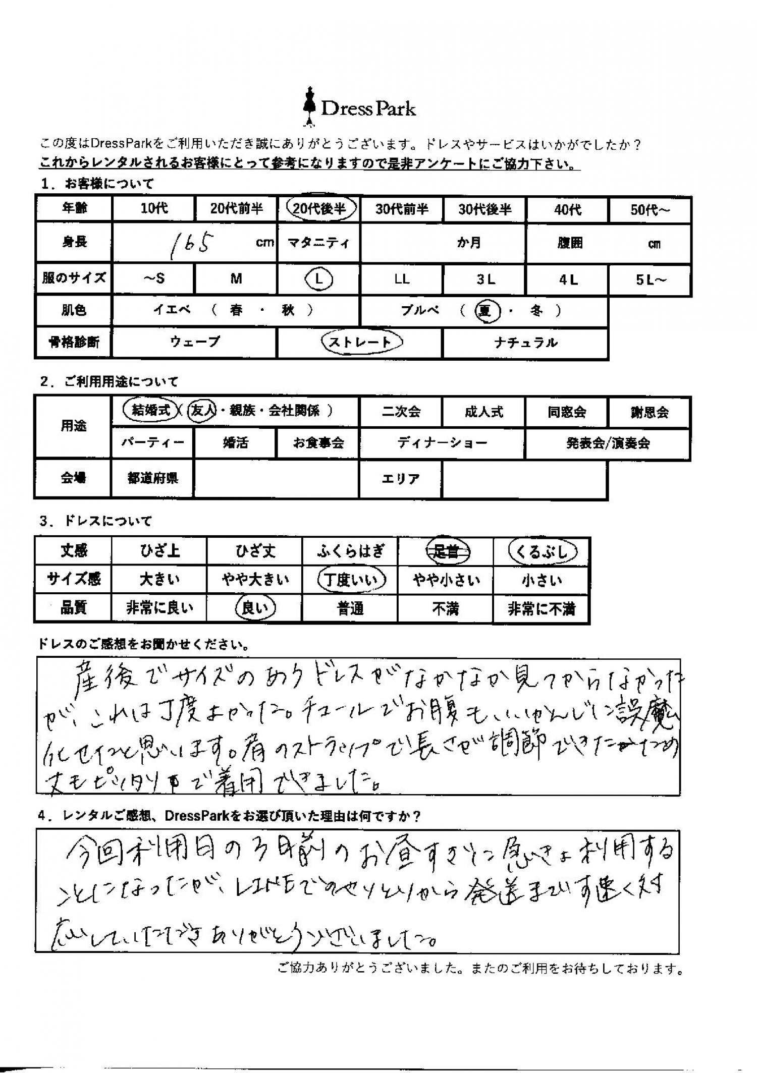 産後でサイズの合うドレスがなかなか見つからなかったが、これはちょうどよかった。チュールでお腹もいい感じにごまかせたと思います。肩のストラップで長さが調節できたため、丈もぴったりで着用できました。レンタルのご感想、