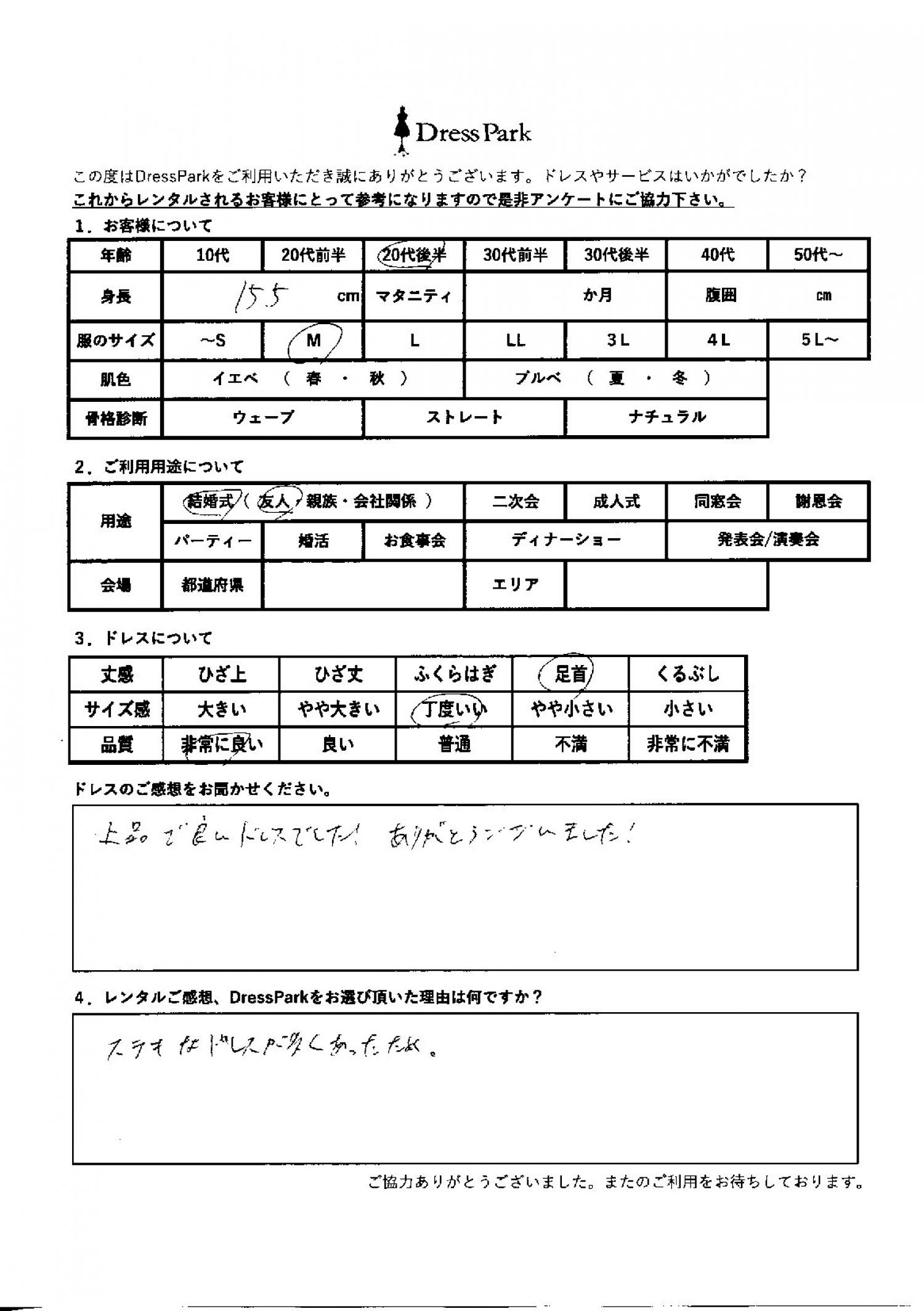 北海道 Y.I様155㎝ Mサイズ #20代#M/L#155~159㎝#結婚式(友人)#北海道 ◆レンタルしたドレスはこちら ◆レンタルしたサイズは:M ◆レンタルした日付:2025/02/21 ドレスの着用感 ◆点数: (5点) ◆丈感:足首 ◆サイズ感:丁度いい ◆品質:非常に良い ドレスの感想 上品で良いドレスでした!ありがとうございました! レンタルのご感想、DressParkをお選び頂いた理由 素敵なドレスが多くあったため CUSTOMER REVIEWS お客様の声 気になるカテゴリー別にご利用の感想をチェック! ◆AGE 年代で見る 10代 20代 30代 40代 50代~ ◆SIZE サイズで見る SS/S M/L 大きいサイズLL~ ◆HIGHT 身長で見る 140~149㎝ 150~154㎝ 155~159㎝ 160~164㎝ 165~169㎝ 170㎝以上 ◆マタニティ ~3か月 4~6か月 7~8か月 9~10か月 ◆肌色 イエベ ブルべ ◆骨格診断 ウェーブ ストレート ナチュラル ◆利用シーン 結婚式(友人) 結婚式(親族) 結婚式(会社関係) 二次会 成人式/同窓会 謝恩会 パーティー その他 CUSTOMER REVIEWS都道府県別お客様の声 都道府県別にのお客様の声をチェック! 北海道 青森県 岩手県 宮城県 秋田県 山形県 福島県 茨城県 栃木県 群馬県 埼玉県 千葉県 東京都 神奈川県 新潟県 富山県 石川県 福井県 山梨県 長野県 岐阜県 静岡県 愛知県 三重県 滋賀県 京都府 大阪府 兵庫県 奈良県 和歌山県 鳥取県 島根県 岡山県 広島県 山口県 徳島県 香川県 愛媛県 高知県 福岡県 佐賀県 長崎県 熊本県 大分県 宮崎県 鹿児島県 沖縄県 CUSTOMER REVIEWSエリア別お客様の声 都道府県別にのお客様の声をチェック! 札幌 仙台 名古屋 軽井沢 金沢 神戸・芦屋 博多 那覇 梅田・新大阪 難波・心斎橋 鎌倉・湘南 横浜・みなとみらい 舞浜・浦安・幕張 大宮・浦和 青山・表参道 六本木・麻布 渋谷・恵比寿 新宿 池袋 銀座・丸の内 お台場・汐留 鹿児島市 郡山市 福島市 東予 甲府・石和 LINEでお問い合わせ このサイトではJavaScriptを使用しています
