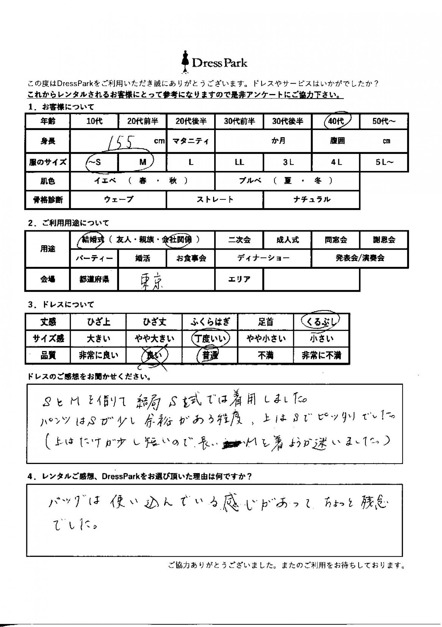 SサイズとMサイズを借りて、結局Sを式では着用しました。パンツはSが少し余裕がある程度、上はSでぴったりでした。(上は丈が少し短いので、長いMサイズを着ようか迷いました。)レンタルのご感想、