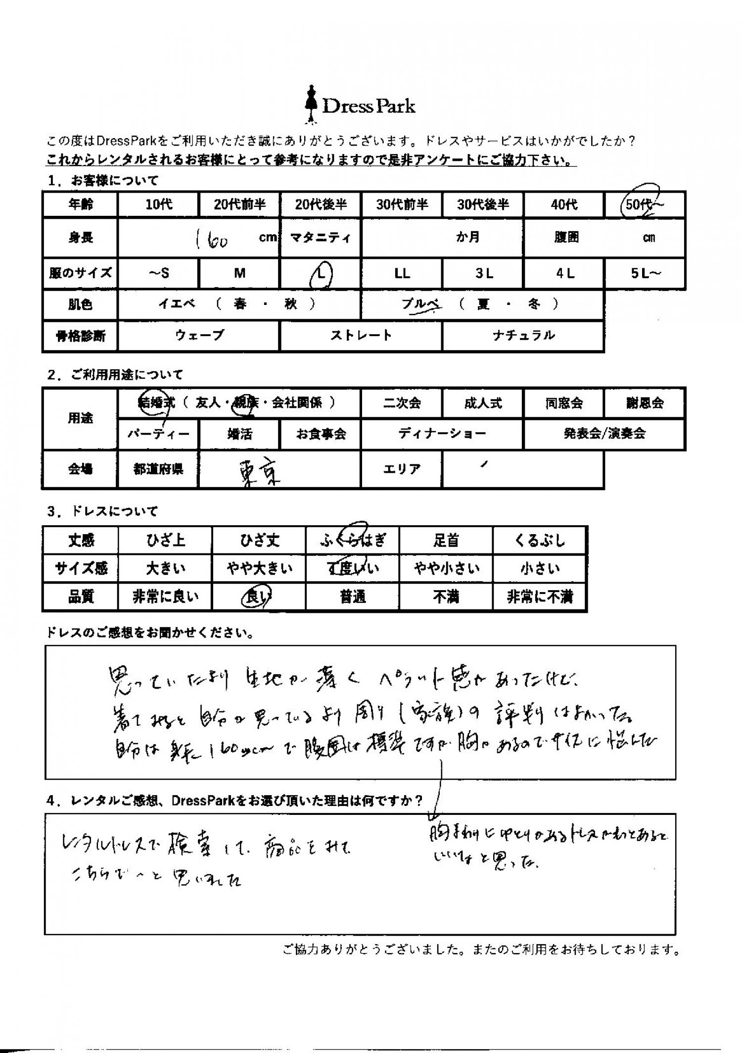思っていたより生地が薄くペラっと感があったけど、着てみると自分が思っているより周り(家族)の評判は良かった。私は身長160cmで腹囲は標準ですが、胸があるのでサイズに悩んだ。胸回りにゆとりがあるドレスがもっとあるといいなと思った。レンタルのご感想、