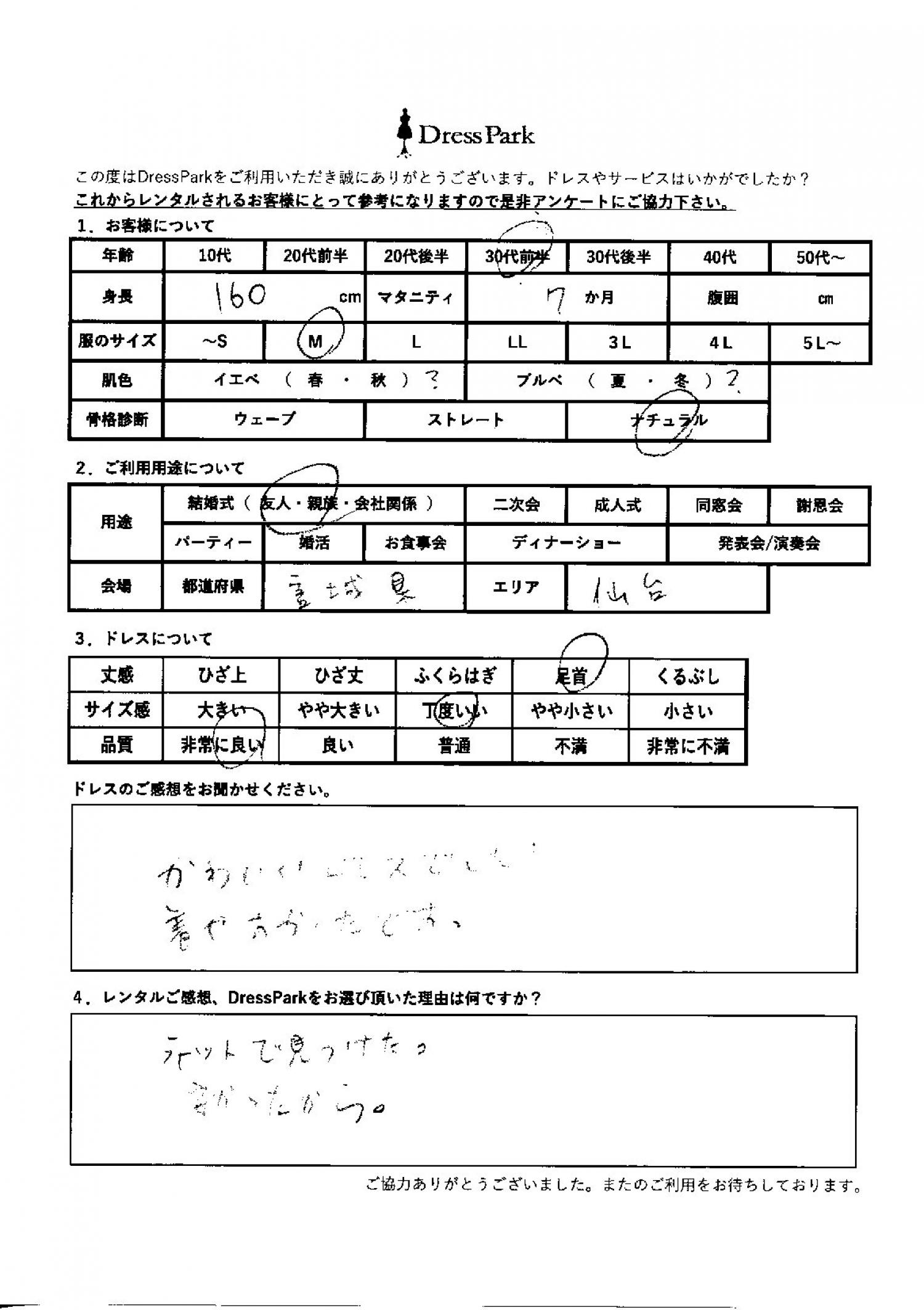 宮城県 M.S様160㎝ Mサイズ仙台 マタニティ #30代#M/L#160~164㎝#結婚式(友人)#宮城県#仙台 ◆レンタルしたドレスはこちら ◆レンタルしたサイズは:M ◆レンタルした日付:2026/02/22 ドレスの着用感 ◆点数: (5点) ◆丈感:足首 ◆サイズ感:丁度いい ◆品質:非常に良い ◆マタニティ:7ヶ月 ◆骨格診断:ナチュラル ドレスの感想 かわいいドレスでした!着やすかったです。 レンタルのご感想、DressParkをお選び頂いた理由 ネットで見つけた。安かったから。 CUSTOMER REVIEWS お客様の声 気になるカテゴリー別にご利用の感想をチェック! ◆AGE 年代で見る 10代 20代 30代 40代 50代~ ◆SIZE サイズで見る SS/S M/L 大きいサイズLL~ ◆HIGHT 身長で見る 140~149㎝ 150~154㎝ 155~159㎝ 160~164㎝ 165~169㎝ 170㎝以上 ◆マタニティ ~3か月 4~6か月 7~8か月 9~10か月 ◆肌色 イエベ ブルべ ◆骨格診断 ウェーブ ストレート ナチュラル ◆利用シーン 結婚式(友人) 結婚式(親族) 結婚式(会社関係) 二次会 成人式/同窓会 謝恩会 パーティー その他 CUSTOMER REVIEWS都道府県別お客様の声 都道府県別にのお客様の声をチェック! 北海道 青森県 岩手県 宮城県 秋田県 山形県 福島県 茨城県 栃木県 群馬県 埼玉県 千葉県 東京都 神奈川県 新潟県 富山県 石川県 福井県 山梨県 長野県 岐阜県 静岡県 愛知県 三重県 滋賀県 京都府 大阪府 兵庫県 奈良県 和歌山県 鳥取県 島根県 岡山県 広島県 山口県 徳島県 香川県 愛媛県 高知県 福岡県 佐賀県 長崎県 熊本県 大分県 宮崎県 鹿児島県 沖縄県 CUSTOMER REVIEWSエリア別お客様の声 都道府県別にのお客様の声をチェック! 札幌 仙台 名古屋 軽井沢 金沢 神戸・芦屋 博多 那覇 梅田・新大阪 難波・心斎橋 鎌倉・湘南 横浜・みなとみらい 舞浜・浦安・幕張 大宮・浦和 青山・表参道 六本木・麻布 渋谷・恵比寿 新宿 池袋 銀座・丸の内 お台場・汐留 鹿児島市 郡山市 福島市 東予 甲府・石和 LINEでお問い合わせ このサイトではJavaScriptを使用しています