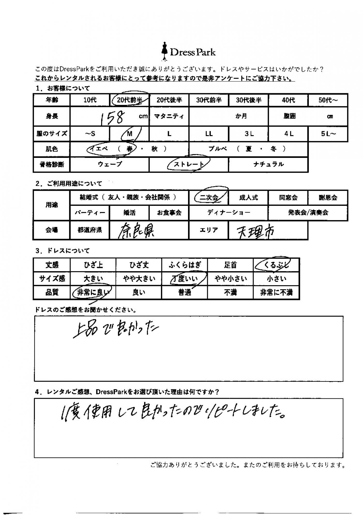 奈良県 S.K様158㎝ Mサイズ #20代#M/L#155~159㎝#二次会#奈良県 ◆レンタルしたドレスはこちら ◆レンタルしたサイズは:M ◆レンタルした日付:2026/02/22 ドレスの着用感 ◆点数: (5点) ◆丈感:くるぶし ◆サイズ感:丁度いい ◆品質:非常に良い ◆肌色:イエベ ◆骨格診断:ストレート ドレスの感想 商品で良かった。 レンタルのご感想、DressParkをお選び頂いた理由 1度使用して良かったので、リピートしました。 CUSTOMER REVIEWS お客様の声 気になるカテゴリー別にご利用の感想をチェック! ◆AGE 年代で見る 10代 20代 30代 40代 50代~ ◆SIZE サイズで見る SS/S M/L 大きいサイズLL~ ◆HIGHT 身長で見る 140~149㎝ 150~154㎝ 155~159㎝ 160~164㎝ 165~169㎝ 170㎝以上 ◆マタニティ ~3か月 4~6か月 7~8か月 9~10か月 ◆肌色 イエベ ブルべ ◆骨格診断 ウェーブ ストレート ナチュラル ◆利用シーン 結婚式(友人) 結婚式(親族) 結婚式(会社関係) 二次会 成人式/同窓会 謝恩会 パーティー その他 CUSTOMER REVIEWS都道府県別お客様の声 都道府県別にのお客様の声をチェック! 北海道 青森県 岩手県 宮城県 秋田県 山形県 福島県 茨城県 栃木県 群馬県 埼玉県 千葉県 東京都 神奈川県 新潟県 富山県 石川県 福井県 山梨県 長野県 岐阜県 静岡県 愛知県 三重県 滋賀県 京都府 大阪府 兵庫県 奈良県 和歌山県 鳥取県 島根県 岡山県 広島県 山口県 徳島県 香川県 愛媛県 高知県 福岡県 佐賀県 長崎県 熊本県 大分県 宮崎県 鹿児島県 沖縄県 CUSTOMER REVIEWSエリア別お客様の声 都道府県別にのお客様の声をチェック! 札幌 仙台 名古屋 軽井沢 金沢 神戸・芦屋 博多 那覇 梅田・新大阪 難波・心斎橋 鎌倉・湘南 横浜・みなとみらい 舞浜・浦安・幕張 大宮・浦和 青山・表参道 六本木・麻布 渋谷・恵比寿 新宿 池袋 銀座・丸の内 お台場・汐留 鹿児島市 郡山市 福島市 東予 甲府・石和 LINEでお問い合わせ このサイトではJavaScriptを使用しています
