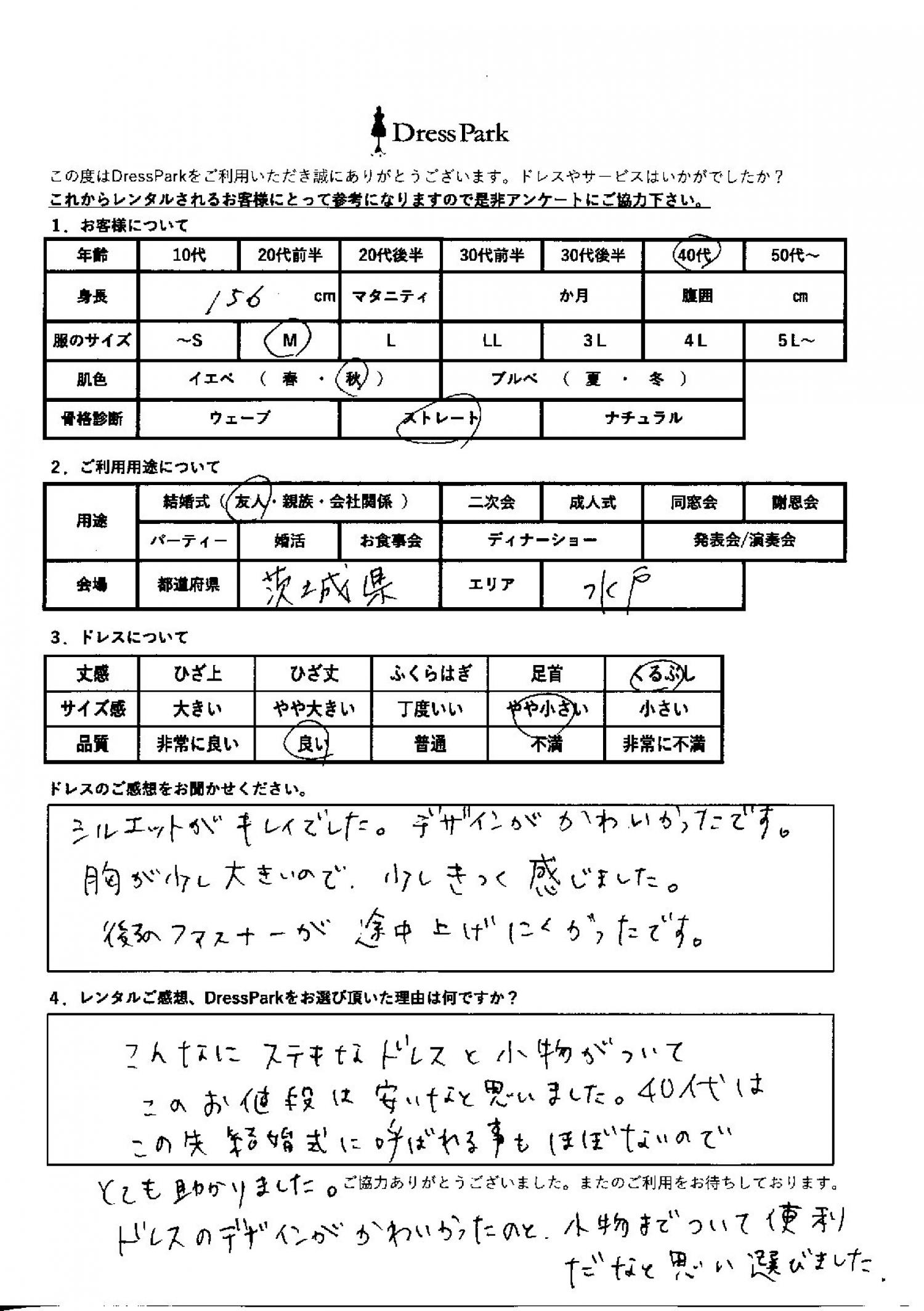 こんなに素敵なドレスと小物がついてこのお値段は安いなと思いました。40代は、この先結婚式に呼ばれることもほぼないのでとても助かりました。ドレスのデザインが可愛かったのと、小物までついて便利だなと思い選びました。