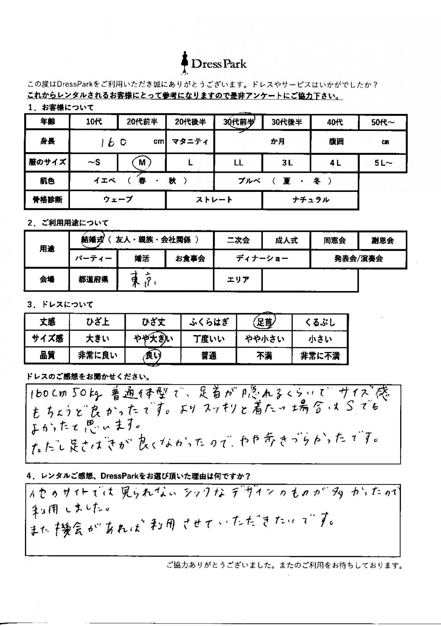160cm50kg普通体型で、足首が隠れる位でサイズ感もちょうど良かったです。よりすっきりと着たい場合はSサイズでも良かったと思います。ただし、足さばきが良くなかったので、やや歩きづらかったです。レンタルのご感想、