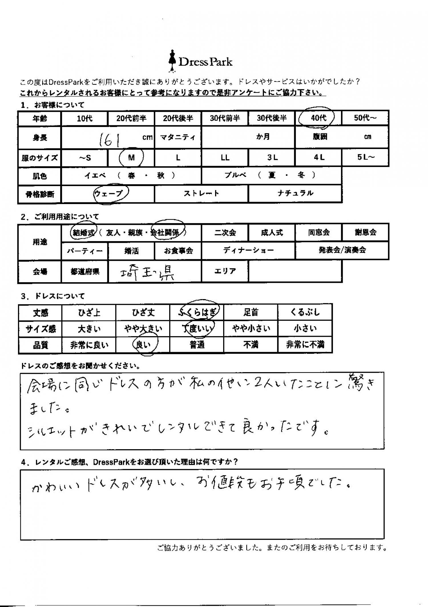埼玉県 M.K様161㎝ Mサイズ #40代#M/L#160~164㎝#結婚式(会社関係)#埼玉県 ◆レンタルしたドレスはこちら ◆レンタルしたサイズは:M ◆レンタルした日付:2026/02/23 ドレスの着用感 ◆点数: (4点) ◆丈感:ふくらはぎ ◆サイズ感:丁度いい ◆品質:良い ◆骨格診断:ウェーブ ドレスの感想 会場に同じドレスの方が私の他に2人いたことに驚きました。シルエットが綺麗でレンタルできてよかったです。 レンタルのご感想、DressParkをお選び頂いた理由 かわいいドレスが多いし、お値段も手頃でした。 CUSTOMER REVIEWS お客様の声 気になるカテゴリー別にご利用の感想をチェック! ◆AGE 年代で見る 10代 20代 30代 40代 50代~ ◆SIZE サイズで見る SS/S M/L 大きいサイズLL~ ◆HIGHT 身長で見る 140~149㎝ 150~154㎝ 155~159㎝ 160~164㎝ 165~169㎝ 170㎝以上 ◆マタニティ ~3か月 4~6か月 7~8か月 9~10か月 ◆肌色 イエベ ブルべ ◆骨格診断 ウェーブ ストレート ナチュラル ◆利用シーン 結婚式(友人) 結婚式(親族) 結婚式(会社関係) 二次会 成人式/同窓会 謝恩会 パーティー その他 CUSTOMER REVIEWS都道府県別お客様の声 都道府県別にのお客様の声をチェック! 北海道 青森県 岩手県 宮城県 秋田県 山形県 福島県 茨城県 栃木県 群馬県 埼玉県 千葉県 東京都 神奈川県 新潟県 富山県 石川県 福井県 山梨県 長野県 岐阜県 静岡県 愛知県 三重県 滋賀県 京都府 大阪府 兵庫県 奈良県 和歌山県 鳥取県 島根県 岡山県 広島県 山口県 徳島県 香川県 愛媛県 高知県 福岡県 佐賀県 長崎県 熊本県 大分県 宮崎県 鹿児島県 沖縄県 CUSTOMER REVIEWSエリア別お客様の声 都道府県別にのお客様の声をチェック! 札幌 仙台 名古屋 軽井沢 金沢 神戸・芦屋 博多 那覇 梅田・新大阪 難波・心斎橋 鎌倉・湘南 横浜・みなとみらい 舞浜・浦安・幕張 大宮・浦和 青山・表参道 六本木・麻布 渋谷・恵比寿 新宿 池袋 銀座・丸の内 お台場・汐留 鹿児島市 郡山市 福島市 東予 甲府・石和 LINEでお問い合わせ このサイトではJavaScriptを使用しています