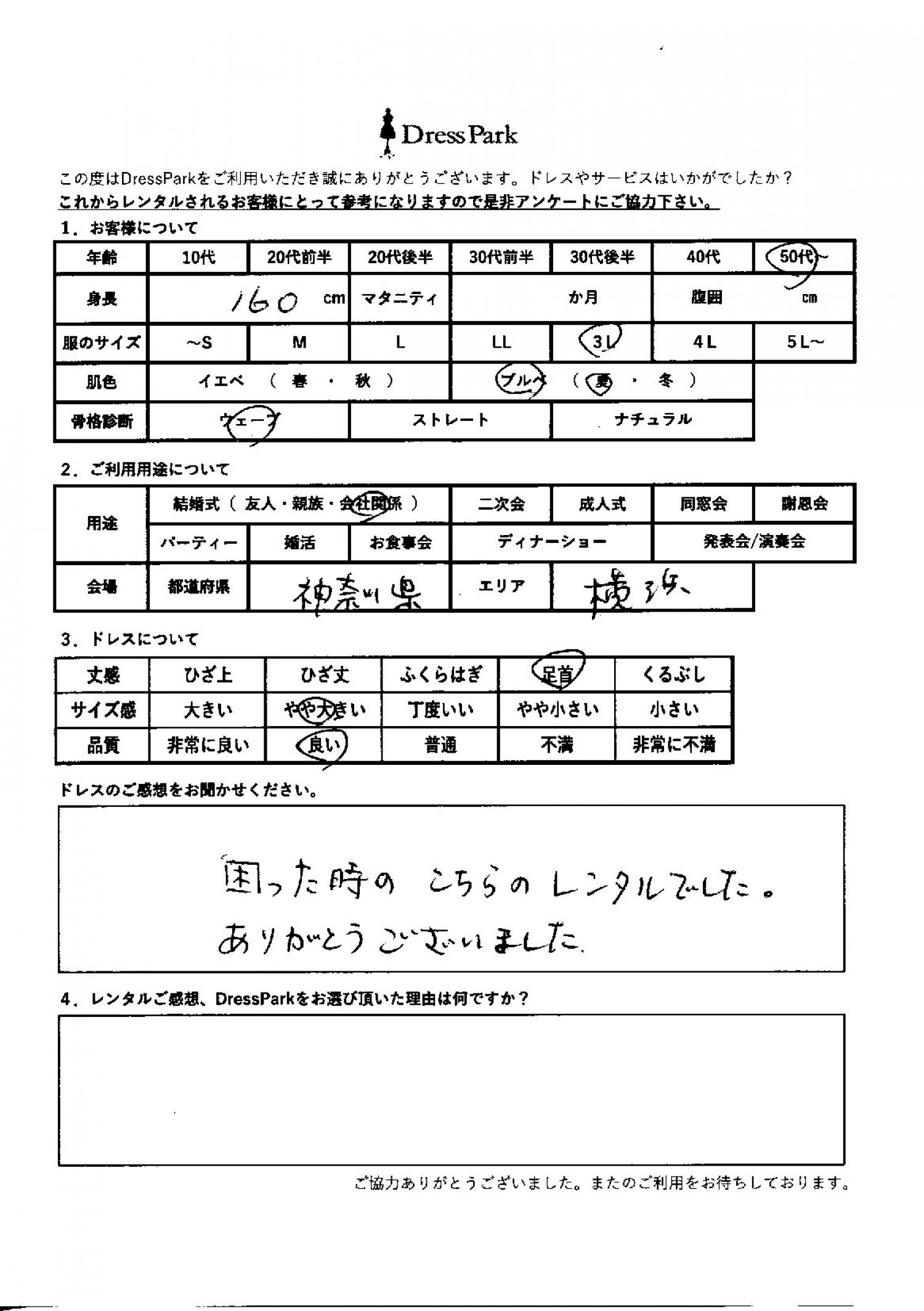 神奈川県 C.Y様160㎝ 3Lサイズ横浜・みなとみらい #50代~#大きいサイズLL~#160~164㎝#結婚式(会社関係)#神奈川県#横浜・みなとみらい ◆レンタルしたドレスはこちら ◆レンタルしたサイズは:3L ◆レンタルした日付:2026/02/25 ドレスの着用感 ◆点数: (4点) ◆丈感:足首 ◆サイズ感:やや大きい ◆品質:良い ◆肌色:ブルべ ◆骨格診断:ウェーブ ドレスの感想 困ったときのこちらのレンタルでした。ありがとうございました。 CUSTOMER REVIEWS お客様の声 気になるカテゴリー別にご利用の感想をチェック! ◆AGE 年代で見る 10代 20代 30代 40代 50代~ ◆SIZE サイズで見る SS/S M/L 大きいサイズLL~ ◆HIGHT 身長で見る 140~149㎝ 150~154㎝ 155~159㎝ 160~164㎝ 165~169㎝ 170㎝以上 ◆マタニティ ~3か月 4~6か月 7~8か月 9~10か月 ◆肌色 イエベ ブルべ ◆骨格診断 ウェーブ ストレート ナチュラル ◆利用シーン 結婚式(友人) 結婚式(親族) 結婚式(会社関係) 二次会 成人式/同窓会 謝恩会 パーティー その他 CUSTOMER REVIEWS都道府県別お客様の声 都道府県別にのお客様の声をチェック! 北海道 青森県 岩手県 宮城県 秋田県 山形県 福島県 茨城県 栃木県 群馬県 埼玉県 千葉県 東京都 神奈川県 新潟県 富山県 石川県 福井県 山梨県 長野県 岐阜県 静岡県 愛知県 三重県 滋賀県 京都府 大阪府 兵庫県 奈良県 和歌山県 鳥取県 島根県 岡山県 広島県 山口県 徳島県 香川県 愛媛県 高知県 福岡県 佐賀県 長崎県 熊本県 大分県 宮崎県 鹿児島県 沖縄県 CUSTOMER REVIEWSエリア別お客様の声 都道府県別にのお客様の声をチェック! 札幌 仙台 名古屋 軽井沢 金沢 神戸・芦屋 博多 那覇 梅田・新大阪 難波・心斎橋 鎌倉・湘南 横浜・みなとみらい 舞浜・浦安・幕張 大宮・浦和 青山・表参道 六本木・麻布 渋谷・恵比寿 新宿 池袋 銀座・丸の内 お台場・汐留 鹿児島市 郡山市 福島市 東予 甲府・石和 LINEでお問い合わせ このサイトではJavaScriptを使用しています
