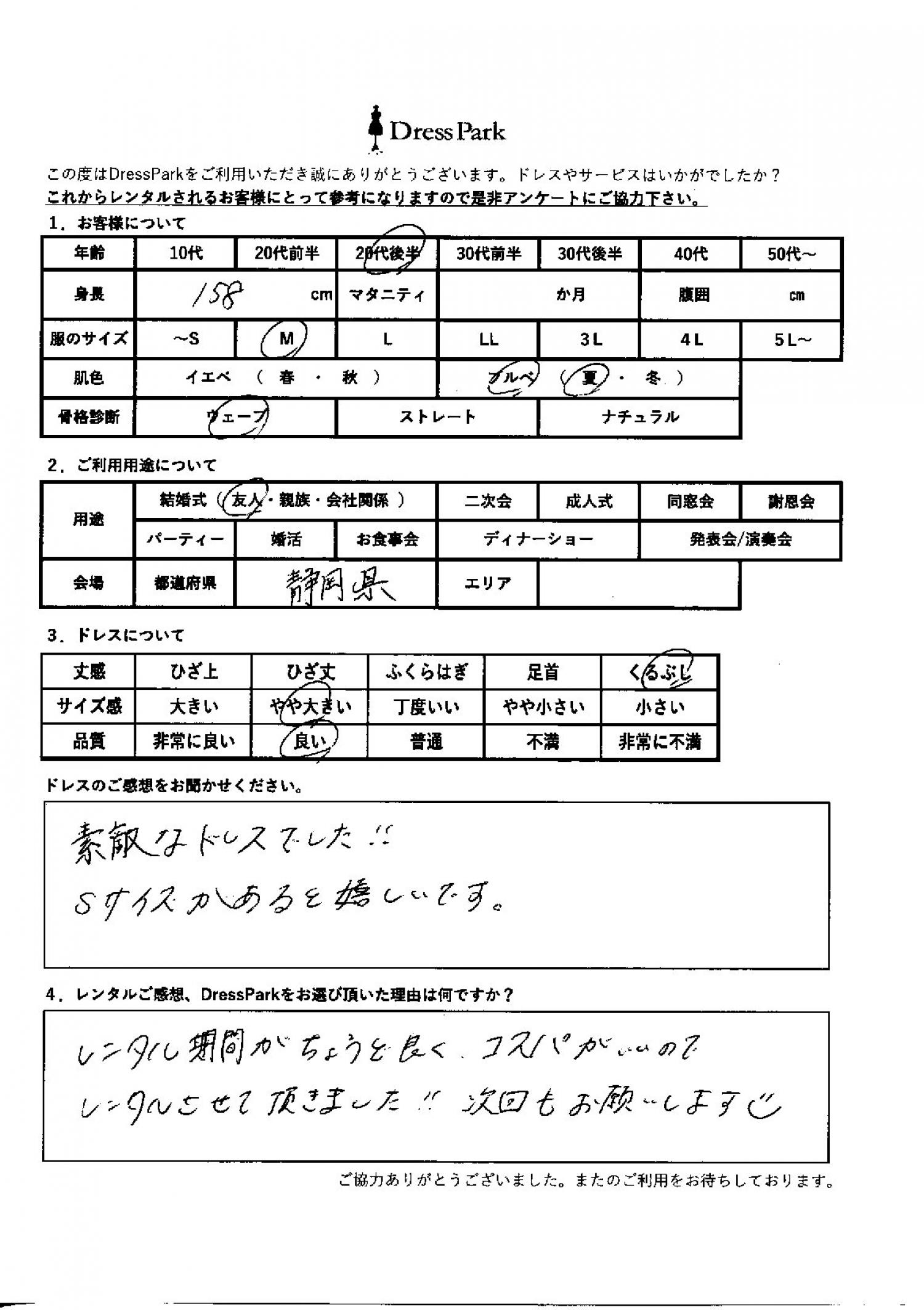 静岡県 A.H様158㎝ Mサイズ #20代#M/L#155~159㎝#結婚式(友人)#静岡県 ◆レンタルしたドレスはこちら ◆レンタルしたサイズは:M ◆レンタルした日付:2026/02/28 ドレスの着用感 ◆点数: (4点) ◆丈感:くるぶし ◆サイズ感:やや大きい ◆品質:良い ◆肌色:ブルべ ◆骨格診断:ウェーブ ドレスの感想 素敵なドレスでした!Sサイズがあると嬉しいです。 レンタルのご感想、DressParkをお選び頂いた理由 レンタル期間がちょうど良く、コスパが良いので、レンタルさせていただきました!次回もお願いします。 CUSTOMER REVIEWS お客様の声 気になるカテゴリー別にご利用の感想をチェック! ◆AGE 年代で見る 10代 20代 30代 40代 50代~ ◆SIZE サイズで見る SS/S M/L 大きいサイズLL~ ◆HIGHT 身長で見る 140~149㎝ 150~154㎝ 155~159㎝ 160~164㎝ 165~169㎝ 170㎝以上 ◆マタニティ ~3か月 4~6か月 7~8か月 9~10か月 ◆肌色 イエベ ブルべ ◆骨格診断 ウェーブ ストレート ナチュラル ◆利用シーン 結婚式(友人) 結婚式(親族) 結婚式(会社関係) 二次会 成人式/同窓会 謝恩会 パーティー その他 CUSTOMER REVIEWS都道府県別お客様の声 都道府県別にのお客様の声をチェック! 北海道 青森県 岩手県 宮城県 秋田県 山形県 福島県 茨城県 栃木県 群馬県 埼玉県 千葉県 東京都 神奈川県 新潟県 富山県 石川県 福井県 山梨県 長野県 岐阜県 静岡県 愛知県 三重県 滋賀県 京都府 大阪府 兵庫県 奈良県 和歌山県 鳥取県 島根県 岡山県 広島県 山口県 徳島県 香川県 愛媛県 高知県 福岡県 佐賀県 長崎県 熊本県 大分県 宮崎県 鹿児島県 沖縄県 CUSTOMER REVIEWSエリア別お客様の声 都道府県別にのお客様の声をチェック! 札幌 仙台 名古屋 軽井沢 金沢 神戸・芦屋 博多 那覇 梅田・新大阪 難波・心斎橋 鎌倉・湘南 横浜・みなとみらい 舞浜・浦安・幕張 大宮・浦和 青山・表参道 六本木・麻布 渋谷・恵比寿 新宿 池袋 銀座・丸の内 お台場・汐留 鹿児島市 郡山市 福島市 東予 甲府・石和 LINEでお問い合わせ このサイトではJavaScriptを使用しています