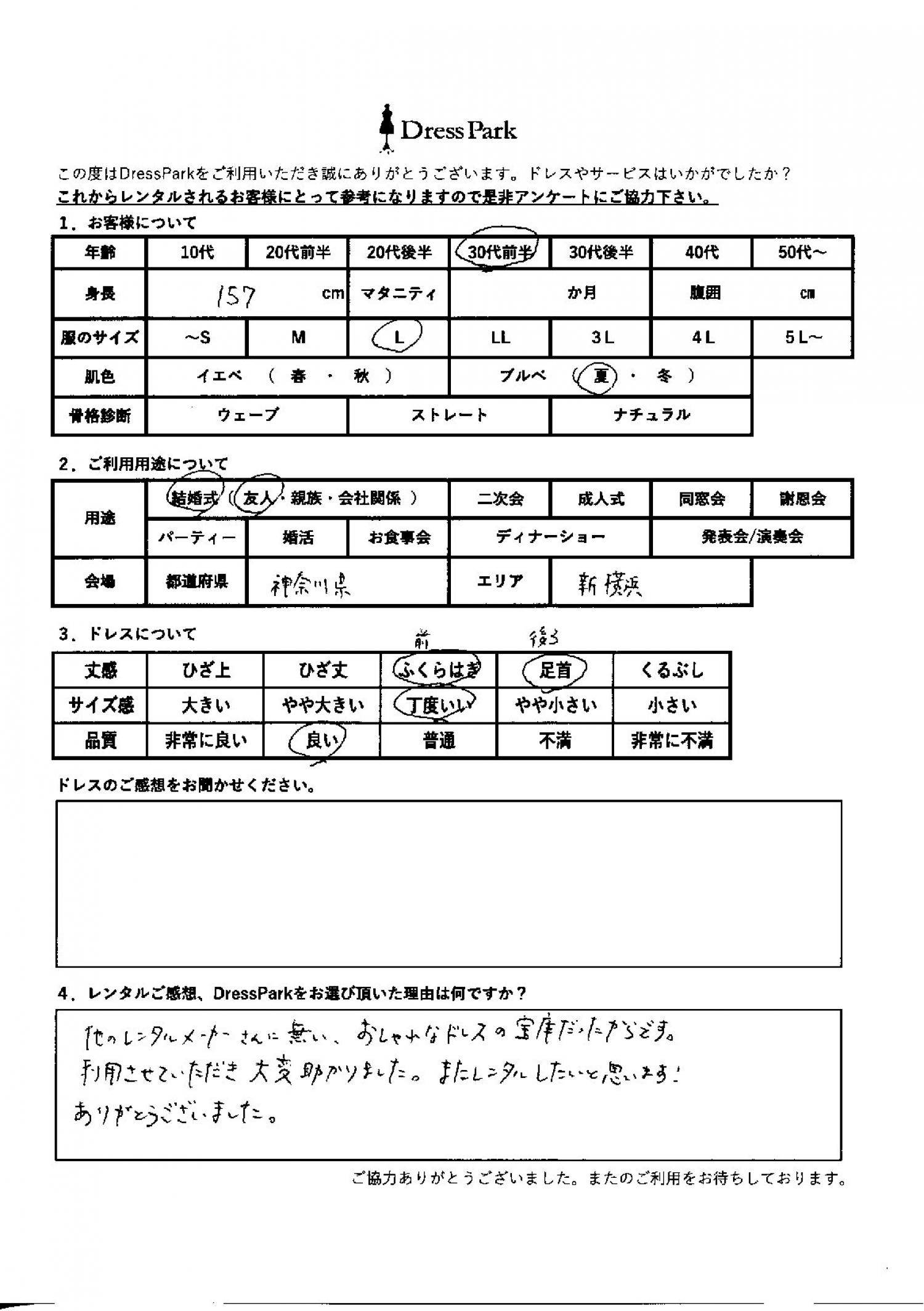 神奈川県 Y.K様157㎝ Lサイズ横浜・みなとみらい #30代#M/L#155~159㎝#結婚式(友人)#神奈川県#横浜・みなとみらい ◆レンタルしたドレスはこちら ◆レンタルしたサイズは:L ◆レンタルした日付:2026/02/28 ドレスの着用感 ◆点数: (4点) ◆丈感:ふくらはぎ ◆サイズ感:丁度いい ◆品質:良い ◆肌色:ブルべ レンタルのご感想、DressParkをお選び頂いた理由 他のレンタルメーカーさんにないおしゃれなドレスの宝庫だったからです。利用させていただき大変助かりました。またレンタルしたいと思います!ありがとうございました。 CUSTOMER REVIEWS お客様の声 気になるカテゴリー別にご利用の感想をチェック! ◆AGE 年代で見る 10代 20代 30代 40代 50代~ ◆SIZE サイズで見る SS/S M/L 大きいサイズLL~ ◆HIGHT 身長で見る 140~149㎝ 150~154㎝ 155~159㎝ 160~164㎝ 165~169㎝ 170㎝以上 ◆マタニティ ~3か月 4~6か月 7~8か月 9~10か月 ◆肌色 イエベ ブルべ ◆骨格診断 ウェーブ ストレート ナチュラル ◆利用シーン 結婚式(友人) 結婚式(親族) 結婚式(会社関係) 二次会 成人式/同窓会 謝恩会 パーティー その他 CUSTOMER REVIEWS都道府県別お客様の声 都道府県別にのお客様の声をチェック! 北海道 青森県 岩手県 宮城県 秋田県 山形県 福島県 茨城県 栃木県 群馬県 埼玉県 千葉県 東京都 神奈川県 新潟県 富山県 石川県 福井県 山梨県 長野県 岐阜県 静岡県 愛知県 三重県 滋賀県 京都府 大阪府 兵庫県 奈良県 和歌山県 鳥取県 島根県 岡山県 広島県 山口県 徳島県 香川県 愛媛県 高知県 福岡県 佐賀県 長崎県 熊本県 大分県 宮崎県 鹿児島県 沖縄県 CUSTOMER REVIEWSエリア別お客様の声 都道府県別にのお客様の声をチェック! 札幌 仙台 名古屋 軽井沢 金沢 神戸・芦屋 博多 那覇 梅田・新大阪 難波・心斎橋 鎌倉・湘南 横浜・みなとみらい 舞浜・浦安・幕張 大宮・浦和 青山・表参道 六本木・麻布 渋谷・恵比寿 新宿 池袋 銀座・丸の内 お台場・汐留 鹿児島市 郡山市 福島市 東予 甲府・石和 LINEでお問い合わせ このサイトではJavaScriptを使用しています