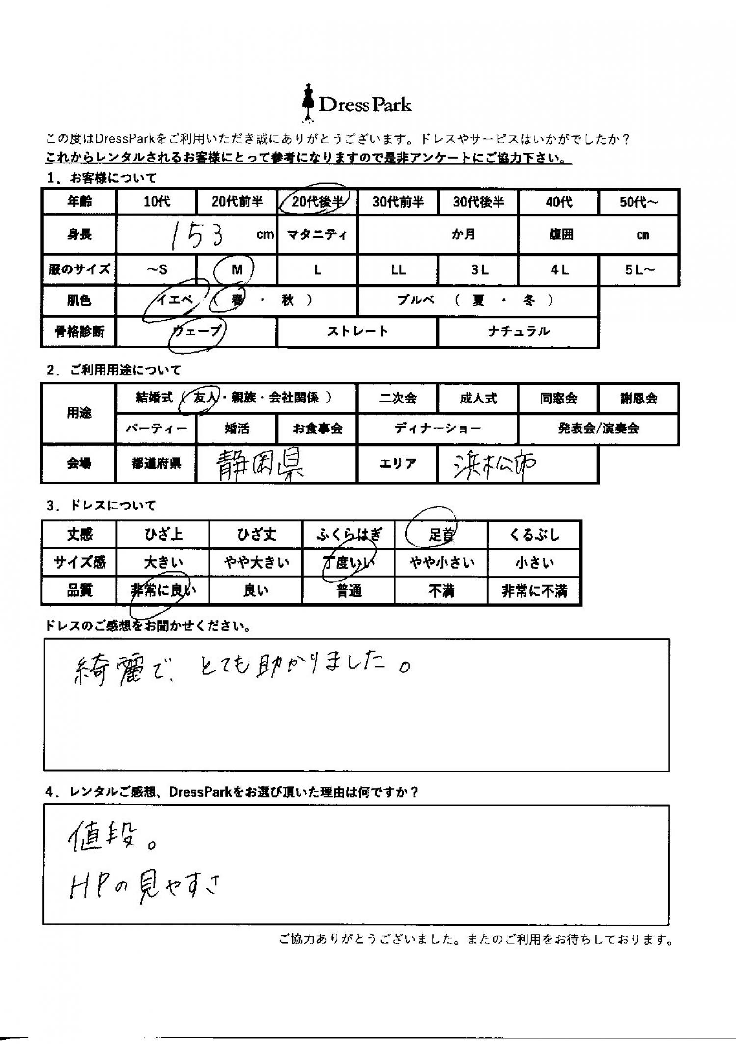 静岡県 A.S様153㎝ Mサイズ #20代#M/L#150~154㎝#結婚式(友人)#静岡県 ◆レンタルしたドレスはこちら ◆レンタルしたサイズは:M ◆レンタルした日付:2026/02/28 ドレスの着用感 ◆点数: (5点) ◆丈感:足首 ◆サイズ感:丁度いい ◆品質:非常に良い ◆肌色:イエベ ◆骨格診断:ウェーブ ドレスの感想 綺麗でとても助かりました。 レンタルのご感想、DressParkをお選び頂いた理由 値段。ホームページの見やすさ CUSTOMER REVIEWS お客様の声 気になるカテゴリー別にご利用の感想をチェック! ◆AGE 年代で見る 10代 20代 30代 40代 50代~ ◆SIZE サイズで見る SS/S M/L 大きいサイズLL~ ◆HIGHT 身長で見る 140~149㎝ 150~154㎝ 155~159㎝ 160~164㎝ 165~169㎝ 170㎝以上 ◆マタニティ ~3か月 4~6か月 7~8か月 9~10か月 ◆肌色 イエベ ブルべ ◆骨格診断 ウェーブ ストレート ナチュラル ◆利用シーン 結婚式(友人) 結婚式(親族) 結婚式(会社関係) 二次会 成人式/同窓会 謝恩会 パーティー その他 CUSTOMER REVIEWS都道府県別お客様の声 都道府県別にのお客様の声をチェック! 北海道 青森県 岩手県 宮城県 秋田県 山形県 福島県 茨城県 栃木県 群馬県 埼玉県 千葉県 東京都 神奈川県 新潟県 富山県 石川県 福井県 山梨県 長野県 岐阜県 静岡県 愛知県 三重県 滋賀県 京都府 大阪府 兵庫県 奈良県 和歌山県 鳥取県 島根県 岡山県 広島県 山口県 徳島県 香川県 愛媛県 高知県 福岡県 佐賀県 長崎県 熊本県 大分県 宮崎県 鹿児島県 沖縄県 CUSTOMER REVIEWSエリア別お客様の声 都道府県別にのお客様の声をチェック! 札幌 仙台 名古屋 軽井沢 金沢 神戸・芦屋 博多 那覇 梅田・新大阪 難波・心斎橋 鎌倉・湘南 横浜・みなとみらい 舞浜・浦安・幕張 大宮・浦和 青山・表参道 六本木・麻布 渋谷・恵比寿 新宿 池袋 銀座・丸の内 お台場・汐留 鹿児島市 郡山市 福島市 東予 甲府・石和 LINEでお問い合わせ このサイトではJavaScriptを使用しています