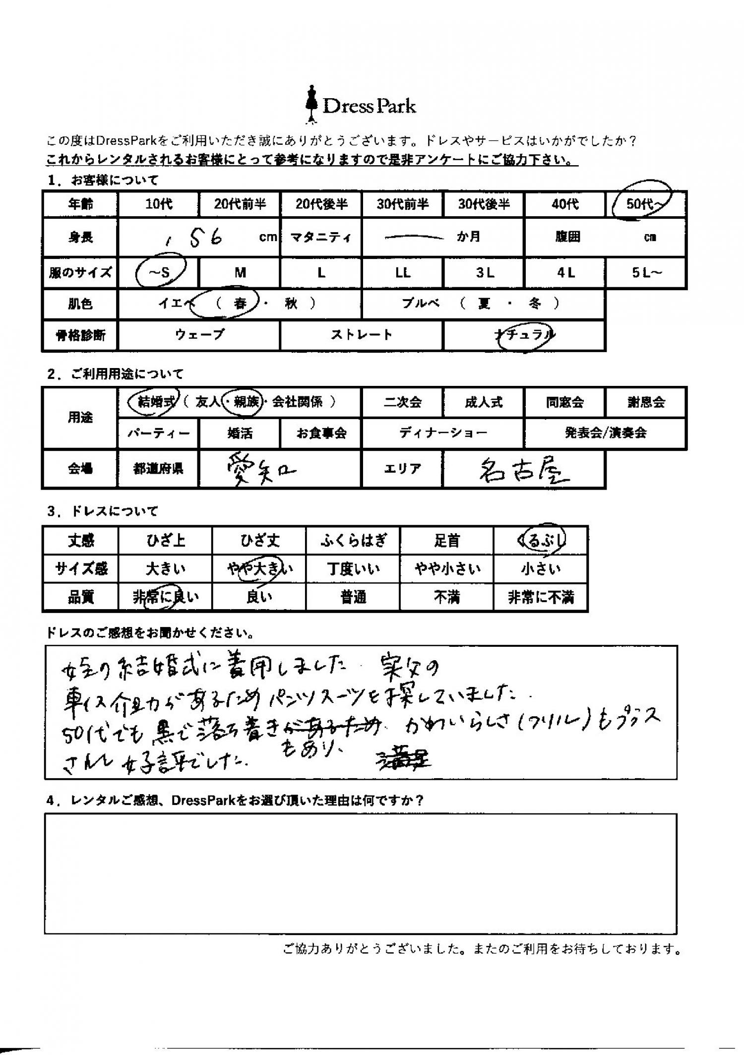 愛知県 K.O様156㎝ ~Sサイズ名古屋 #50代~#SS/S#155~159㎝#結婚式(親族)#愛知県#名古屋 ◆レンタルしたドレスはこちら ◆レンタルしたサイズは:S ◆レンタルした日付:2026/02/28 ドレスの着用感 ◆点数: (5点) ◆丈感:くるぶし ◆サイズ感:やや大きい ◆品質:非常に良い ◆肌色:イエベ ◆骨格診断:ナチュラル ドレスの感想 姪の結婚式に着用しました。実父の車椅子介助があるため、パンツスーツを探していました。50代でも黒で落ち着きもあり、可愛らしさ(フリル)もプラスされ好評でした。 CUSTOMER REVIEWS お客様の声 気になるカテゴリー別にご利用の感想をチェック! ◆AGE 年代で見る 10代 20代 30代 40代 50代~ ◆SIZE サイズで見る SS/S M/L 大きいサイズLL~ ◆HIGHT 身長で見る 140~149㎝ 150~154㎝ 155~159㎝ 160~164㎝ 165~169㎝ 170㎝以上 ◆マタニティ ~3か月 4~6か月 7~8か月 9~10か月 ◆肌色 イエベ ブルべ ◆骨格診断 ウェーブ ストレート ナチュラル ◆利用シーン 結婚式(友人) 結婚式(親族) 結婚式(会社関係) 二次会 成人式/同窓会 謝恩会 パーティー その他 CUSTOMER REVIEWS都道府県別お客様の声 都道府県別にのお客様の声をチェック! 北海道 青森県 岩手県 宮城県 秋田県 山形県 福島県 茨城県 栃木県 群馬県 埼玉県 千葉県 東京都 神奈川県 新潟県 富山県 石川県 福井県 山梨県 長野県 岐阜県 静岡県 愛知県 三重県 滋賀県 京都府 大阪府 兵庫県 奈良県 和歌山県 鳥取県 島根県 岡山県 広島県 山口県 徳島県 香川県 愛媛県 高知県 福岡県 佐賀県 長崎県 熊本県 大分県 宮崎県 鹿児島県 沖縄県 CUSTOMER REVIEWSエリア別お客様の声 都道府県別にのお客様の声をチェック! 札幌 仙台 名古屋 軽井沢 金沢 神戸・芦屋 博多 那覇 梅田・新大阪 難波・心斎橋 鎌倉・湘南 横浜・みなとみらい 舞浜・浦安・幕張 大宮・浦和 青山・表参道 六本木・麻布 渋谷・恵比寿 新宿 池袋 銀座・丸の内 お台場・汐留 鹿児島市 郡山市 福島市 東予 甲府・石和 LINEでお問い合わせ このサイトではJavaScriptを使用しています