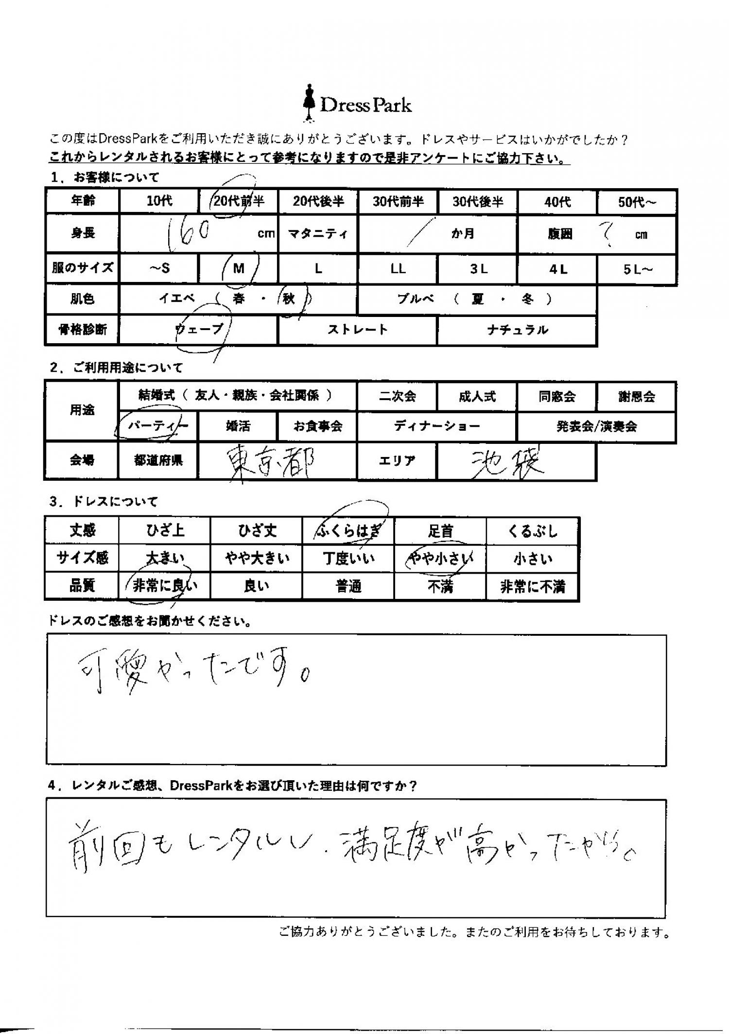 東京都 R.K様160㎝ Mサイズ池袋 #20代#M/L#160~164㎝#パーティー#東京都#池袋 ◆レンタルしたドレスはこちら ◆レンタルしたサイズは:M ◆レンタルした日付:2026/03/01 ドレスの着用感 ◆点数: (5点) ◆丈感:ふくらはぎ ◆サイズ感:やや小さい ◆品質:非常に良い ◆肌色:イエベ ◆骨格診断:ウェーブ ドレスの感想 可愛かったです。 レンタルのご感想、DressParkをお選び頂いた理由 前回もレンタルし満足度が高かったから。 CUSTOMER REVIEWS お客様の声 気になるカテゴリー別にご利用の感想をチェック! ◆AGE 年代で見る 10代 20代 30代 40代 50代~ ◆SIZE サイズで見る SS/S M/L 大きいサイズLL~ ◆HIGHT 身長で見る 140~149㎝ 150~154㎝ 155~159㎝ 160~164㎝ 165~169㎝ 170㎝以上 ◆マタニティ ~3か月 4~6か月 7~8か月 9~10か月 ◆肌色 イエベ ブルべ ◆骨格診断 ウェーブ ストレート ナチュラル ◆利用シーン 結婚式(友人) 結婚式(親族) 結婚式(会社関係) 二次会 成人式/同窓会 謝恩会 パーティー その他 CUSTOMER REVIEWS都道府県別お客様の声 都道府県別にのお客様の声をチェック! 北海道 青森県 岩手県 宮城県 秋田県 山形県 福島県 茨城県 栃木県 群馬県 埼玉県 千葉県 東京都 神奈川県 新潟県 富山県 石川県 福井県 山梨県 長野県 岐阜県 静岡県 愛知県 三重県 滋賀県 京都府 大阪府 兵庫県 奈良県 和歌山県 鳥取県 島根県 岡山県 広島県 山口県 徳島県 香川県 愛媛県 高知県 福岡県 佐賀県 長崎県 熊本県 大分県 宮崎県 鹿児島県 沖縄県 CUSTOMER REVIEWSエリア別お客様の声 都道府県別にのお客様の声をチェック! 札幌 仙台 名古屋 軽井沢 金沢 神戸・芦屋 博多 那覇 梅田・新大阪 難波・心斎橋 鎌倉・湘南 横浜・みなとみらい 舞浜・浦安・幕張 大宮・浦和 青山・表参道 六本木・麻布 渋谷・恵比寿 新宿 池袋 銀座・丸の内 お台場・汐留 鹿児島市 郡山市 福島市 東予 甲府・石和 LINEでお問い合わせ このサイトではJavaScriptを使用しています