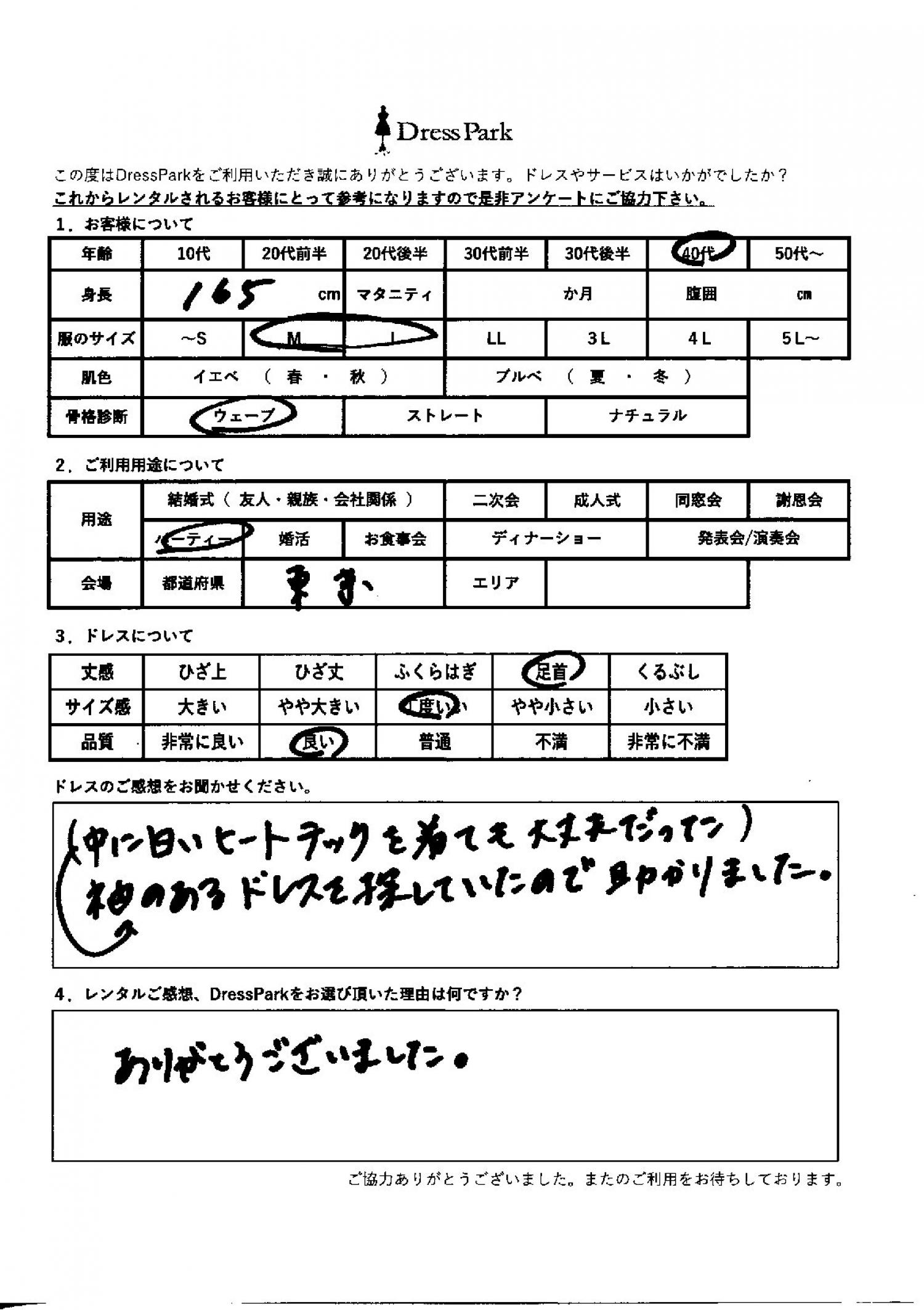 東京都 A.N様165㎝ Lサイズ #40代#M/L#165~169㎝#パーティー#東京都 ◆レンタルしたドレスはこちら ◆レンタルしたサイズは:L ◆レンタルした日付:2026/03/01 ドレスの着用感 ◆点数: (4点) ◆丈感:足首 ◆サイズ感:丁度いい ◆品質:良い ◆骨格診断:ウェーブ ドレスの感想 中に白いヒートテックを着ても大丈夫だった。袖のあるドレスを探していたので助かりました。 レンタルのご感想、DressParkをお選び頂いた理由 ありがとうございました。 CUSTOMER REVIEWS お客様の声 気になるカテゴリー別にご利用の感想をチェック! ◆AGE 年代で見る 10代 20代 30代 40代 50代~ ◆SIZE サイズで見る SS/S M/L 大きいサイズLL~ ◆HIGHT 身長で見る 140~149㎝ 150~154㎝ 155~159㎝ 160~164㎝ 165~169㎝ 170㎝以上 ◆マタニティ ~3か月 4~6か月 7~8か月 9~10か月 ◆肌色 イエベ ブルべ ◆骨格診断 ウェーブ ストレート ナチュラル ◆利用シーン 結婚式(友人) 結婚式(親族) 結婚式(会社関係) 二次会 成人式/同窓会 謝恩会 パーティー その他 CUSTOMER REVIEWS都道府県別お客様の声 都道府県別にのお客様の声をチェック! 北海道 青森県 岩手県 宮城県 秋田県 山形県 福島県 茨城県 栃木県 群馬県 埼玉県 千葉県 東京都 神奈川県 新潟県 富山県 石川県 福井県 山梨県 長野県 岐阜県 静岡県 愛知県 三重県 滋賀県 京都府 大阪府 兵庫県 奈良県 和歌山県 鳥取県 島根県 岡山県 広島県 山口県 徳島県 香川県 愛媛県 高知県 福岡県 佐賀県 長崎県 熊本県 大分県 宮崎県 鹿児島県 沖縄県 CUSTOMER REVIEWSエリア別お客様の声 都道府県別にのお客様の声をチェック! 札幌 仙台 名古屋 軽井沢 金沢 神戸・芦屋 博多 那覇 梅田・新大阪 難波・心斎橋 鎌倉・湘南 横浜・みなとみらい 舞浜・浦安・幕張 大宮・浦和 青山・表参道 六本木・麻布 渋谷・恵比寿 新宿 池袋 銀座・丸の内 お台場・汐留 鹿児島市 郡山市 福島市 東予 甲府・石和 LINEでお問い合わせ このサイトではJavaScriptを使用しています