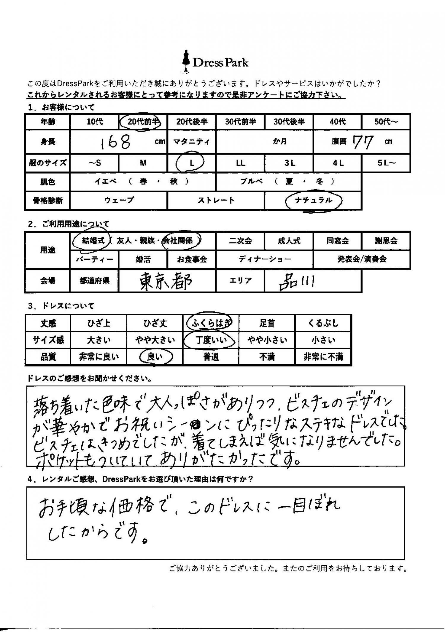 落ち着いた色味で大人っぽさがあり、ビスチェのデザインが華やかでお祝いシーンにぴったりな素敵なドレスでした。ビスチェはきつめでしたが、着てしまえば気になりませんでした。ポケットも付いていてありがたかったです。レンタルのご感想、