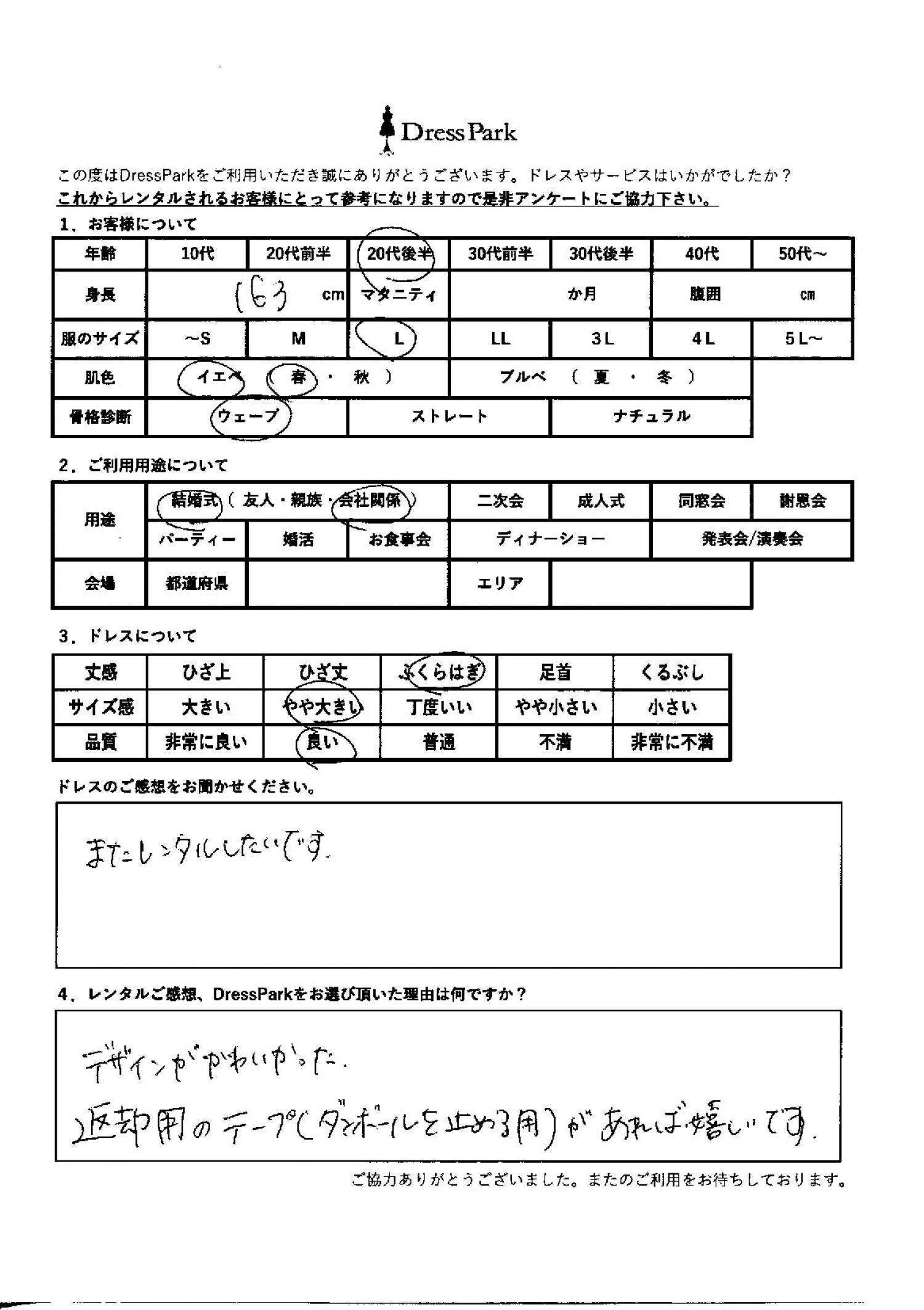 神奈川県 H.T様163㎝ Lサイズ #20代#M/L#160~164㎝#結婚式(会社関係)#神奈川県 ◆レンタルしたドレスはこちら ◆レンタルしたサイズは:L ◆レンタルした日付:2026/03/01 ドレスの着用感 ◆点数: (4点) ◆丈感:ふくらはぎ ◆サイズ感:やや大きい ◆品質:良い ◆肌色:イエベ ◆骨格診断:ウェーブ ドレスの感想 またレンタルしたいです。 レンタルのご感想、DressParkをお選び頂いた理由 デザインが可愛かった。返却用のテープ(段ボールを止める用)があれば嬉しいです。 CUSTOMER REVIEWS お客様の声 気になるカテゴリー別にご利用の感想をチェック! ◆AGE 年代で見る 10代 20代 30代 40代 50代~ ◆SIZE サイズで見る SS/S M/L 大きいサイズLL~ ◆HIGHT 身長で見る 140~149㎝ 150~154㎝ 155~159㎝ 160~164㎝ 165~169㎝ 170㎝以上 ◆マタニティ ~3か月 4~6か月 7~8か月 9~10か月 ◆肌色 イエベ ブルべ ◆骨格診断 ウェーブ ストレート ナチュラル ◆利用シーン 結婚式(友人) 結婚式(親族) 結婚式(会社関係) 二次会 成人式/同窓会 謝恩会 パーティー その他 CUSTOMER REVIEWS都道府県別お客様の声 都道府県別にのお客様の声をチェック! 北海道 青森県 岩手県 宮城県 秋田県 山形県 福島県 茨城県 栃木県 群馬県 埼玉県 千葉県 東京都 神奈川県 新潟県 富山県 石川県 福井県 山梨県 長野県 岐阜県 静岡県 愛知県 三重県 滋賀県 京都府 大阪府 兵庫県 奈良県 和歌山県 鳥取県 島根県 岡山県 広島県 山口県 徳島県 香川県 愛媛県 高知県 福岡県 佐賀県 長崎県 熊本県 大分県 宮崎県 鹿児島県 沖縄県 CUSTOMER REVIEWSエリア別お客様の声 都道府県別にのお客様の声をチェック! 札幌 仙台 名古屋 軽井沢 金沢 神戸・芦屋 博多 那覇 梅田・新大阪 難波・心斎橋 鎌倉・湘南 横浜・みなとみらい 舞浜・浦安・幕張 大宮・浦和 青山・表参道 六本木・麻布 渋谷・恵比寿 新宿 池袋 銀座・丸の内 お台場・汐留 鹿児島市 郡山市 福島市 東予 甲府・石和 LINEでお問い合わせ このサイトではJavaScriptを使用しています