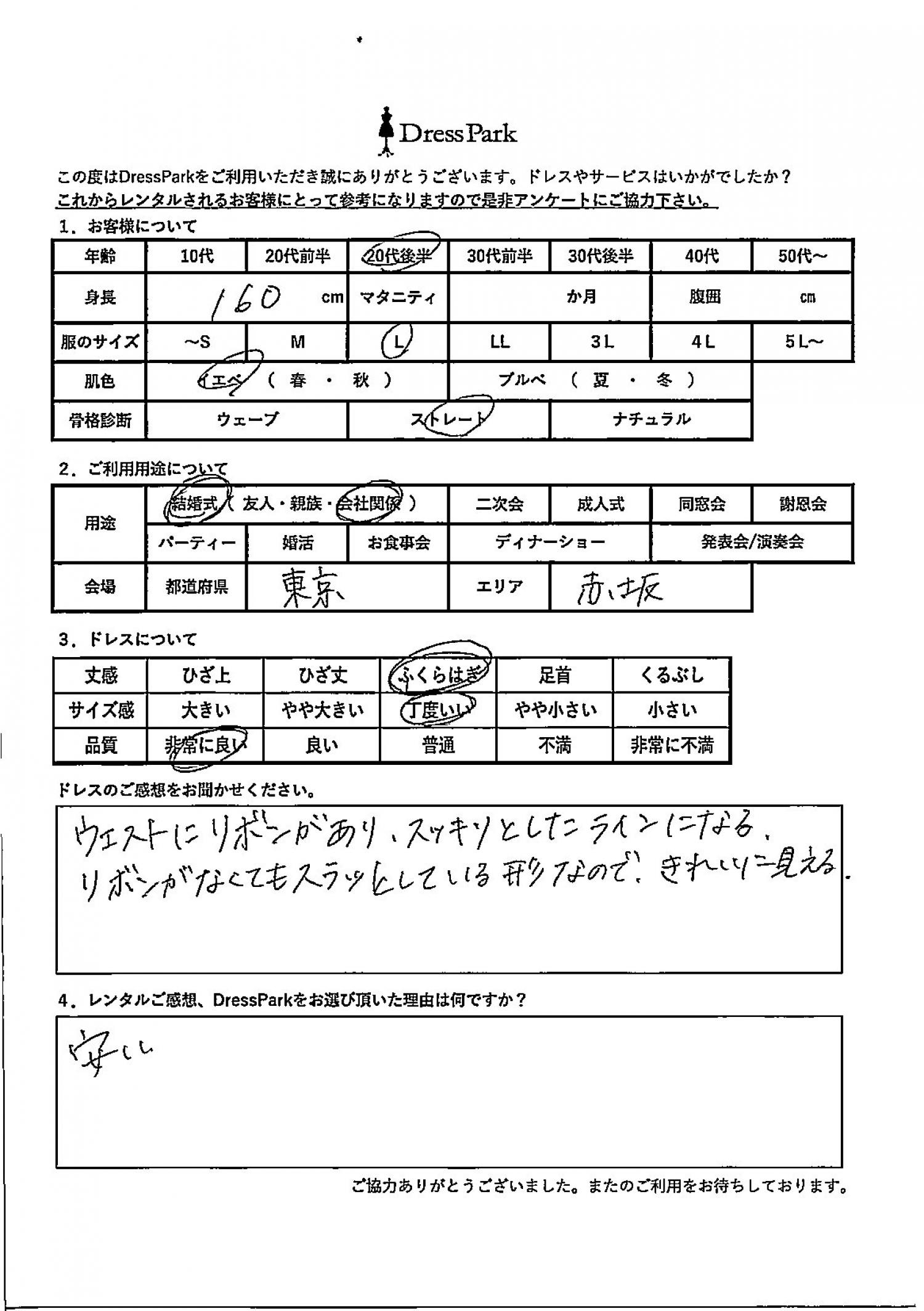 東京都 N.I様160㎝ Lサイズ青山・表参道 #20代#M/L#160~164㎝#結婚式(会社関係)#東京都#青山・表参道 ◆レンタルしたドレスはこちら ◆レンタルしたサイズは:L ◆レンタルした日付:2026/03/08 ドレスの着用感 ◆点数: (5点) ◆丈感:ふくらはぎ ◆サイズ感:丁度いい ◆品質:非常に良い ◆肌色:イエベ ◆骨格診断:ストレート ドレスの感想 ウエストにリボンがあり、スッキリとしたラインになる。 リボンがなくてもスラッとしている形なので、きれいに見える。 レンタルのご感想、DressParkをお選び頂いた理由 安い CUSTOMER REVIEWS お客様の声 気になるカテゴリー別にご利用の感想をチェック! ◆AGE 年代で見る 10代 20代 30代 40代 50代~ ◆SIZE サイズで見る SS/S M/L 大きいサイズLL~ ◆HIGHT 身長で見る 140~149㎝ 150~154㎝ 155~159㎝ 160~164㎝ 165~169㎝ 170㎝以上 ◆マタニティ ~3か月 4~6か月 7~8か月 9~10か月 ◆肌色 イエベ ブルべ ◆骨格診断 ウェーブ ストレート ナチュラル ◆利用シーン 結婚式(友人) 結婚式(親族) 結婚式(会社関係) 二次会 成人式/同窓会 謝恩会 パーティー その他 CUSTOMER REVIEWS都道府県別お客様の声 都道府県別にのお客様の声をチェック! 北海道 青森県 岩手県 宮城県 秋田県 山形県 福島県 茨城県 栃木県 群馬県 埼玉県 千葉県 東京都 神奈川県 新潟県 富山県 石川県 福井県 山梨県 長野県 岐阜県 静岡県 愛知県 三重県 滋賀県 京都府 大阪府 兵庫県 奈良県 和歌山県 鳥取県 島根県 岡山県 広島県 山口県 徳島県 香川県 愛媛県 高知県 福岡県 佐賀県 長崎県 熊本県 大分県 宮崎県 鹿児島県 沖縄県 CUSTOMER REVIEWSエリア別お客様の声 都道府県別にのお客様の声をチェック! 札幌 仙台 名古屋 軽井沢 金沢 神戸・芦屋 博多 那覇 梅田・新大阪 難波・心斎橋 鎌倉・湘南 横浜・みなとみらい 舞浜・浦安・幕張 大宮・浦和 青山・表参道 六本木・麻布 渋谷・恵比寿 新宿 池袋 銀座・丸の内 お台場・汐留 鹿児島市 郡山市 福島市 東予 甲府・石和 LINEでお問い合わせ このサイトではJavaScriptを使用しています