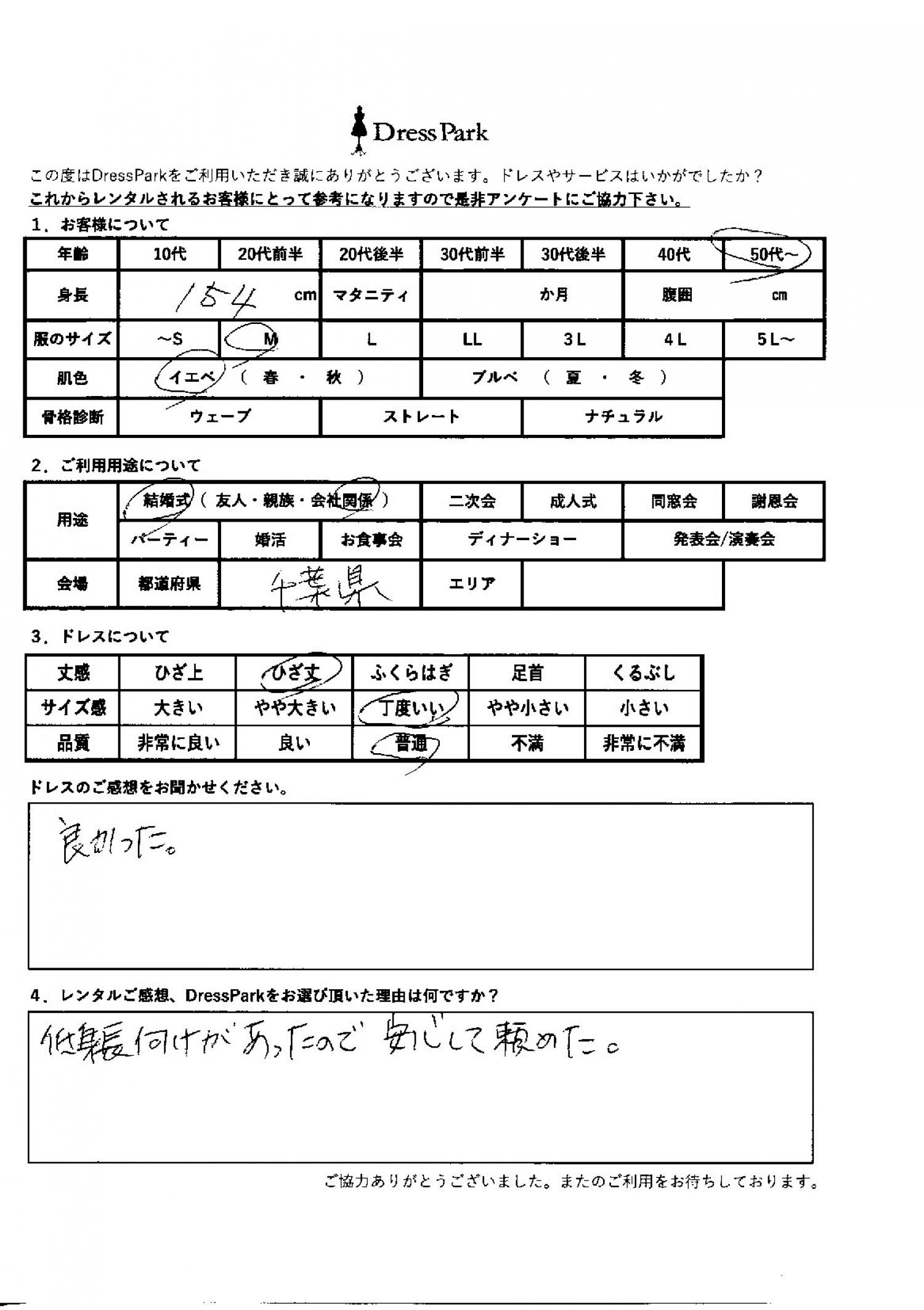 千葉県 H.I様154㎝ Mサイズ #50代~#M/L#150~154㎝#結婚式(会社関係)#千葉県 ◆レンタルしたドレスはこちら ◆レンタルしたサイズは:M ◆レンタルした日付:2026/03/07 ドレスの着用感 ◆点数: (4点) ◆丈感:ひざ丈 ◆サイズ感:丁度いい ◆品質:普通 ◆肌色:イエベ ドレスの感想 よかった。 レンタルのご感想、DressParkをお選び頂いた理由 低身長向けがあったので、安心して頼めた。 CUSTOMER REVIEWS お客様の声 気になるカテゴリー別にご利用の感想をチェック! ◆AGE 年代で見る 10代 20代 30代 40代 50代~ ◆SIZE サイズで見る SS/S M/L 大きいサイズLL~ ◆HIGHT 身長で見る 140~149㎝ 150~154㎝ 155~159㎝ 160~164㎝ 165~169㎝ 170㎝以上 ◆マタニティ ~3か月 4~6か月 7~8か月 9~10か月 ◆肌色 イエベ ブルべ ◆骨格診断 ウェーブ ストレート ナチュラル ◆利用シーン 結婚式(友人) 結婚式(親族) 結婚式(会社関係) 二次会 成人式/同窓会 謝恩会 パーティー その他 CUSTOMER REVIEWS都道府県別お客様の声 都道府県別にのお客様の声をチェック! 北海道 青森県 岩手県 宮城県 秋田県 山形県 福島県 茨城県 栃木県 群馬県 埼玉県 千葉県 東京都 神奈川県 新潟県 富山県 石川県 福井県 山梨県 長野県 岐阜県 静岡県 愛知県 三重県 滋賀県 京都府 大阪府 兵庫県 奈良県 和歌山県 鳥取県 島根県 岡山県 広島県 山口県 徳島県 香川県 愛媛県 高知県 福岡県 佐賀県 長崎県 熊本県 大分県 宮崎県 鹿児島県 沖縄県 CUSTOMER REVIEWSエリア別お客様の声 都道府県別にのお客様の声をチェック! 札幌 仙台 名古屋 軽井沢 金沢 神戸・芦屋 博多 那覇 梅田・新大阪 難波・心斎橋 鎌倉・湘南 横浜・みなとみらい 舞浜・浦安・幕張 大宮・浦和 青山・表参道 六本木・麻布 渋谷・恵比寿 新宿 池袋 銀座・丸の内 お台場・汐留 鹿児島市 郡山市 福島市 東予 甲府・石和 LINEでお問い合わせ このサイトではJavaScriptを使用しています