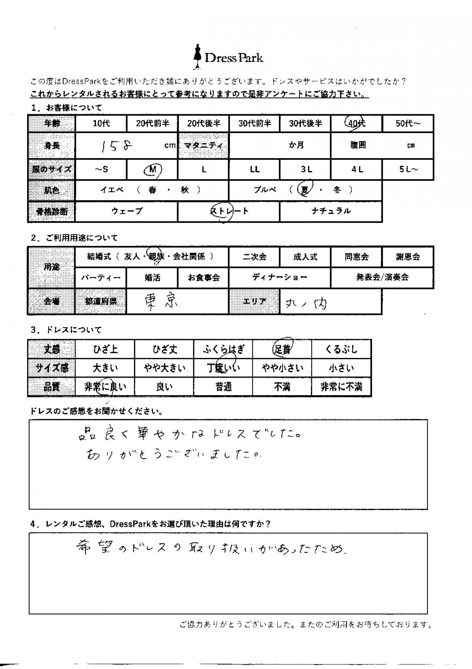 東京都 K.S様158㎝ Mサイズ銀座・丸の内 #40代#M/L#155~159㎝#結婚式(親族)#東京都#銀座・丸の内 ◆レンタルしたドレスはこちら ◆レンタルしたサイズは:M ◆レンタルした日付:2026/03/07 ドレスの着用感 ◆点数: (5点) ◆丈感:足首 ◆サイズ感:丁度いい ◆品質:非常に良い ◆肌色:ブルべ ◆骨格診断:ストレート ドレスの感想 品良く華やかなドレスでした。ありがとうございました。 レンタルのご感想、DressParkをお選び頂いた理由 希望のドレスの取り扱いがあったため。 CUSTOMER REVIEWS お客様の声 気になるカテゴリー別にご利用の感想をチェック! ◆AGE 年代で見る 10代 20代 30代 40代 50代~ ◆SIZE サイズで見る SS/S M/L 大きいサイズLL~ ◆HIGHT 身長で見る 140~149㎝ 150~154㎝ 155~159㎝ 160~164㎝ 165~169㎝ 170㎝以上 ◆マタニティ ~3か月 4~6か月 7~8か月 9~10か月 ◆肌色 イエベ ブルべ ◆骨格診断 ウェーブ ストレート ナチュラル ◆利用シーン 結婚式(友人) 結婚式(親族) 結婚式(会社関係) 二次会 成人式/同窓会 謝恩会 パーティー その他 CUSTOMER REVIEWS都道府県別お客様の声 都道府県別にのお客様の声をチェック! 北海道 青森県 岩手県 宮城県 秋田県 山形県 福島県 茨城県 栃木県 群馬県 埼玉県 千葉県 東京都 神奈川県 新潟県 富山県 石川県 福井県 山梨県 長野県 岐阜県 静岡県 愛知県 三重県 滋賀県 京都府 大阪府 兵庫県 奈良県 和歌山県 鳥取県 島根県 岡山県 広島県 山口県 徳島県 香川県 愛媛県 高知県 福岡県 佐賀県 長崎県 熊本県 大分県 宮崎県 鹿児島県 沖縄県 CUSTOMER REVIEWSエリア別お客様の声 都道府県別にのお客様の声をチェック! 札幌 仙台 名古屋 軽井沢 金沢 神戸・芦屋 博多 那覇 梅田・新大阪 難波・心斎橋 鎌倉・湘南 横浜・みなとみらい 舞浜・浦安・幕張 大宮・浦和 青山・表参道 六本木・麻布 渋谷・恵比寿 新宿 池袋 銀座・丸の内 お台場・汐留 鹿児島市 郡山市 福島市 東予 甲府・石和 LINEでお問い合わせ このサイトではJavaScriptを使用しています