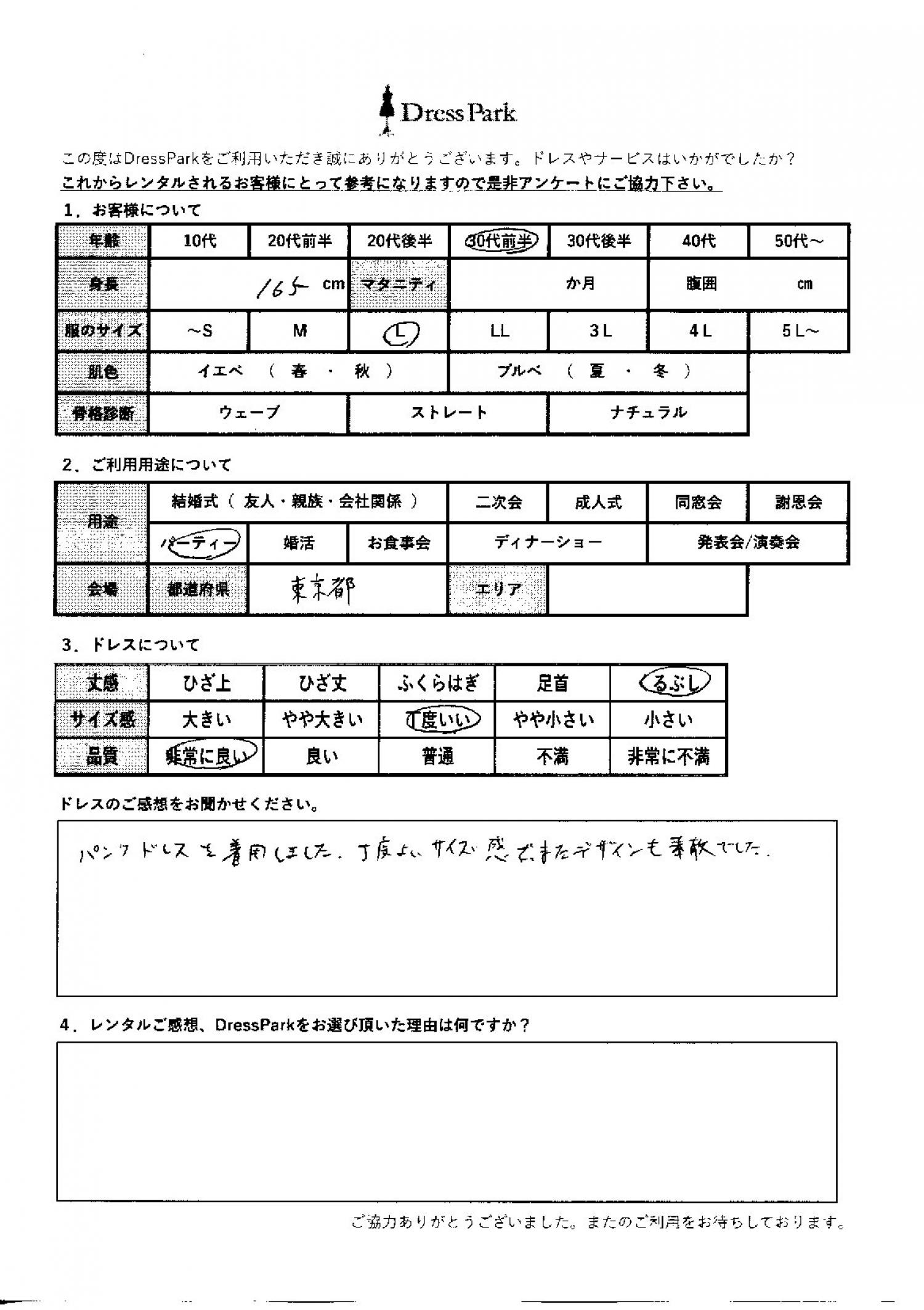 東京都 H.S様165㎝ Lサイズ #30代#M/L#165~169㎝#パーティー#東京都 ◆レンタルしたドレスはこちら ◆レンタルしたサイズは:L ◆レンタルした日付:202w6/03/07 ドレスの着用感 ◆点数: (5点) ◆丈感:くるぶし ◆サイズ感:丁度いい ◆品質:非常に良い ドレスの感想 パンツドレスを着用しました。ちょうど良いサイズ感で、また、デザインも素敵でした。 CUSTOMER REVIEWS お客様の声 気になるカテゴリー別にご利用の感想をチェック! ◆AGE 年代で見る 10代 20代 30代 40代 50代~ ◆SIZE サイズで見る SS/S M/L 大きいサイズLL~ ◆HIGHT 身長で見る 140~149㎝ 150~154㎝ 155~159㎝ 160~164㎝ 165~169㎝ 170㎝以上 ◆マタニティ ~3か月 4~6か月 7~8か月 9~10か月 ◆肌色 イエベ ブルべ ◆骨格診断 ウェーブ ストレート ナチュラル ◆利用シーン 結婚式(友人) 結婚式(親族) 結婚式(会社関係) 二次会 成人式/同窓会 謝恩会 パーティー その他 CUSTOMER REVIEWS都道府県別お客様の声 都道府県別にのお客様の声をチェック! 北海道 青森県 岩手県 宮城県 秋田県 山形県 福島県 茨城県 栃木県 群馬県 埼玉県 千葉県 東京都 神奈川県 新潟県 富山県 石川県 福井県 山梨県 長野県 岐阜県 静岡県 愛知県 三重県 滋賀県 京都府 大阪府 兵庫県 奈良県 和歌山県 鳥取県 島根県 岡山県 広島県 山口県 徳島県 香川県 愛媛県 高知県 福岡県 佐賀県 長崎県 熊本県 大分県 宮崎県 鹿児島県 沖縄県 CUSTOMER REVIEWSエリア別お客様の声 都道府県別にのお客様の声をチェック! 札幌 仙台 名古屋 軽井沢 金沢 神戸・芦屋 博多 那覇 梅田・新大阪 難波・心斎橋 鎌倉・湘南 横浜・みなとみらい 舞浜・浦安・幕張 大宮・浦和 青山・表参道 六本木・麻布 渋谷・恵比寿 新宿 池袋 銀座・丸の内 お台場・汐留 鹿児島市 郡山市 福島市 東予 甲府・石和 LINEでお問い合わせ このサイトではJavaScriptを使用しています