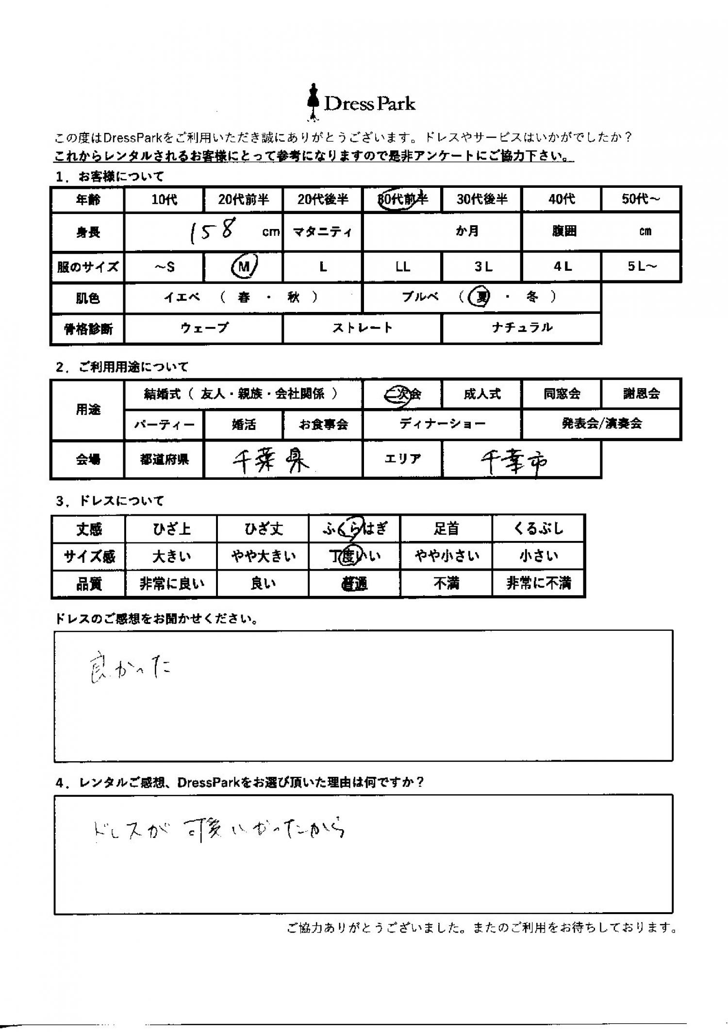 千葉県 M.M様158㎝ Mサイズ #30代#M/L#155~159㎝#二次会#千葉県 ◆レンタルしたドレスはこちら ◆レンタルしたサイズは:M ◆レンタルした日付:2026/03/04 ドレスの着用感 ◆点数: (4点) ◆丈感:ふくらはぎ ◆サイズ感:丁度いい ◆品質:普通 ◆肌色:ブルべ ドレスの感想 よかった。 レンタルのご感想、DressParkをお選び頂いた理由 ドレスが可愛かったから。 CUSTOMER REVIEWS お客様の声 気になるカテゴリー別にご利用の感想をチェック! ◆AGE 年代で見る 10代 20代 30代 40代 50代~ ◆SIZE サイズで見る SS/S M/L 大きいサイズLL~ ◆HIGHT 身長で見る 140~149㎝ 150~154㎝ 155~159㎝ 160~164㎝ 165~169㎝ 170㎝以上 ◆マタニティ ~3か月 4~6か月 7~8か月 9~10か月 ◆肌色 イエベ ブルべ ◆骨格診断 ウェーブ ストレート ナチュラル ◆利用シーン 結婚式(友人) 結婚式(親族) 結婚式(会社関係) 二次会 成人式/同窓会 謝恩会 パーティー その他 CUSTOMER REVIEWS都道府県別お客様の声 都道府県別にのお客様の声をチェック! 北海道 青森県 岩手県 宮城県 秋田県 山形県 福島県 茨城県 栃木県 群馬県 埼玉県 千葉県 東京都 神奈川県 新潟県 富山県 石川県 福井県 山梨県 長野県 岐阜県 静岡県 愛知県 三重県 滋賀県 京都府 大阪府 兵庫県 奈良県 和歌山県 鳥取県 島根県 岡山県 広島県 山口県 徳島県 香川県 愛媛県 高知県 福岡県 佐賀県 長崎県 熊本県 大分県 宮崎県 鹿児島県 沖縄県 CUSTOMER REVIEWSエリア別お客様の声 都道府県別にのお客様の声をチェック! 札幌 仙台 名古屋 軽井沢 金沢 神戸・芦屋 博多 那覇 梅田・新大阪 難波・心斎橋 鎌倉・湘南 横浜・みなとみらい 舞浜・浦安・幕張 大宮・浦和 青山・表参道 六本木・麻布 渋谷・恵比寿 新宿 池袋 銀座・丸の内 お台場・汐留 鹿児島市 郡山市 福島市 東予 甲府・石和 LINEでお問い合わせ このサイトではJavaScriptを使用しています