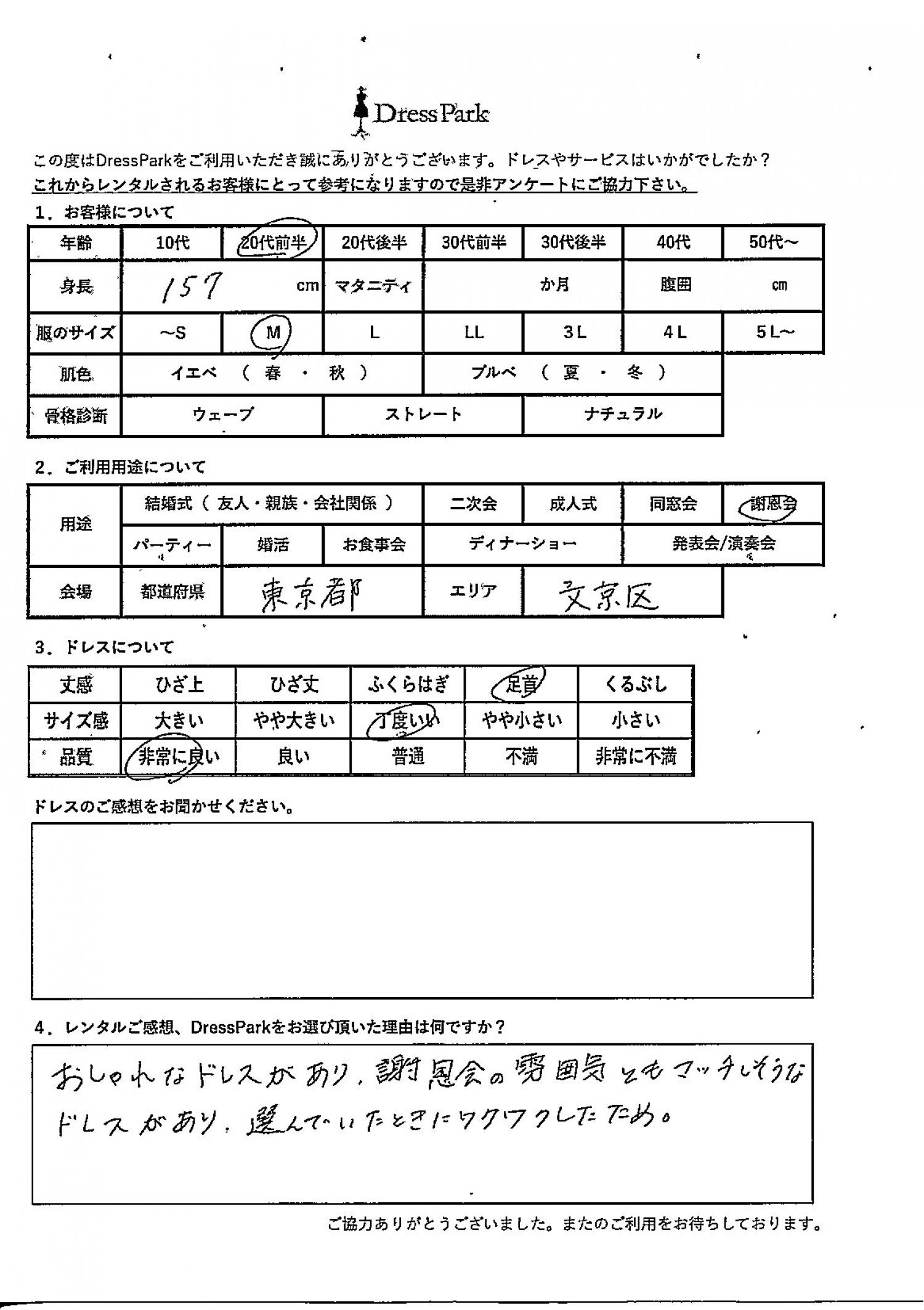 東京都 M.S様157㎝ Mサイズ #20代#M/L#155~159㎝#謝恩会#東京都 ◆レンタルしたドレスはこちら ◆レンタルしたサイズは:M ◆レンタルした日付:2026/03/06 ドレスの着用感 ◆点数: (5点) ◆丈感:足首 ◆サイズ感:丁度いい ◆品質:非常に良い レンタルのご感想、DressParkをお選び頂いた理由 おしゃれなドレスがあり謝恩会の雰囲気ともマッチしそうなドレスがあり、選んでいたときにワクワクしたため。 CUSTOMER REVIEWS お客様の声 気になるカテゴリー別にご利用の感想をチェック! ◆AGE 年代で見る 10代 20代 30代 40代 50代~ ◆SIZE サイズで見る SS/S M/L 大きいサイズLL~ ◆HIGHT 身長で見る 140~149㎝ 150~154㎝ 155~159㎝ 160~164㎝ 165~169㎝ 170㎝以上 ◆マタニティ ~3か月 4~6か月 7~8か月 9~10か月 ◆肌色 イエベ ブルべ ◆骨格診断 ウェーブ ストレート ナチュラル ◆利用シーン 結婚式(友人) 結婚式(親族) 結婚式(会社関係) 二次会 成人式/同窓会 謝恩会 パーティー その他 CUSTOMER REVIEWS都道府県別お客様の声 都道府県別にのお客様の声をチェック! 北海道 青森県 岩手県 宮城県 秋田県 山形県 福島県 茨城県 栃木県 群馬県 埼玉県 千葉県 東京都 神奈川県 新潟県 富山県 石川県 福井県 山梨県 長野県 岐阜県 静岡県 愛知県 三重県 滋賀県 京都府 大阪府 兵庫県 奈良県 和歌山県 鳥取県 島根県 岡山県 広島県 山口県 徳島県 香川県 愛媛県 高知県 福岡県 佐賀県 長崎県 熊本県 大分県 宮崎県 鹿児島県 沖縄県 CUSTOMER REVIEWSエリア別お客様の声 都道府県別にのお客様の声をチェック! 札幌 仙台 名古屋 軽井沢 金沢 神戸・芦屋 博多 那覇 梅田・新大阪 難波・心斎橋 鎌倉・湘南 横浜・みなとみらい 舞浜・浦安・幕張 大宮・浦和 青山・表参道 六本木・麻布 渋谷・恵比寿 新宿 池袋 銀座・丸の内 お台場・汐留 鹿児島市 郡山市 福島市 東予 甲府・石和 LINEでお問い合わせ このサイトではJavaScriptを使用しています