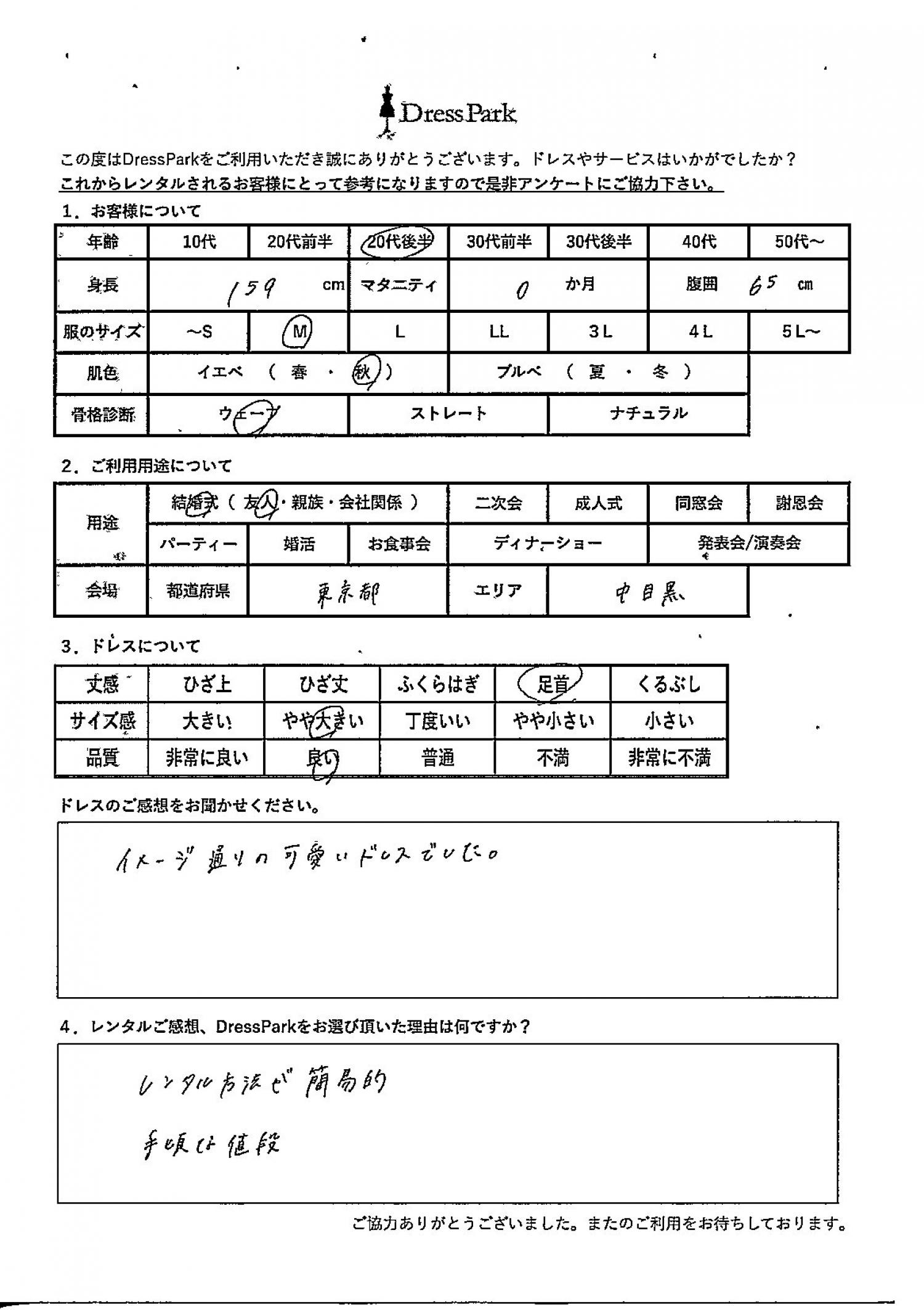 東京都 A.H様159㎝ Mサイズ #20代#M/L#155~159㎝#結婚式(友人)#東京都 ◆レンタルしたドレスはこちら ◆レンタルしたサイズは:M ◆レンタルした日付:2026/03/07 ドレスの着用感 ◆点数: (4点) ◆丈感:足首 ◆サイズ感:やや大きい ◆品質:良い ◆肌色:イエベ ◆骨格診断:ウェーブ ドレスの感想 イメージ通りの可愛いドレスでした。 レンタルのご感想、DressParkをお選び頂いた理由 レンタル方法が簡易的 手頃な値段 CUSTOMER REVIEWS お客様の声 気になるカテゴリー別にご利用の感想をチェック! ◆AGE 年代で見る 10代 20代 30代 40代 50代~ ◆SIZE サイズで見る SS/S M/L 大きいサイズLL~ ◆HIGHT 身長で見る 140~149㎝ 150~154㎝ 155~159㎝ 160~164㎝ 165~169㎝ 170㎝以上 ◆マタニティ ~3か月 4~6か月 7~8か月 9~10か月 ◆肌色 イエベ ブルべ ◆骨格診断 ウェーブ ストレート ナチュラル ◆利用シーン 結婚式(友人) 結婚式(親族) 結婚式(会社関係) 二次会 成人式/同窓会 謝恩会 パーティー その他 CUSTOMER REVIEWS都道府県別お客様の声 都道府県別にのお客様の声をチェック! 北海道 青森県 岩手県 宮城県 秋田県 山形県 福島県 茨城県 栃木県 群馬県 埼玉県 千葉県 東京都 神奈川県 新潟県 富山県 石川県 福井県 山梨県 長野県 岐阜県 静岡県 愛知県 三重県 滋賀県 京都府 大阪府 兵庫県 奈良県 和歌山県 鳥取県 島根県 岡山県 広島県 山口県 徳島県 香川県 愛媛県 高知県 福岡県 佐賀県 長崎県 熊本県 大分県 宮崎県 鹿児島県 沖縄県 CUSTOMER REVIEWSエリア別お客様の声 都道府県別にのお客様の声をチェック! 札幌 仙台 名古屋 軽井沢 金沢 神戸・芦屋 博多 那覇 梅田・新大阪 難波・心斎橋 鎌倉・湘南 横浜・みなとみらい 舞浜・浦安・幕張 大宮・浦和 青山・表参道 六本木・麻布 渋谷・恵比寿 新宿 池袋 銀座・丸の内 お台場・汐留 鹿児島市 郡山市 福島市 東予 甲府・石和 LINEでお問い合わせ このサイトではJavaScriptを使用しています