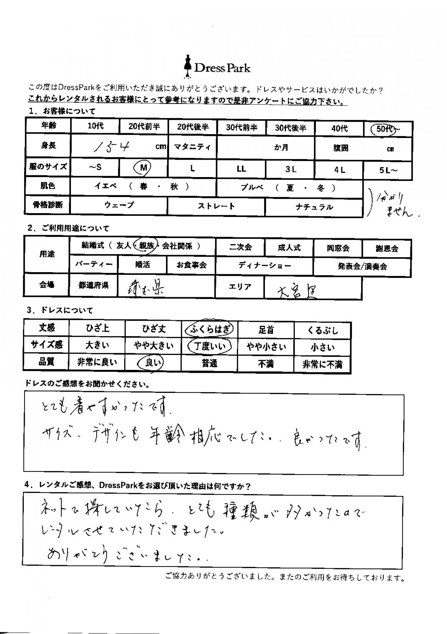 埼玉県 M.H様154㎝ Mサイズ大宮・浦和 #50代~#M/L#150~154㎝#結婚式(親族)#埼玉県#大宮・浦和 ◆レンタルしたドレスはこちら ◆レンタルしたサイズは:M ◆レンタルした日付:2026/03/08 ドレスの着用感 ◆点数: (4点) ◆丈感:ふくらはぎ ◆サイズ感:丁度いい ◆品質:良い ドレスの感想 とてもきやすかったです。サイズ、デザイン年齢相応でした。よかったです。 レンタルのご感想、DressParkをお選び頂いた理由 ネットで探していたら、とても種類が多かったので、レンタルさせていただきました。ありがとうございました。 CUSTOMER REVIEWS お客様の声 気になるカテゴリー別にご利用の感想をチェック! ◆AGE 年代で見る 10代 20代 30代 40代 50代~ ◆SIZE サイズで見る SS/S M/L 大きいサイズLL~ ◆HIGHT 身長で見る 140~149㎝ 150~154㎝ 155~159㎝ 160~164㎝ 165~169㎝ 170㎝以上 ◆マタニティ ~3か月 4~6か月 7~8か月 9~10か月 ◆肌色 イエベ ブルべ ◆骨格診断 ウェーブ ストレート ナチュラル ◆利用シーン 結婚式(友人) 結婚式(親族) 結婚式(会社関係) 二次会 成人式/同窓会 謝恩会 パーティー その他 CUSTOMER REVIEWS都道府県別お客様の声 都道府県別にのお客様の声をチェック! 北海道 青森県 岩手県 宮城県 秋田県 山形県 福島県 茨城県 栃木県 群馬県 埼玉県 千葉県 東京都 神奈川県 新潟県 富山県 石川県 福井県 山梨県 長野県 岐阜県 静岡県 愛知県 三重県 滋賀県 京都府 大阪府 兵庫県 奈良県 和歌山県 鳥取県 島根県 岡山県 広島県 山口県 徳島県 香川県 愛媛県 高知県 福岡県 佐賀県 長崎県 熊本県 大分県 宮崎県 鹿児島県 沖縄県 CUSTOMER REVIEWSエリア別お客様の声 都道府県別にのお客様の声をチェック! 札幌 仙台 名古屋 軽井沢 金沢 神戸・芦屋 博多 那覇 梅田・新大阪 難波・心斎橋 鎌倉・湘南 横浜・みなとみらい 舞浜・浦安・幕張 大宮・浦和 青山・表参道 六本木・麻布 渋谷・恵比寿 新宿 池袋 銀座・丸の内 お台場・汐留 鹿児島市 郡山市 福島市 東予 甲府・石和 LINEでお問い合わせ このサイトではJavaScriptを使用しています