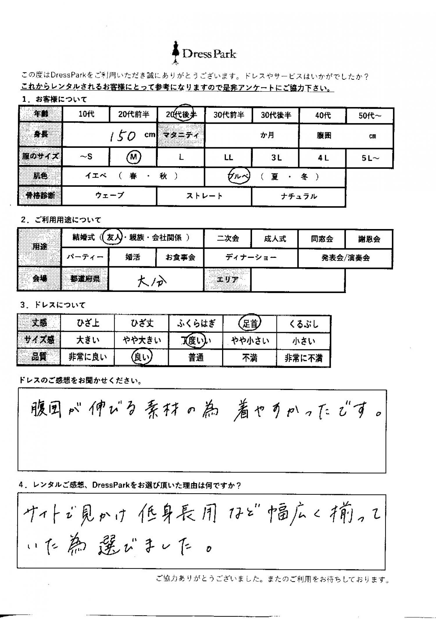 大分県 A.F様150㎝ Mサイズ #20代#M/L#150~154㎝#結婚式(友人)#大分県 ◆レンタルしたドレスはこちら ◆レンタルしたサイズは:M ◆レンタルした日付:2026/03/07 ドレスの着用感 ◆点数: (4点) ◆丈感:足首 ◆サイズ感:丁度いい ◆品質:良い ◆肌色:ブルべ ドレスの感想 腹囲が伸びる素材のため着やすかったです。 レンタルのご感想、DressParkをお選び頂いた理由 サイトで見かけて、低身長用など幅広く揃っていたため選びました。 CUSTOMER REVIEWS お客様の声 気になるカテゴリー別にご利用の感想をチェック! ◆AGE 年代で見る 10代 20代 30代 40代 50代~ ◆SIZE サイズで見る SS/S M/L 大きいサイズLL~ ◆HIGHT 身長で見る 140~149㎝ 150~154㎝ 155~159㎝ 160~164㎝ 165~169㎝ 170㎝以上 ◆マタニティ ~3か月 4~6か月 7~8か月 9~10か月 ◆肌色 イエベ ブルべ ◆骨格診断 ウェーブ ストレート ナチュラル ◆利用シーン 結婚式(友人) 結婚式(親族) 結婚式(会社関係) 二次会 成人式/同窓会 謝恩会 パーティー その他 CUSTOMER REVIEWS都道府県別お客様の声 都道府県別にのお客様の声をチェック! 北海道 青森県 岩手県 宮城県 秋田県 山形県 福島県 茨城県 栃木県 群馬県 埼玉県 千葉県 東京都 神奈川県 新潟県 富山県 石川県 福井県 山梨県 長野県 岐阜県 静岡県 愛知県 三重県 滋賀県 京都府 大阪府 兵庫県 奈良県 和歌山県 鳥取県 島根県 岡山県 広島県 山口県 徳島県 香川県 愛媛県 高知県 福岡県 佐賀県 長崎県 熊本県 大分県 宮崎県 鹿児島県 沖縄県 CUSTOMER REVIEWSエリア別お客様の声 都道府県別にのお客様の声をチェック! 札幌 仙台 名古屋 軽井沢 金沢 神戸・芦屋 博多 那覇 梅田・新大阪 難波・心斎橋 鎌倉・湘南 横浜・みなとみらい 舞浜・浦安・幕張 大宮・浦和 青山・表参道 六本木・麻布 渋谷・恵比寿 新宿 池袋 銀座・丸の内 お台場・汐留 鹿児島市 郡山市 福島市 東予 甲府・石和 LINEでお問い合わせ このサイトではJavaScriptを使用しています