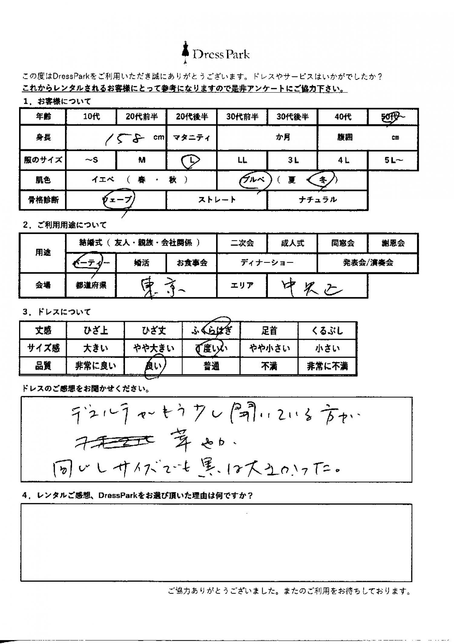 東京都 M.S様158㎝ Lサイズ銀座・丸の内 #50代~#M/L#155~159㎝#パーティー#東京都#銀座・丸の内 ◆レンタルしたドレスはこちら ◆レンタルしたサイズは:L ◆レンタルした日付:2026/03/08 ドレスの着用感 ◆点数: (4点) ◆丈感:ふくらはぎ ◆サイズ感:丁度いい ◆品質:良い ◆肌色:ブルべ ◆骨格診断:ウェーブ ドレスの感想 デコルテがもう少し空いている方が華やか。同じLサイズでも黒(DDP030505)は大きかった。 CUSTOMER REVIEWS お客様の声 気になるカテゴリー別にご利用の感想をチェック! ◆AGE 年代で見る 10代 20代 30代 40代 50代~ ◆SIZE サイズで見る SS/S M/L 大きいサイズLL~ ◆HIGHT 身長で見る 140~149㎝ 150~154㎝ 155~159㎝ 160~164㎝ 165~169㎝ 170㎝以上 ◆マタニティ ~3か月 4~6か月 7~8か月 9~10か月 ◆肌色 イエベ ブルべ ◆骨格診断 ウェーブ ストレート ナチュラル ◆利用シーン 結婚式(友人) 結婚式(親族) 結婚式(会社関係) 二次会 成人式/同窓会 謝恩会 パーティー その他 CUSTOMER REVIEWS都道府県別お客様の声 都道府県別にのお客様の声をチェック! 北海道 青森県 岩手県 宮城県 秋田県 山形県 福島県 茨城県 栃木県 群馬県 埼玉県 千葉県 東京都 神奈川県 新潟県 富山県 石川県 福井県 山梨県 長野県 岐阜県 静岡県 愛知県 三重県 滋賀県 京都府 大阪府 兵庫県 奈良県 和歌山県 鳥取県 島根県 岡山県 広島県 山口県 徳島県 香川県 愛媛県 高知県 福岡県 佐賀県 長崎県 熊本県 大分県 宮崎県 鹿児島県 沖縄県 CUSTOMER REVIEWSエリア別お客様の声 都道府県別にのお客様の声をチェック! 札幌 仙台 名古屋 軽井沢 金沢 神戸・芦屋 博多 那覇 梅田・新大阪 難波・心斎橋 鎌倉・湘南 横浜・みなとみらい 舞浜・浦安・幕張 大宮・浦和 青山・表参道 六本木・麻布 渋谷・恵比寿 新宿 池袋 銀座・丸の内 お台場・汐留 鹿児島市 郡山市 福島市 東予 甲府・石和 LINEでお問い合わせ このサイトではJavaScriptを使用しています