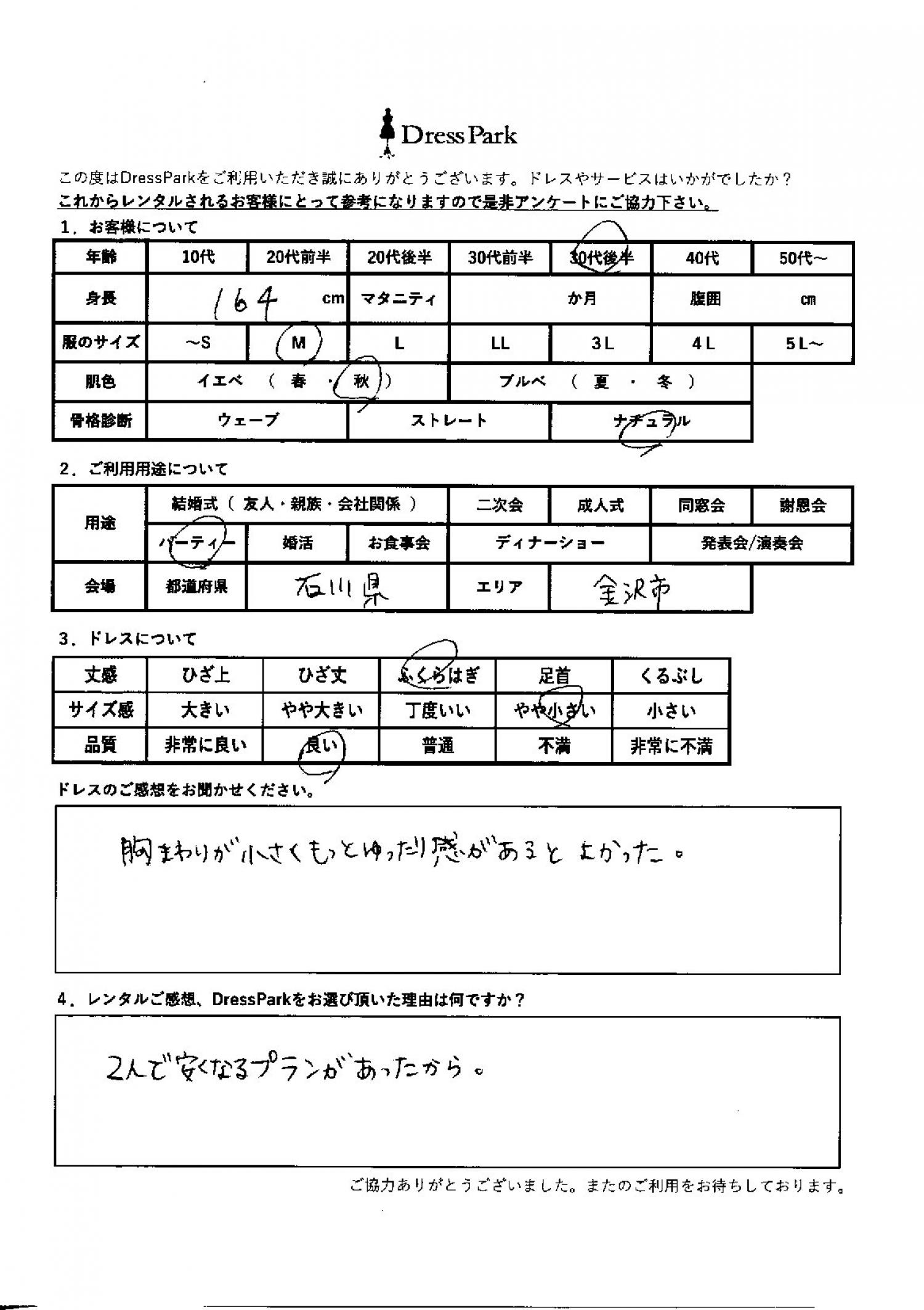 石川県 M.K様164㎝ Mサイズ金沢 #30代#M/L#160~164㎝#パーティー#石川県#金沢 ◆レンタルしたドレスはこちら ◆レンタルしたサイズは:M ◆レンタルした日付:2026/03/08 ドレスの着用感 ◆点数: (4点) ◆丈感:ふくらはぎ ◆サイズ感:やや小さい ◆品質:良い ◆肌色:イエベ ◆骨格診断:ナチュラル ドレスの感想 胸周りが小さくもっとゆったり感があるとよかった。 レンタルのご感想、DressParkをお選び頂いた理由 2人で安くなるプランがあったから。 CUSTOMER REVIEWS お客様の声 気になるカテゴリー別にご利用の感想をチェック! ◆AGE 年代で見る 10代 20代 30代 40代 50代~ ◆SIZE サイズで見る SS/S M/L 大きいサイズLL~ ◆HIGHT 身長で見る 140~149㎝ 150~154㎝ 155~159㎝ 160~164㎝ 165~169㎝ 170㎝以上 ◆マタニティ ~3か月 4~6か月 7~8か月 9~10か月 ◆肌色 イエベ ブルべ ◆骨格診断 ウェーブ ストレート ナチュラル ◆利用シーン 結婚式(友人) 結婚式(親族) 結婚式(会社関係) 二次会 成人式/同窓会 謝恩会 パーティー その他 CUSTOMER REVIEWS都道府県別お客様の声 都道府県別にのお客様の声をチェック! 北海道 青森県 岩手県 宮城県 秋田県 山形県 福島県 茨城県 栃木県 群馬県 埼玉県 千葉県 東京都 神奈川県 新潟県 富山県 石川県 福井県 山梨県 長野県 岐阜県 静岡県 愛知県 三重県 滋賀県 京都府 大阪府 兵庫県 奈良県 和歌山県 鳥取県 島根県 岡山県 広島県 山口県 徳島県 香川県 愛媛県 高知県 福岡県 佐賀県 長崎県 熊本県 大分県 宮崎県 鹿児島県 沖縄県 CUSTOMER REVIEWSエリア別お客様の声 都道府県別にのお客様の声をチェック! 札幌 仙台 名古屋 軽井沢 金沢 神戸・芦屋 博多 那覇 梅田・新大阪 難波・心斎橋 鎌倉・湘南 横浜・みなとみらい 舞浜・浦安・幕張 大宮・浦和 青山・表参道 六本木・麻布 渋谷・恵比寿 新宿 池袋 銀座・丸の内 お台場・汐留 鹿児島市 郡山市 福島市 東予 甲府・石和 LINEでお問い合わせ このサイトではJavaScriptを使用しています